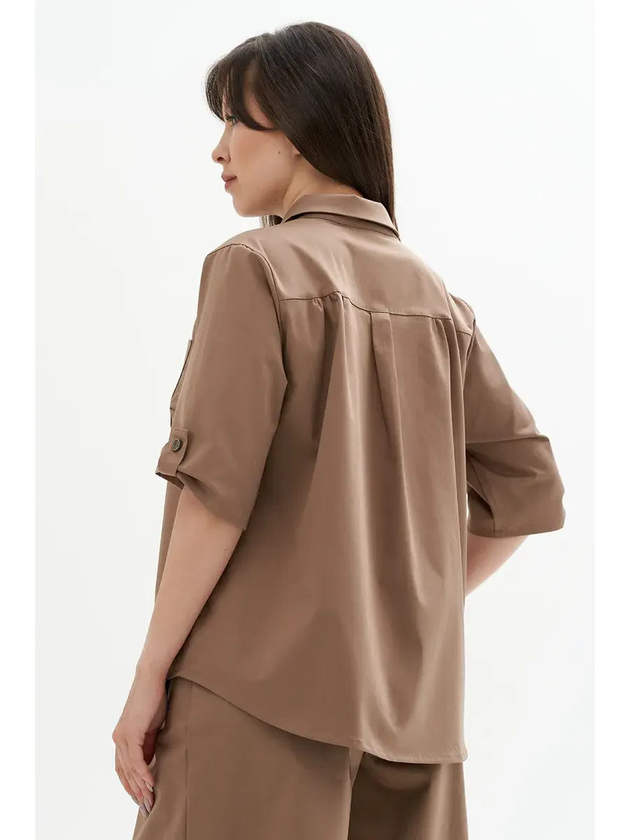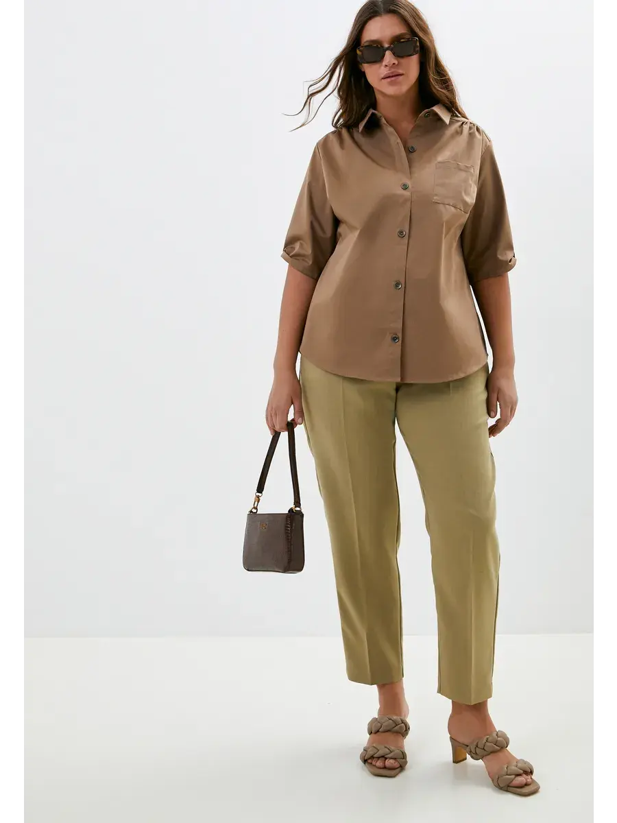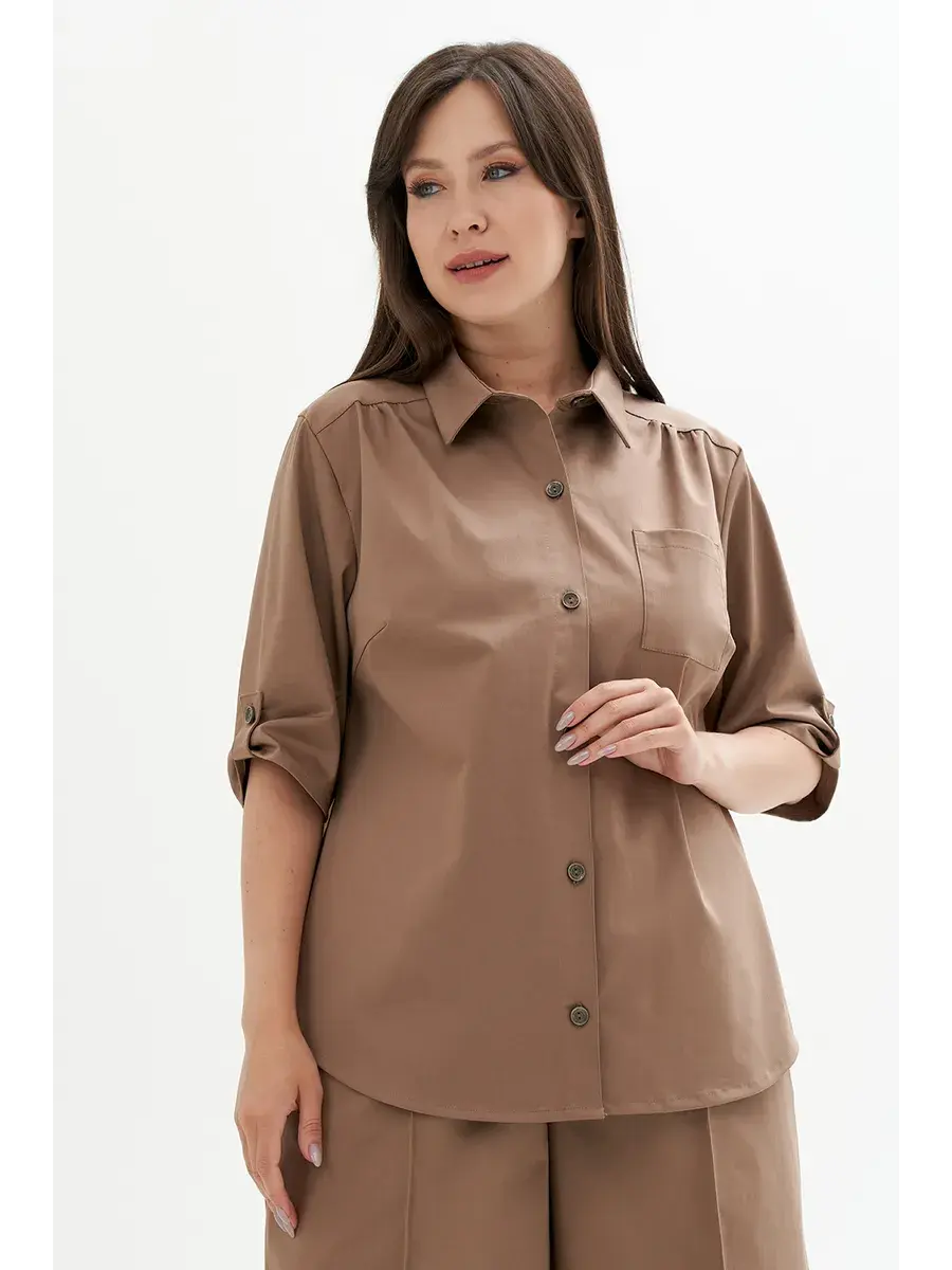 Женская блузка-рубашка больших размеров, выполнена из текстильного полотна хлопок с эластаном. Свободного кроя, с нагрудным карманом, сзади кокетка. Длина по спинке во всех размерах 70 см, длина рукава 36см.