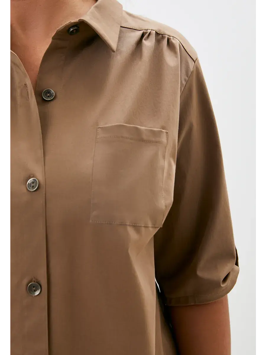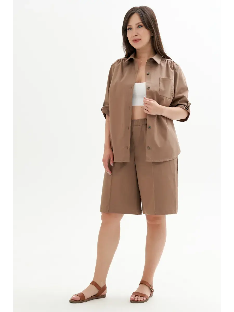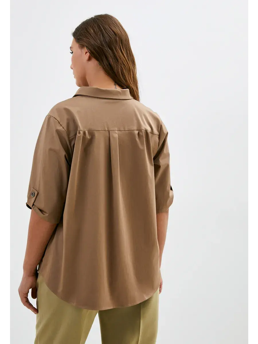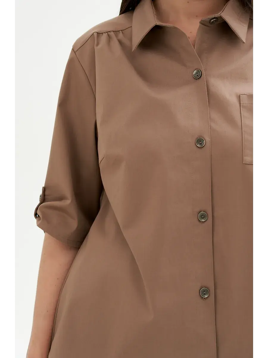 Женская блузка-рубашка больших размеров, выполнена из текстильного полотна хлопок с эластаном. Свободного кроя, с нагрудным карманом, сзади кокетка. Длина по спинке во всех размерах 70 см, длина рукава 36см.