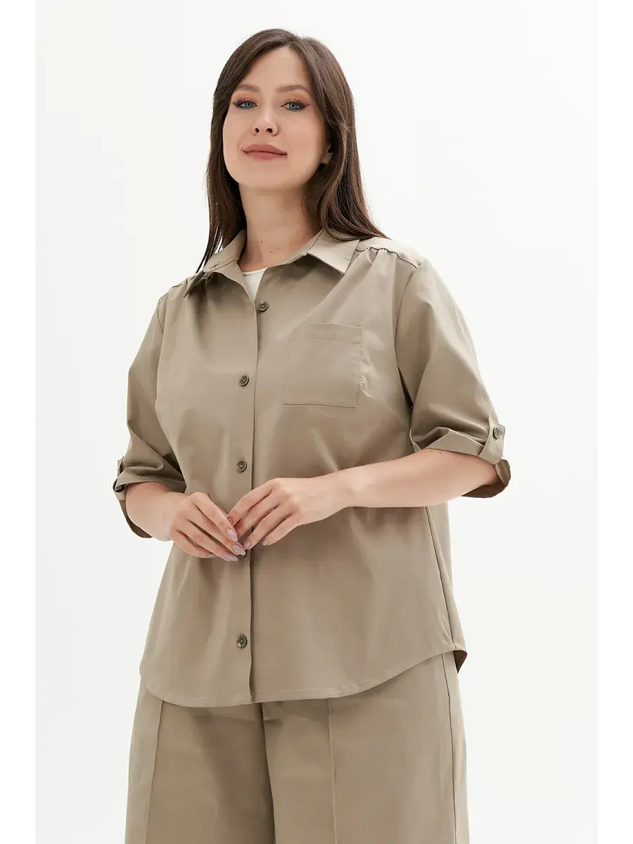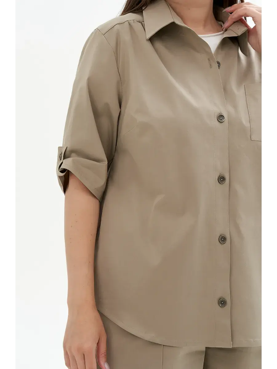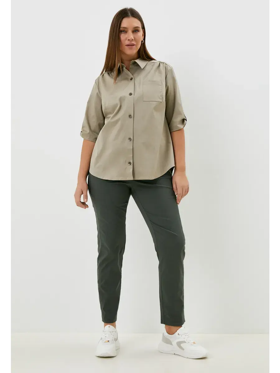 Женская блузка-рубашка больших размеров, выполнена из текстильного полотна хлопок с эластаном. Свободного кроя, с нагрудным карманом, сзади кокетка. Длина по спинке во всех размерах 70 см, длина рукава 36см.