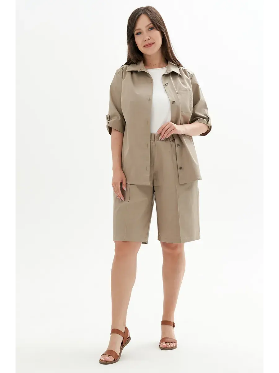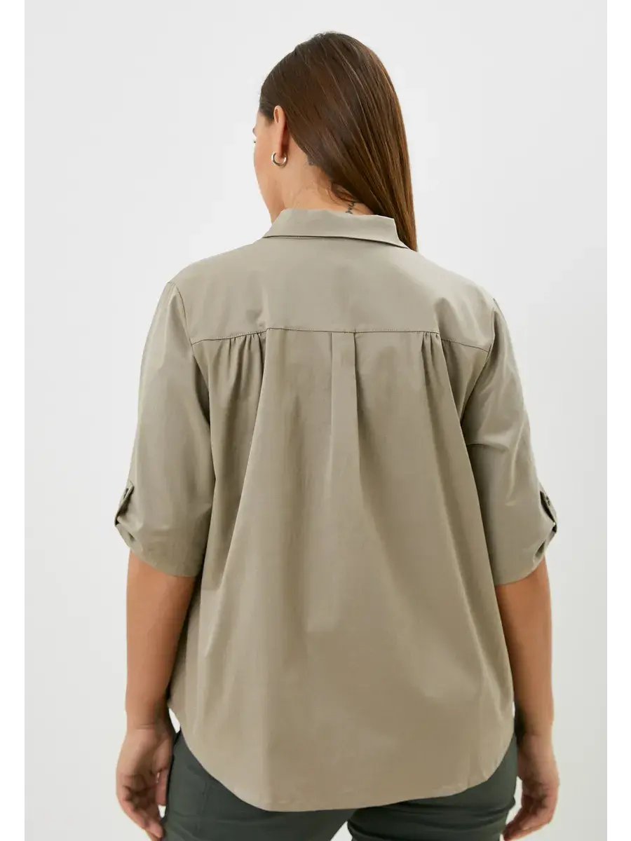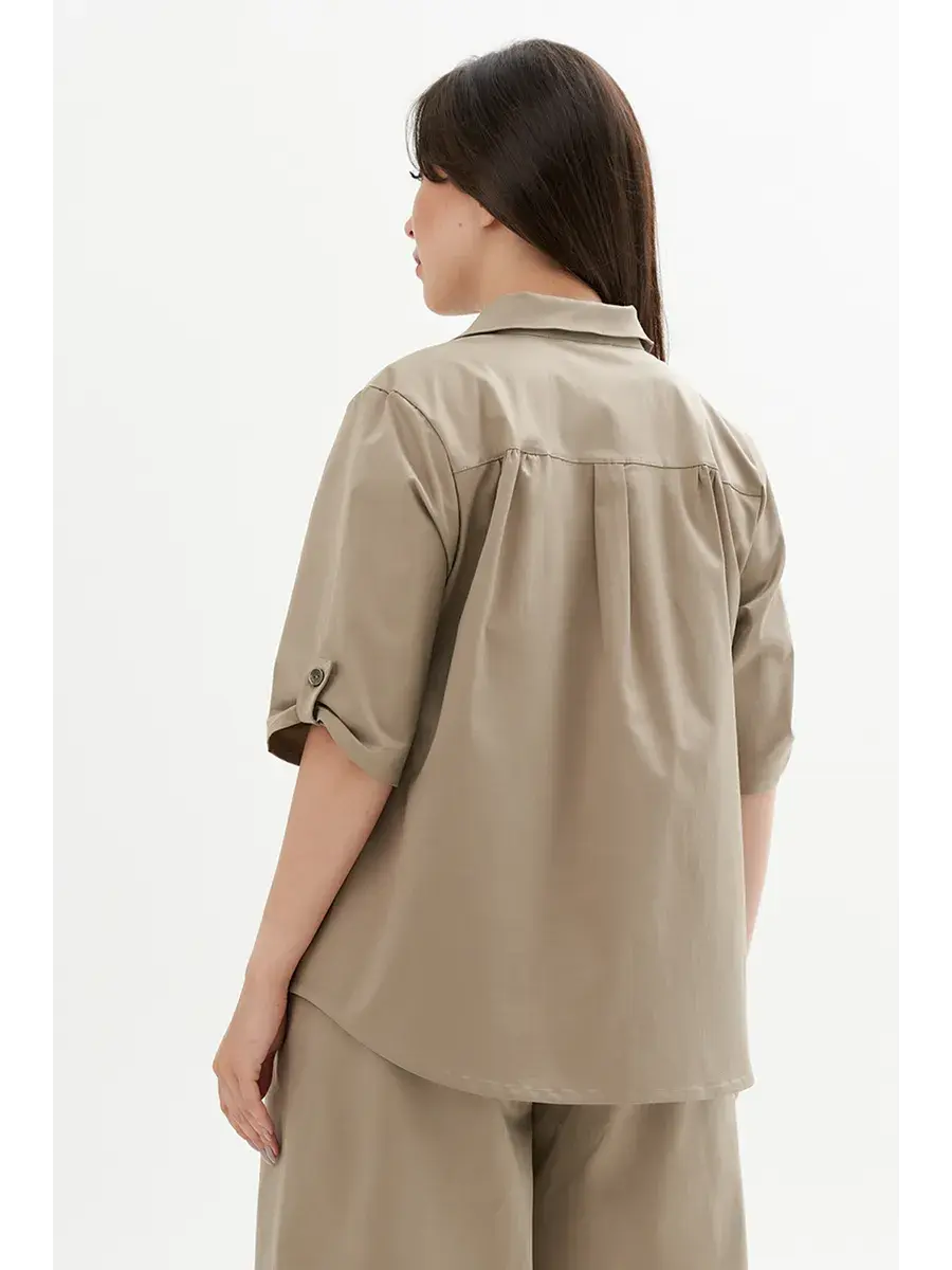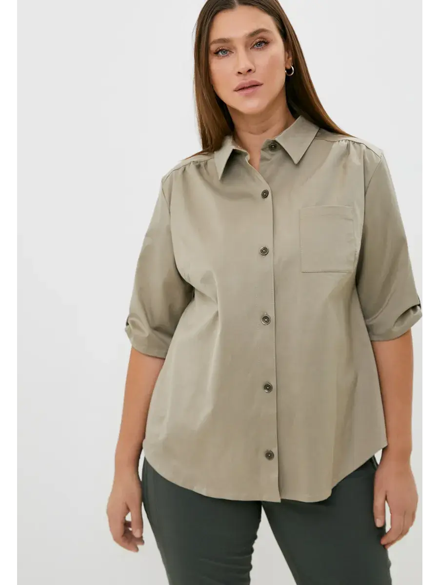 Женская блузка-рубашка больших размеров, выполнена из текстильного полотна хлопок с эластаном. Свободного кроя, с нагрудным карманом, сзади кокетка. Длина по спинке во всех размерах 70 см, длина рукава 36см.
