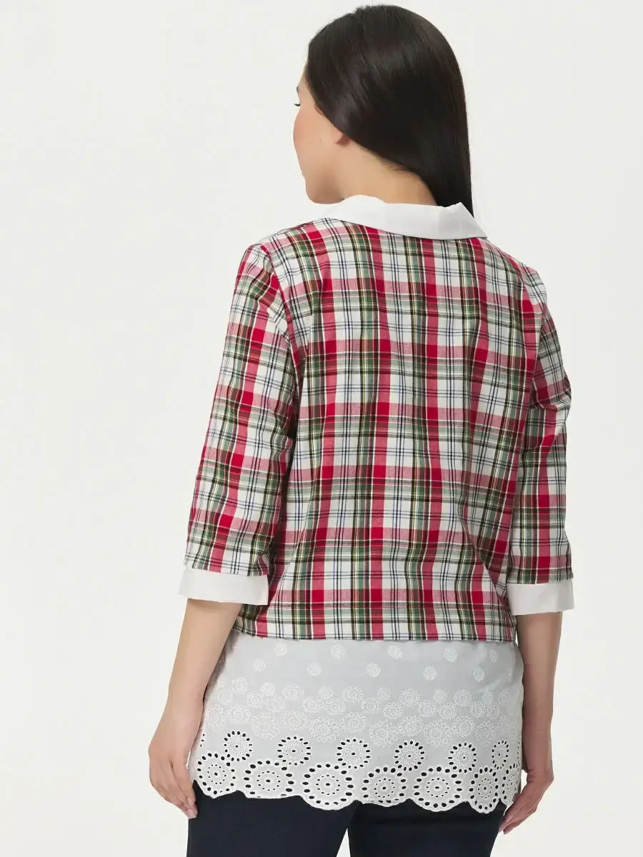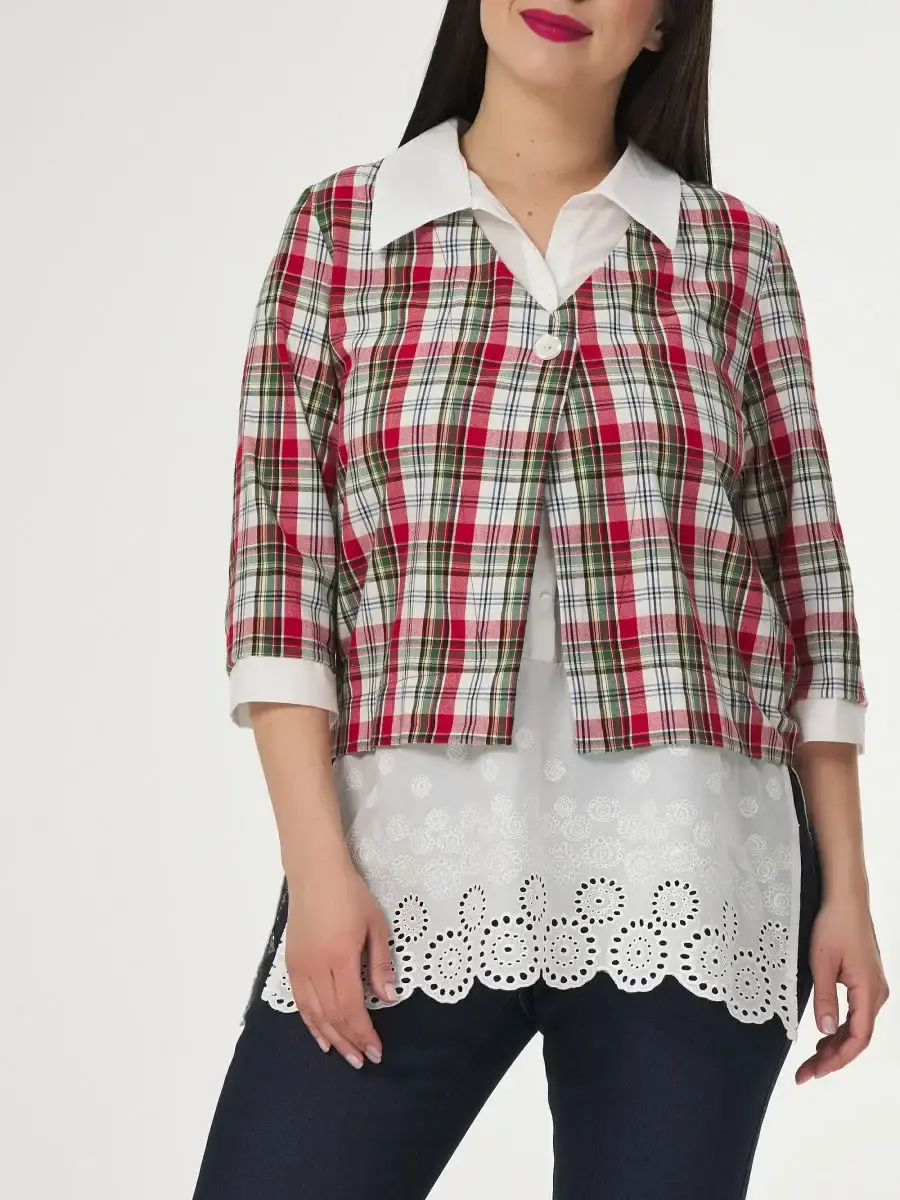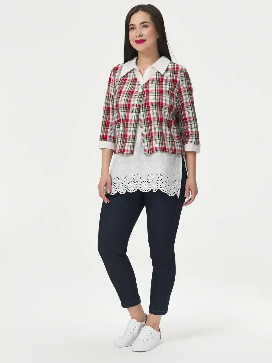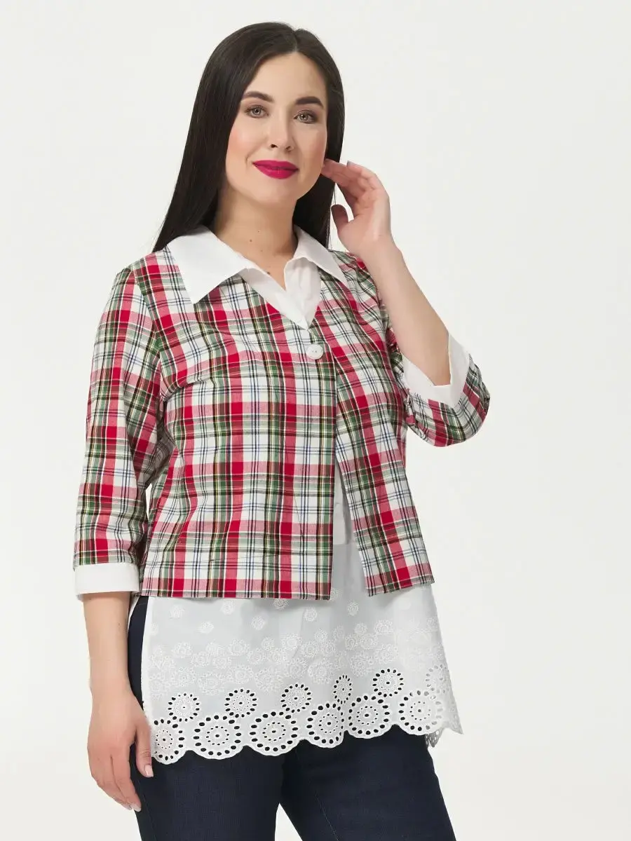 Блузка женская большого размера с имитацией двойки, прямого кроя, выполнена из хлопка. Воротник отложной. Длина изделия по спинке от 70,5см в р.48 до 74,5см в р.66, длина рукава 43см.
