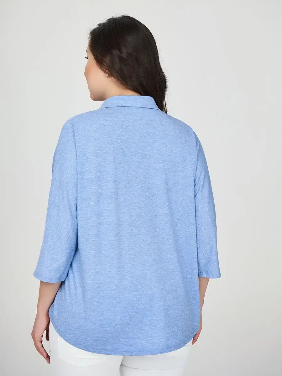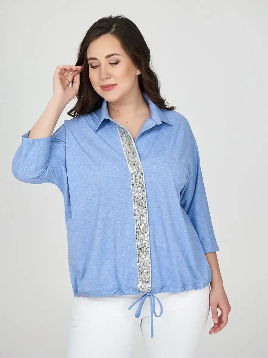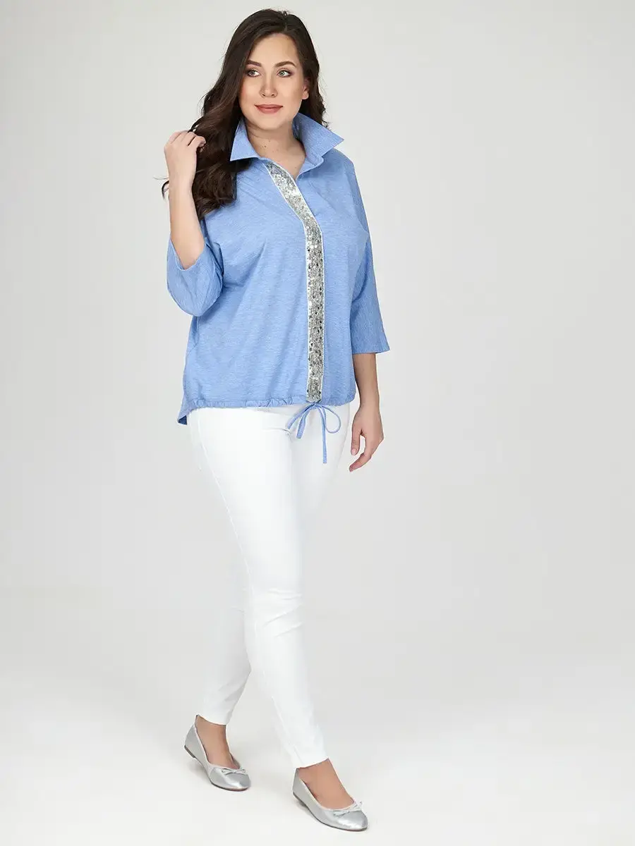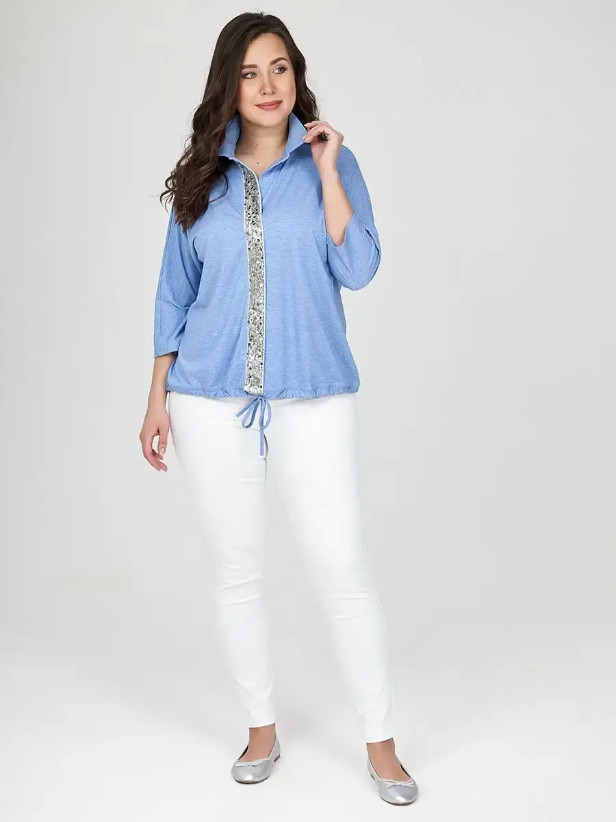 Нарядная блуза из струящегося трикотажа прямого кроя со стильной планкой вдоль застежки, расшитой пайетками. Завязки по низу блузки позволяют регулировать ее объем и длину, соответственно особенностям фигуры и выбранному образу. Комфортный рукав-доломан длиной 3/4 подчеркивает красоту рук.Длина изделия по спинке от 69,5см в р.48 до 75см в р.70, длина рукава 45см.
