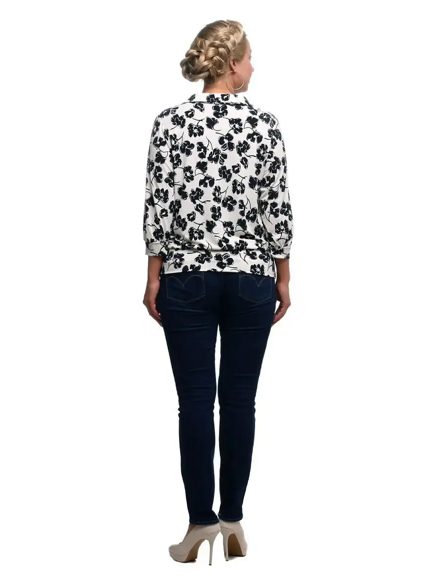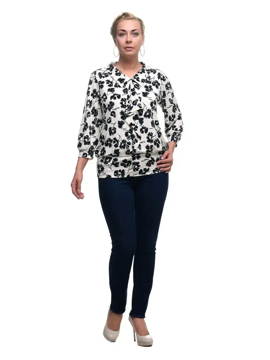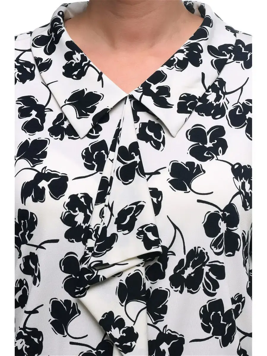 Стильная блузка из тонкого трикотажа с монохромным цветочным принтом, втачными рукавами, подхваченными манжетами, V-образным вырезом горловины с отложным воротником, декорированным оборкой-галстуком. Низ изделия на широком круговом эластичном поясе, фиксирующемся на бедрах. Благодаря крою и расцветке, модель зрительно уравновешивает фигуру. Детали придают образу женственность и юный задор.Длина по спинке:р.48-71,5см р.50-72см р.52-72,5см р.54-73см р.56-73,5см р.58-74см р.60-74,5см р.62-75см р.64-75,5см р.66-76см р.68-76,5см р.70-77см Длина рукава:р.48-49,1смр.50-49смр.52-48,9смр.54-48,9смр.56-48,9смр.58-48,8смр.60-48,7смр.62-48,6смр.64-48,6смр.66-48,5смр.68-48,4смр.70-48,3см