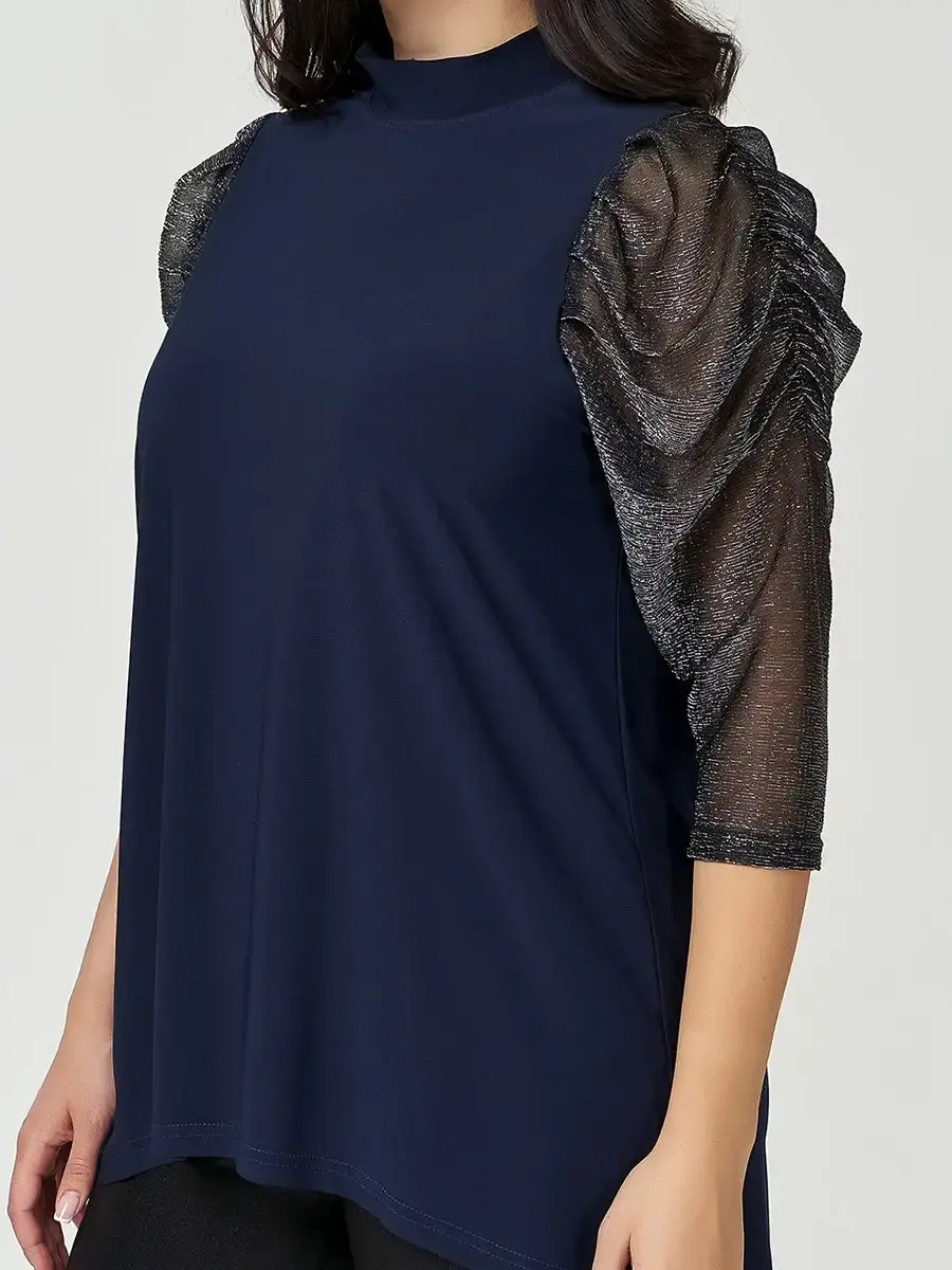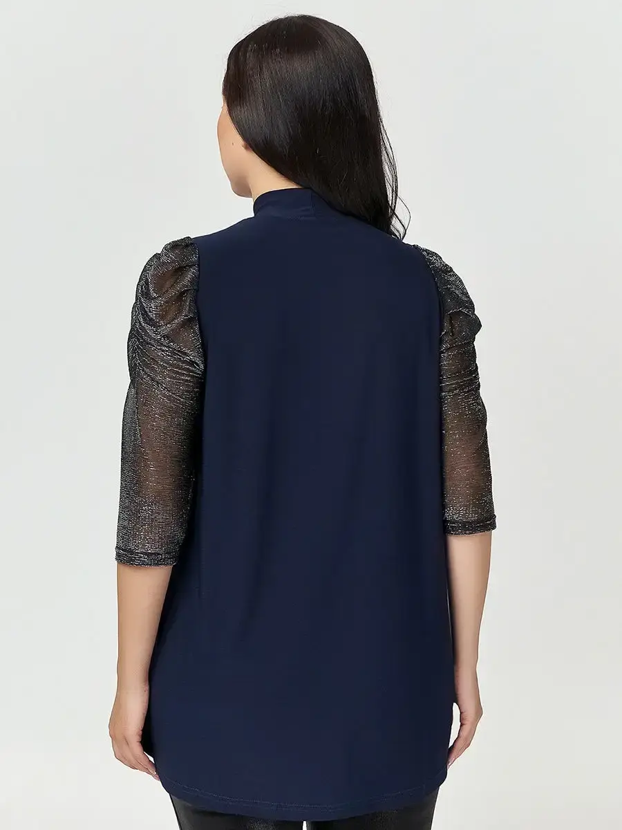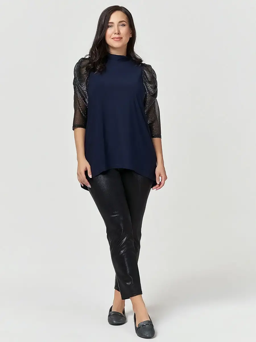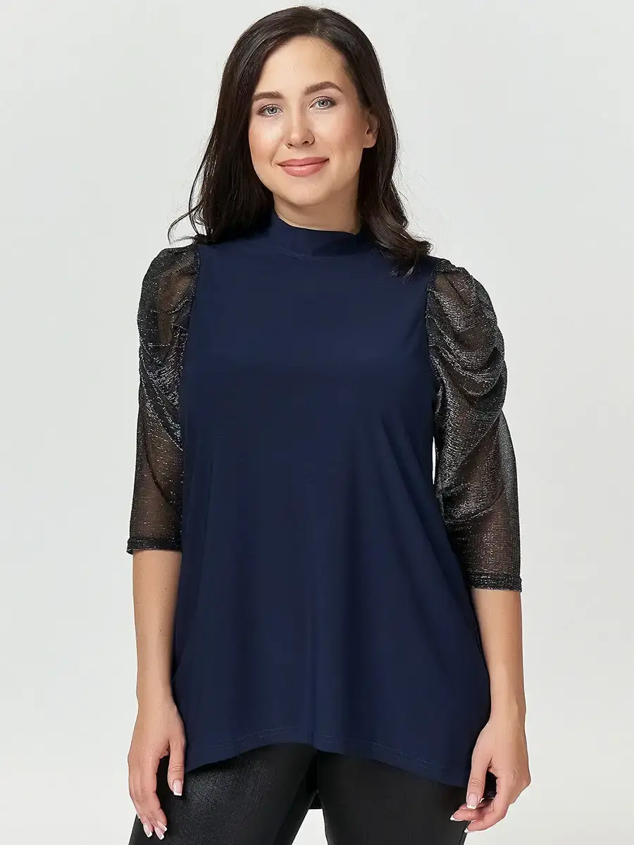 Блузка женская, однотонная, из трикотажного полотна по типу масло. Перед и спинка цельнокроеные. Воротник стойка, рукав втачной, со сборкой, отличающийся от основной ткани, с блестками. Длина рукава до локтя. Длина изделия по спинке от 80,5см в р.48 до 85,5 в р.68, длина рукава 45см.