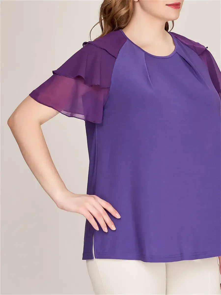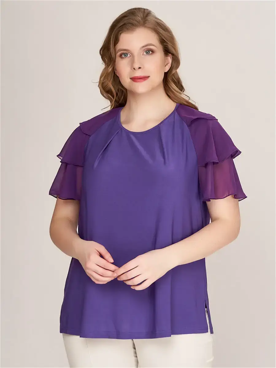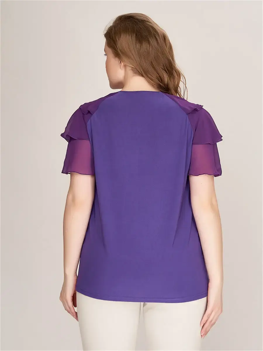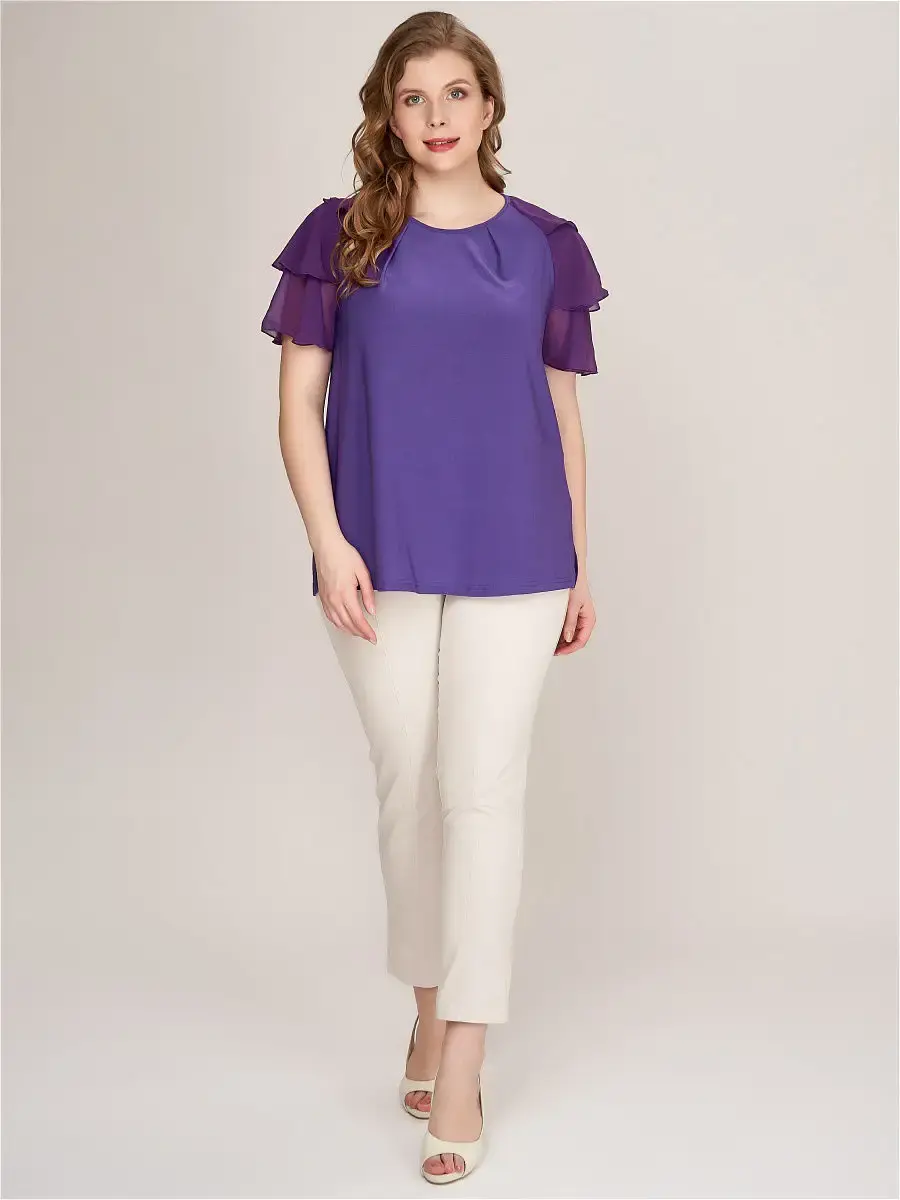 Стильная блузка прямого кроя выполнена из полотна масло, с округлой горловиной, и рукавами-воланами из шифона. Фасон рукава придает образу воздушность, мягкость, женственность. При непропорциональной фигуре «груша», например, воланы на плечах добавят объем верхней части тела, и визуально уравновесят силуэт. Изделие подойдет непосредственным, жизнерадостным натурам.Длина изделия по спинке от 65см в р.48 до 70,5см в р.70, длина рукава от 34,5с м в р.48 до 39см в р.70.