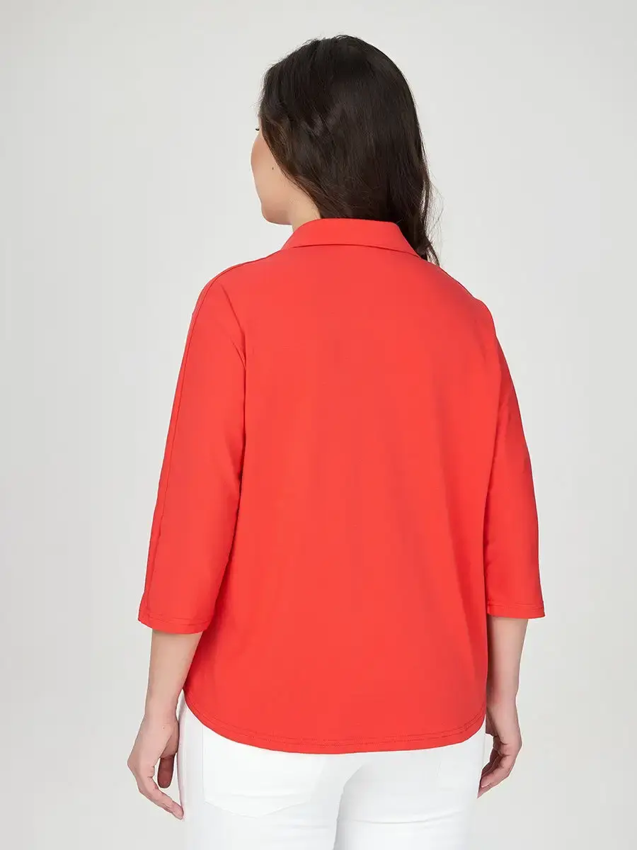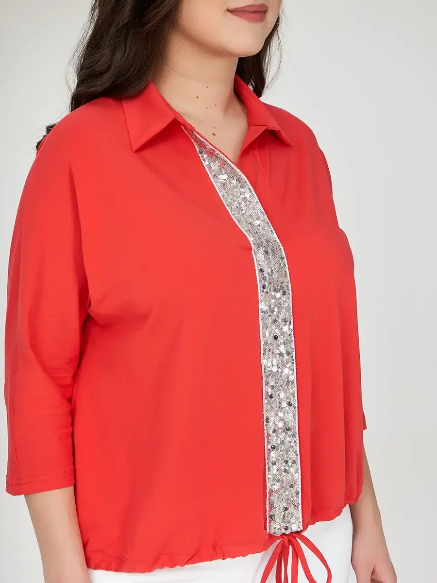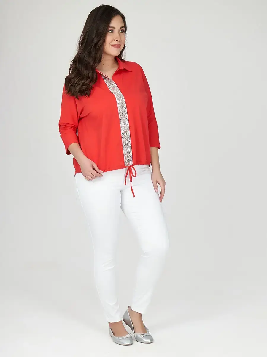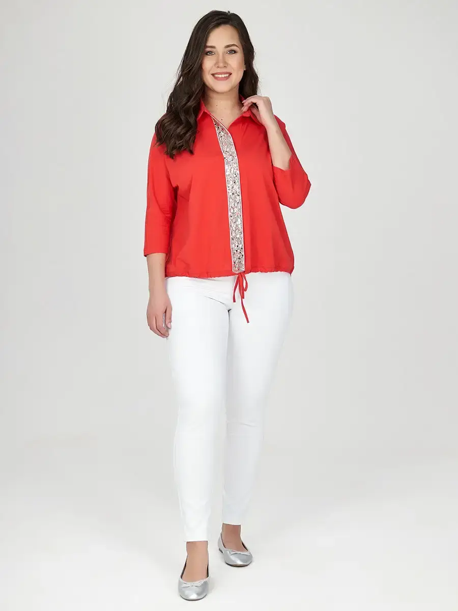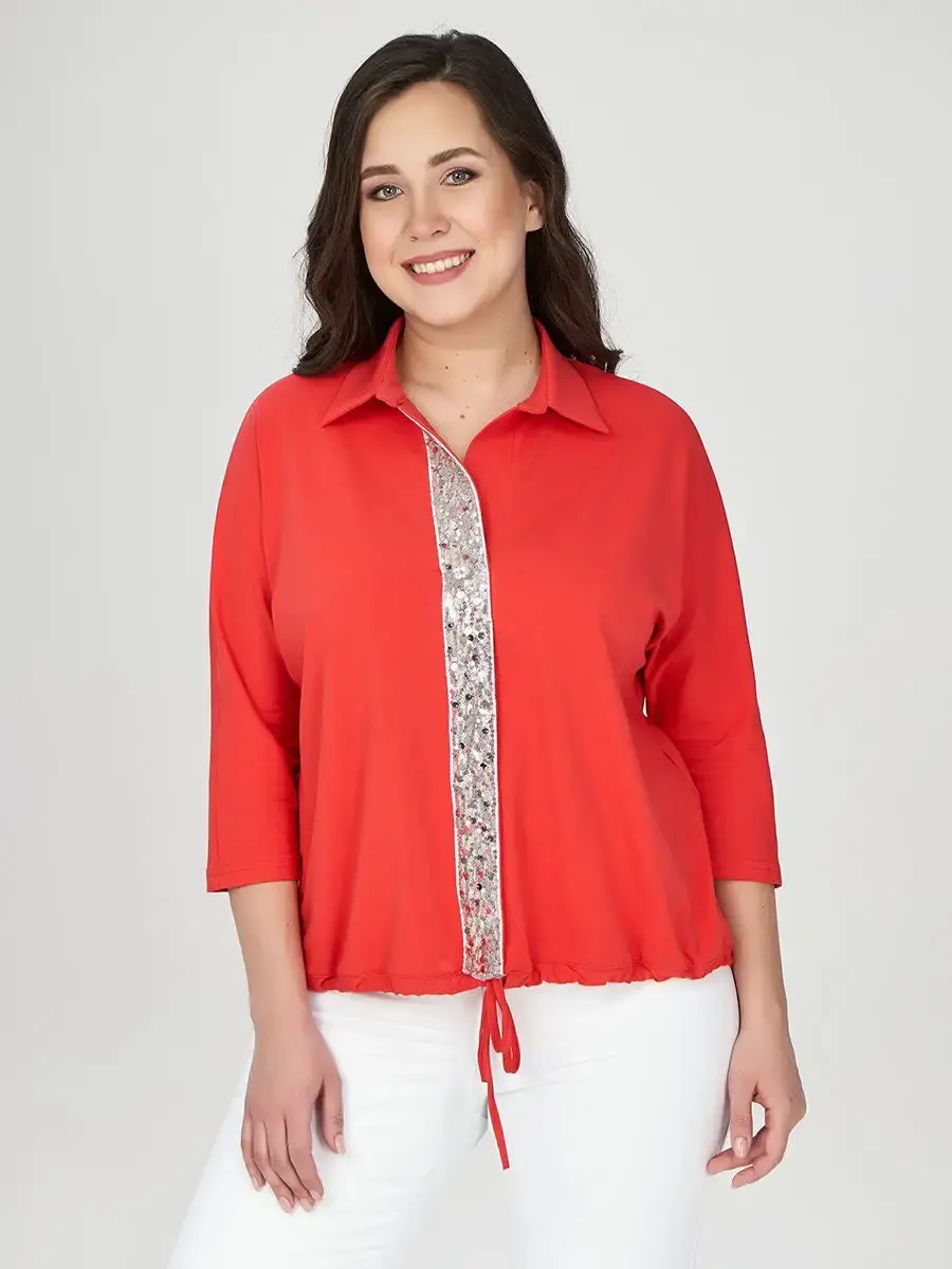 Нарядная блуза из струящегося трикотажа прямого кроя со стильной планкой вдоль застежки, расшитой пайетками. Завязки по низу блузки позволяют регулировать ее объем и длину, соответственно особенностям фигуры и выбранному образу. Комфортный рукав-доломан длиной 3/4 подчеркивает красоту рук.Длина изделия по спинке от 69,5см в р.48 до 75см в р.70, длина рукава 45см.