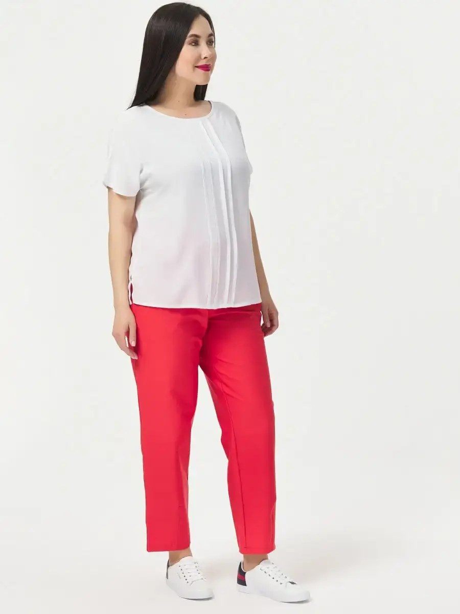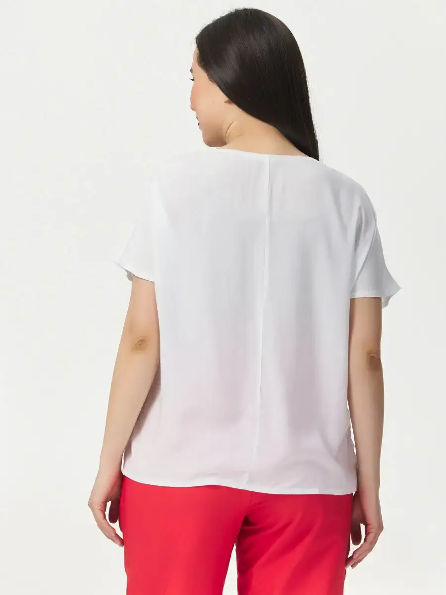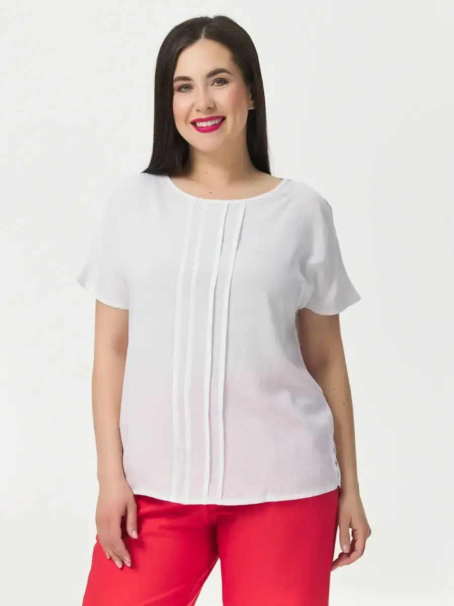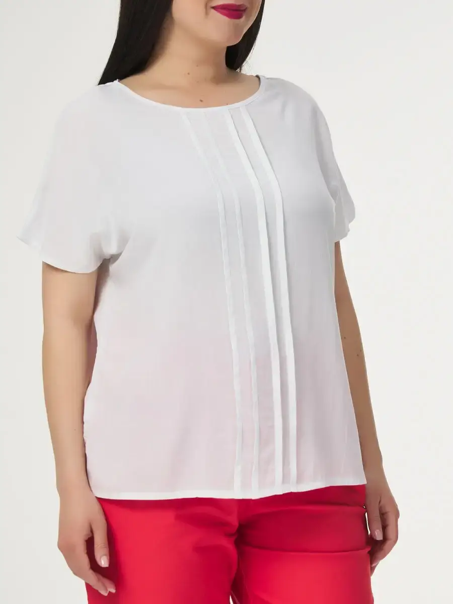 Блузка прямого силуэта свободной формы из однотонной вискозы. Блузка по переду с герметичными линиями. Спинка со средним швом. Длина изделия по спинке от 63см в р.48 до 68,5см в р.70.