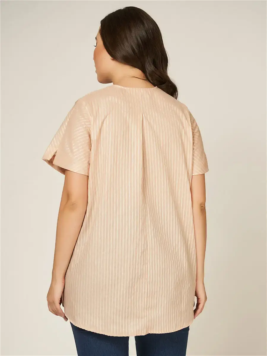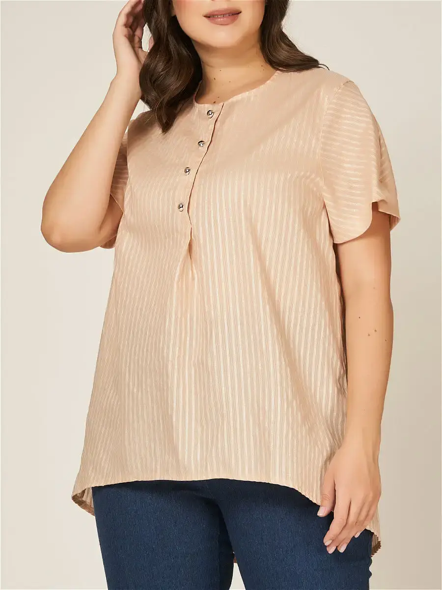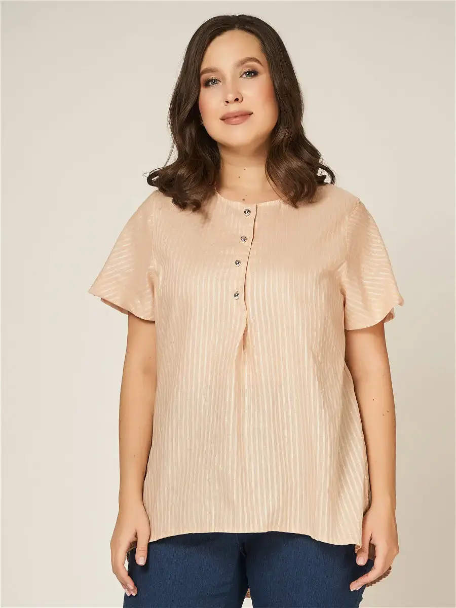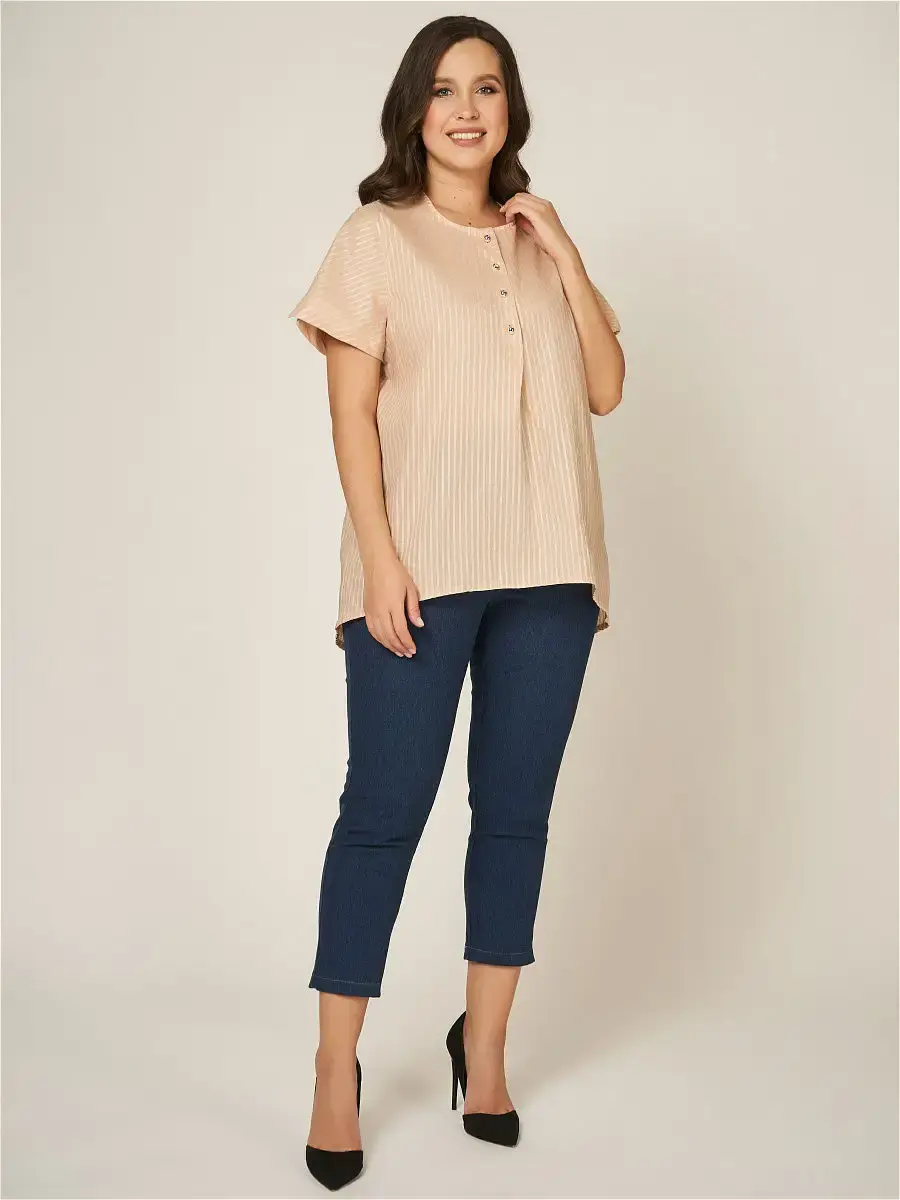 Летняя легкая блузка из тонкой хлопковой ткани А-силуэта в тонкую вертикальную полоску с округлым вырезом и короткими рукавами. Модель на застежке до середины груди с декоративными пуговицами-бусинами. Изделие хорошо корректирует фигуру, позволяет даже в жару чувствовать себя свежо, свободно и непринужденно. Длина изделия по спинке от 79см в р.48 до 84,5см в р.70.