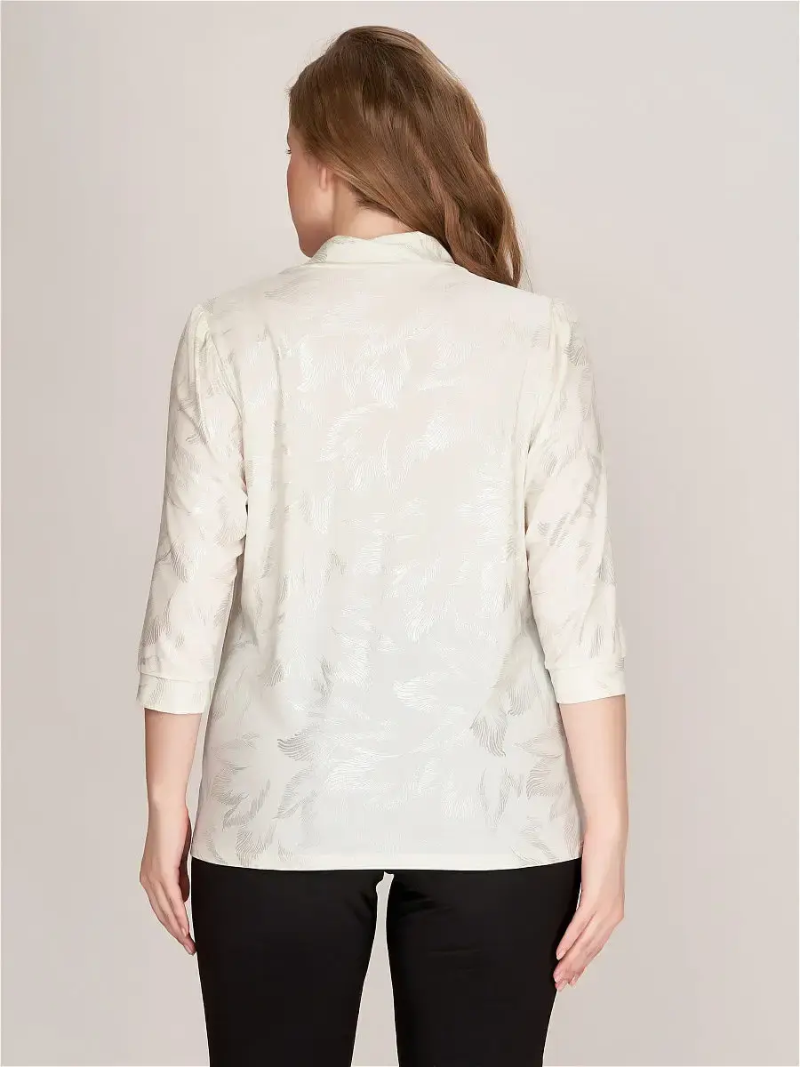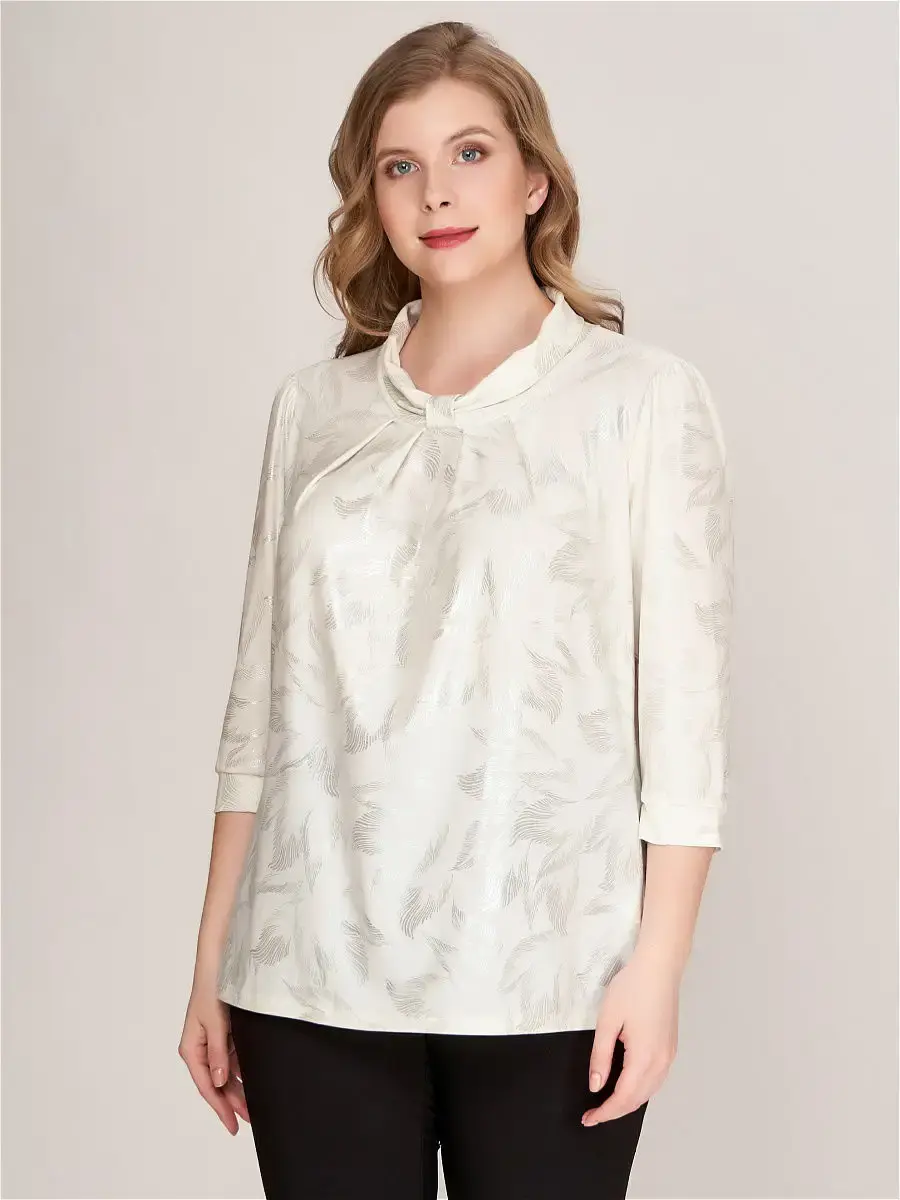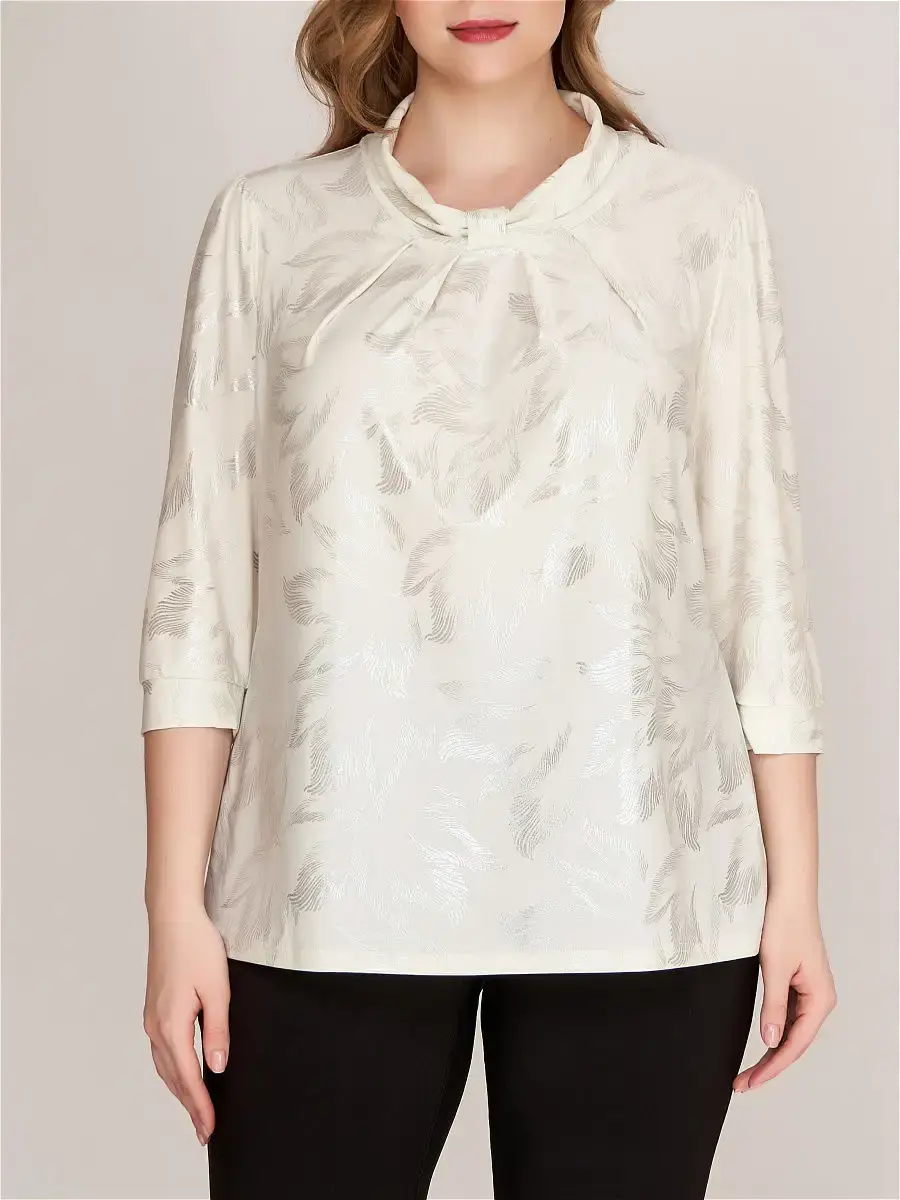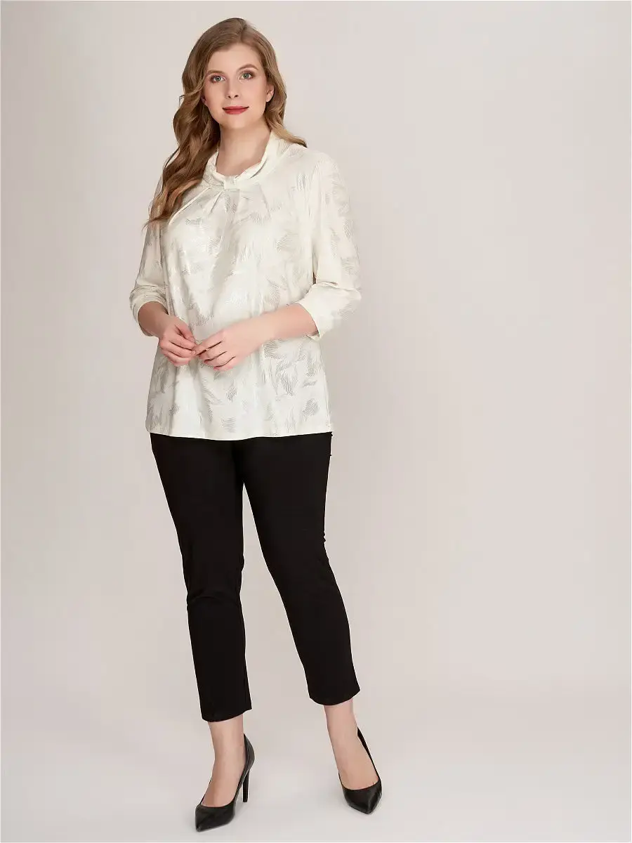 Элегантная блузка из полотна масло с фойлом, с защипами на груди, фантазийным воротником стойкой, присборенными в плечах рукавами 3/4 на манжетах. Модель классического прямого кроя, лаконичная и сдержанная. Может быть повседневной и нарядной. Визуально удлиняет шею, подчеркивает красоту запястья, уравновешивает фигуру. Длина изделия по спинке от 65см в р.48 до 70,5см в р.70, длина рукава 42,5см.