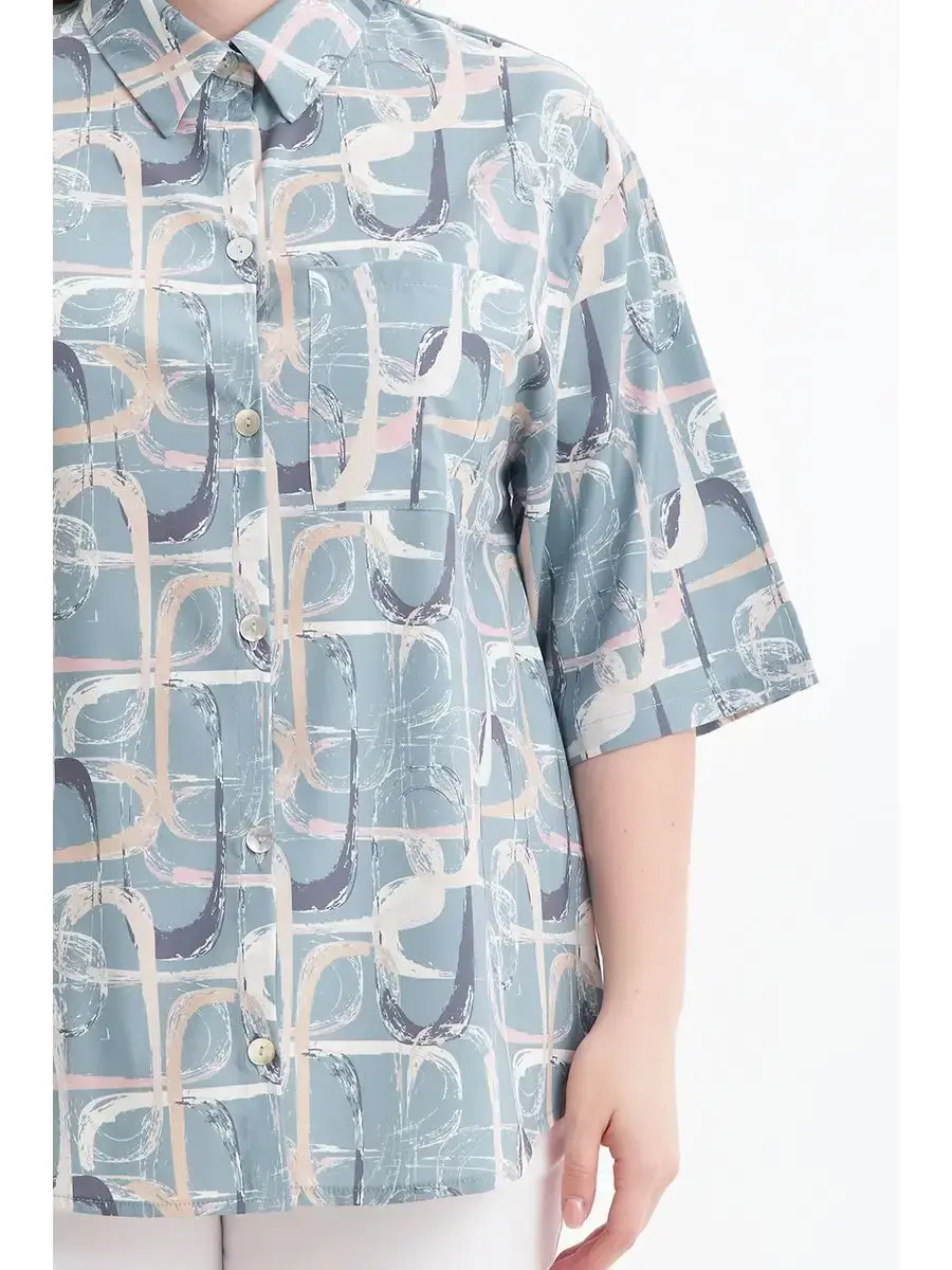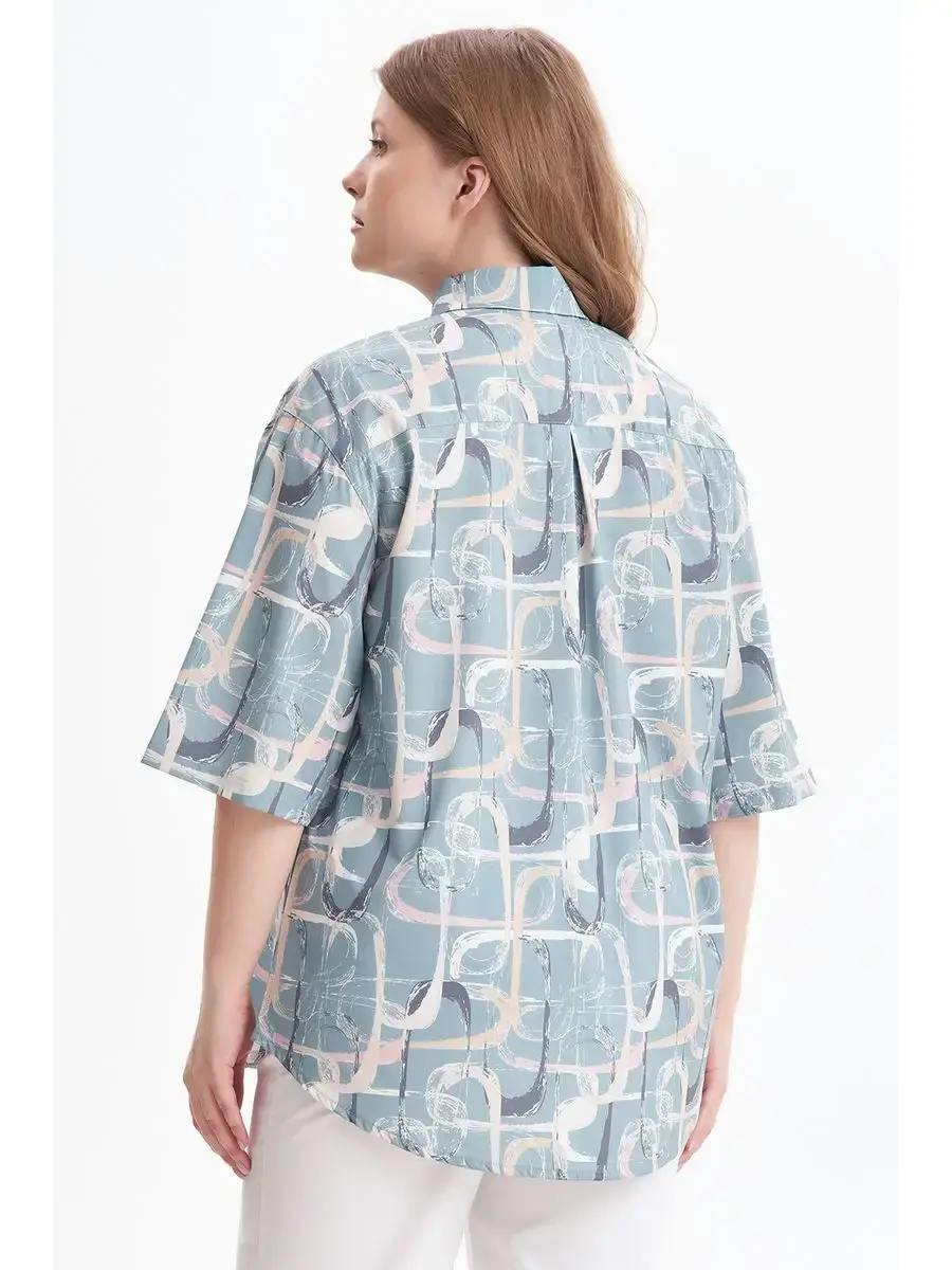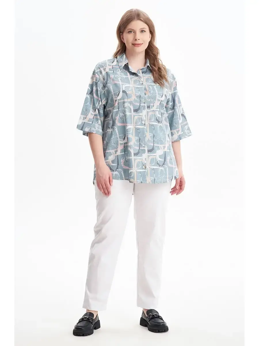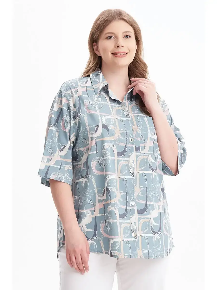 Женская блузка-рубашка больших размеров, отложной воротник, с карманами на груди. Рукава длиной до локтя. Выполнена из тонкого эластичного струящегося полотна по типу искусственного шёлка. Отличный вариант в офис и как повседневная одежда.