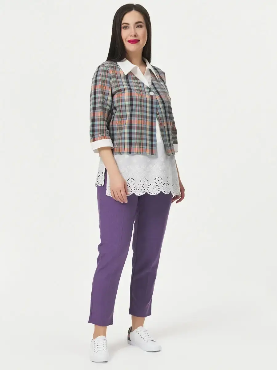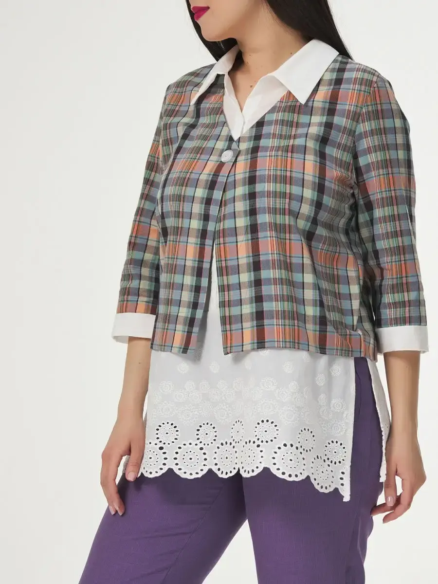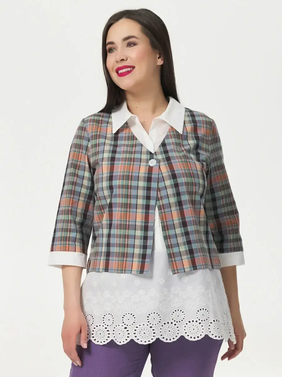 Блузка женская большого размера с имитацией двойки, прямого кроя, выполнена из хлопка. Воротник отложной. Длина изделия по спинке от 70,5см в р.48 до 74,5см в р.66, длина рукава 43см.