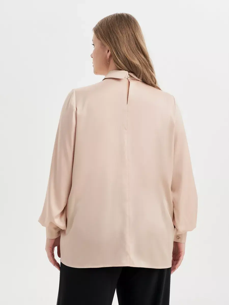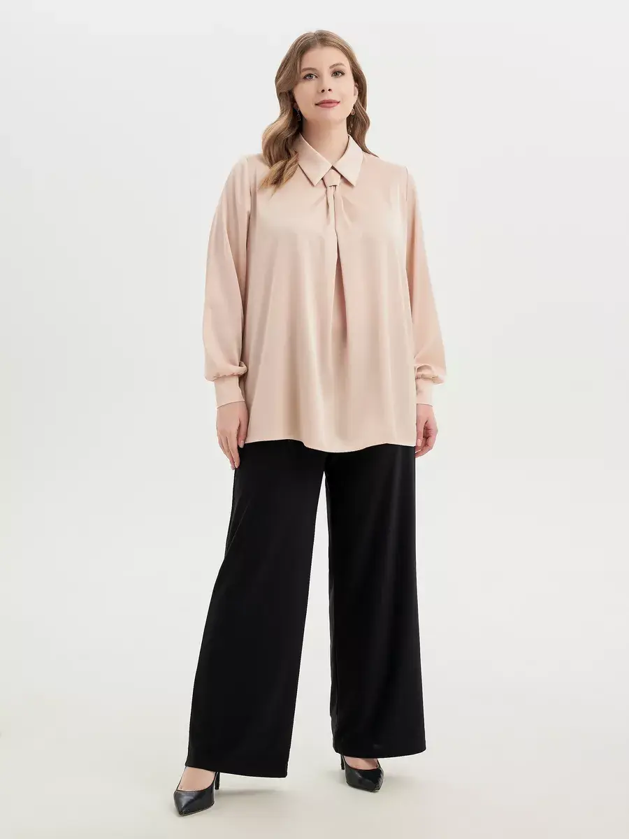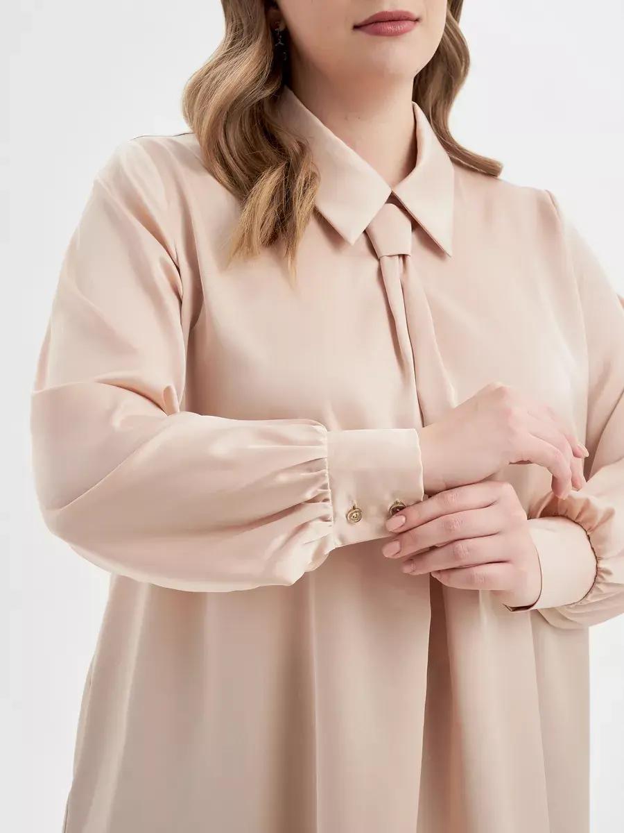Женская блузка больших размеров выполнена из текстильного струящегося тонкого полотна, по типу искусственного шелка, прямого кроя. Декорирована галстуком, длинный рукав с манжетом, застёгивается на пуговицу.Длина по спинке/ ширина по груди соответственно:р.50-73см/ 57,4см;р.52-73,5см/ 59,4см;р.54-74см/ 61,4см;р.56-74,5см/ 63,4см;р.58-75см/ 65,4см;р.60-75,5см/ 68,4см;р.62-76см/ 70,4см.Длина рукава во всех размерах 65см.