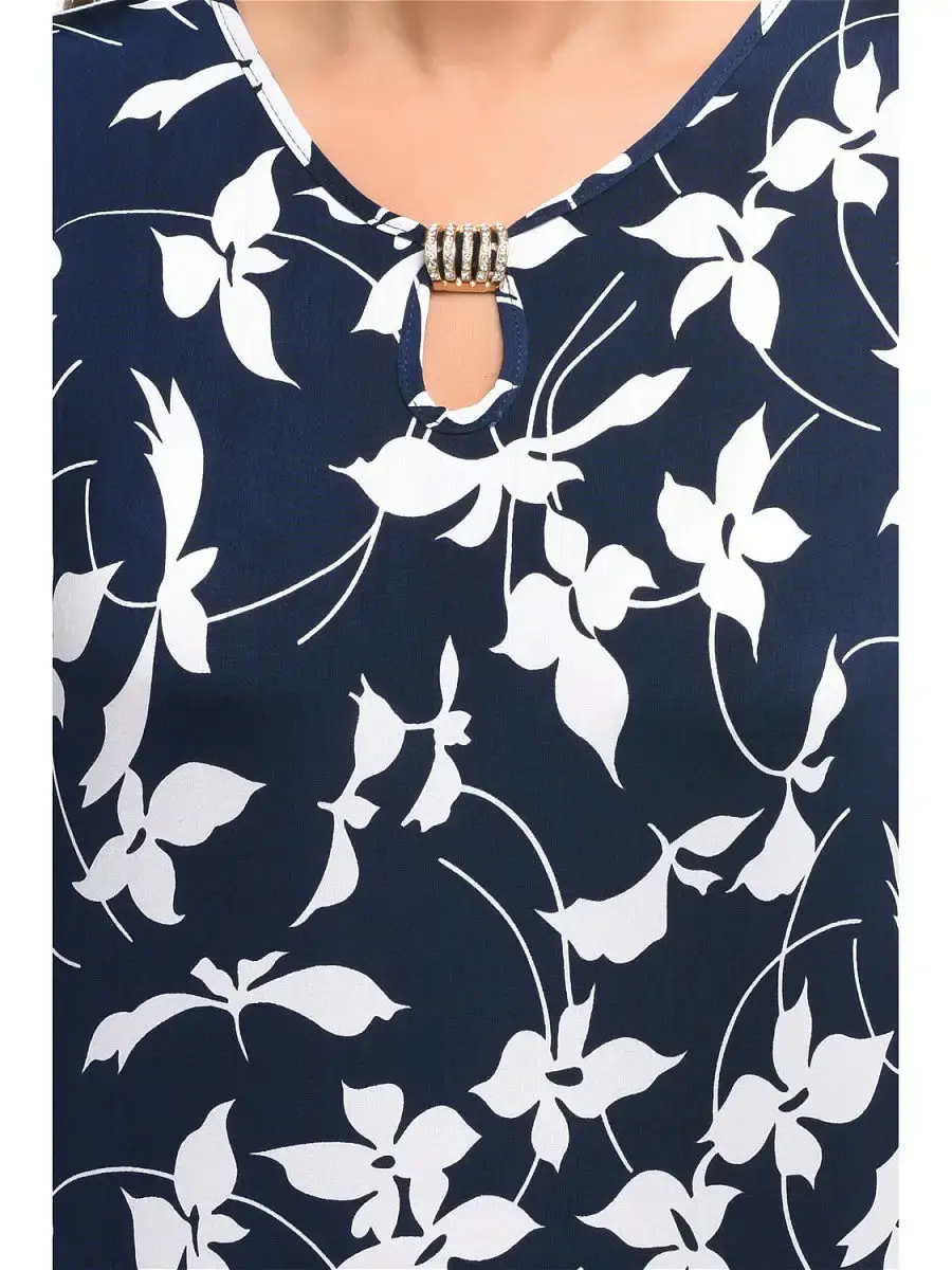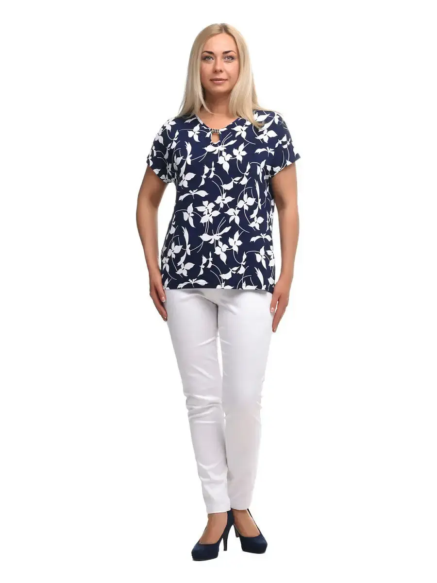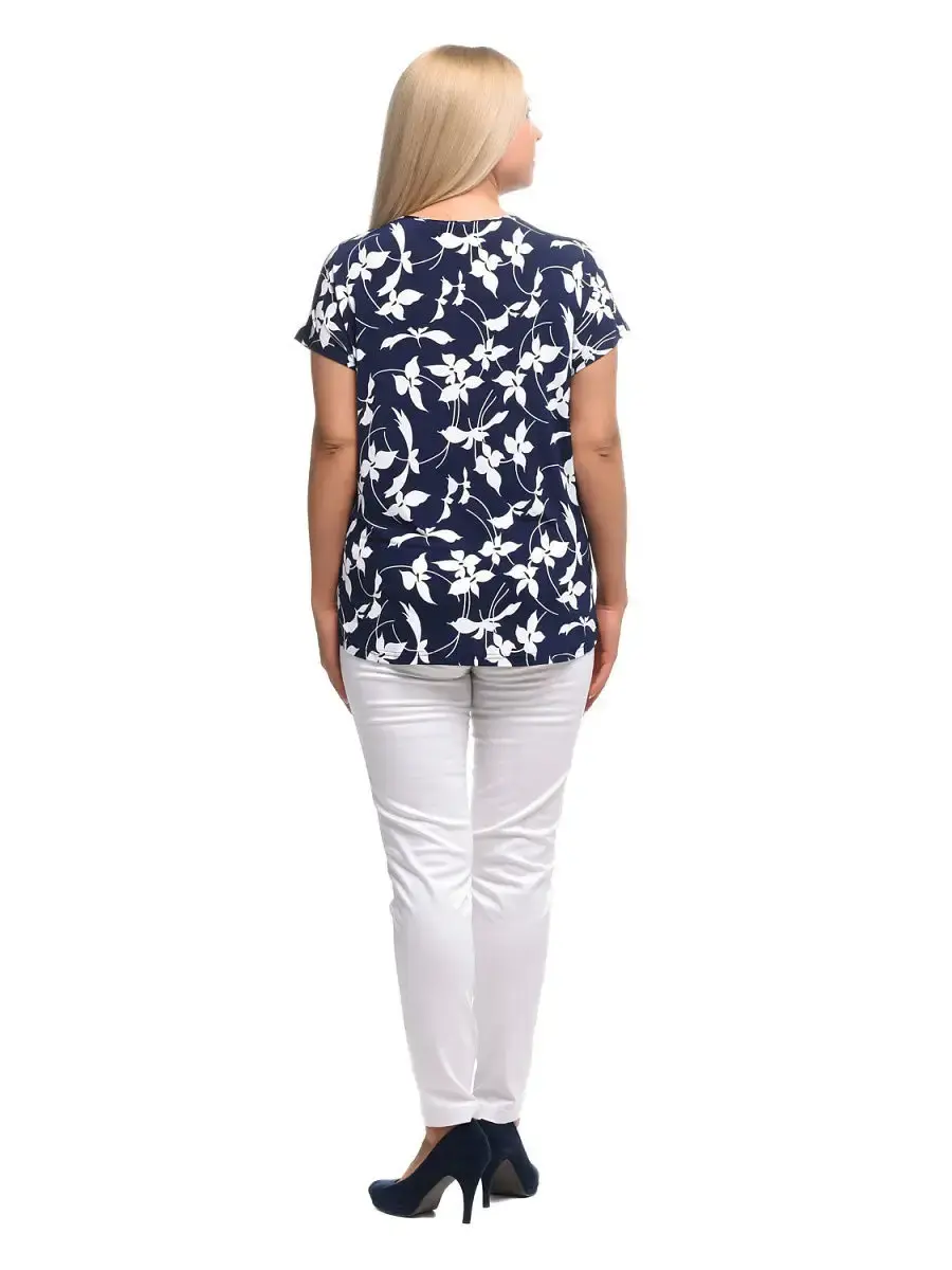 Стильная женская футболка pluse size с коротким рукавом. Выполнена из принтованного трикотажа масло. Спереди горловина декорирована украшением со стразами. Длина футболки по спинке от 73,5см в 48 размере до 79 см в 70 размере.