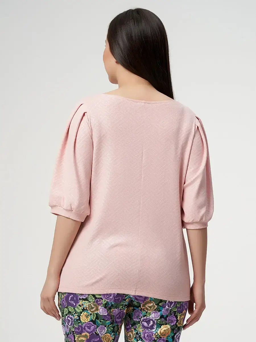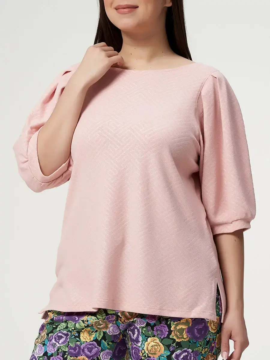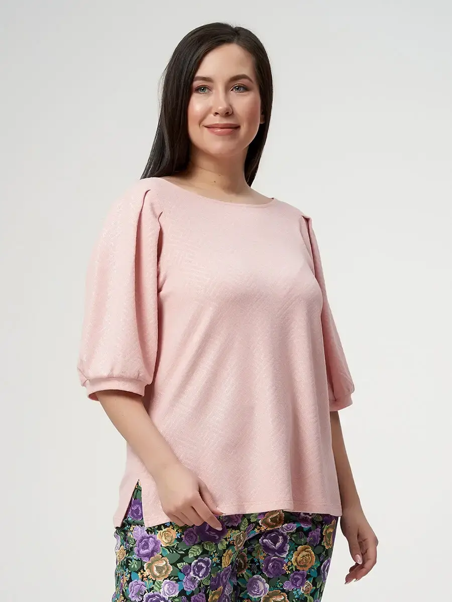 Женская повседневная блузка, прямого силуэта, выполненная из мелко узорчатой ткани в полоску с блестками. Спинка со средним швом. Рукав втачной одношовный, длинной до локтя, с 4мя складками, сборкой на нижней части рукава и притачной манжетой. Небольшой разрез по боковым линиям, длинной до бедер. Длина изделия по спинке от 65см в р.48 до 70,5см в р.70, длина рукава 43см.
