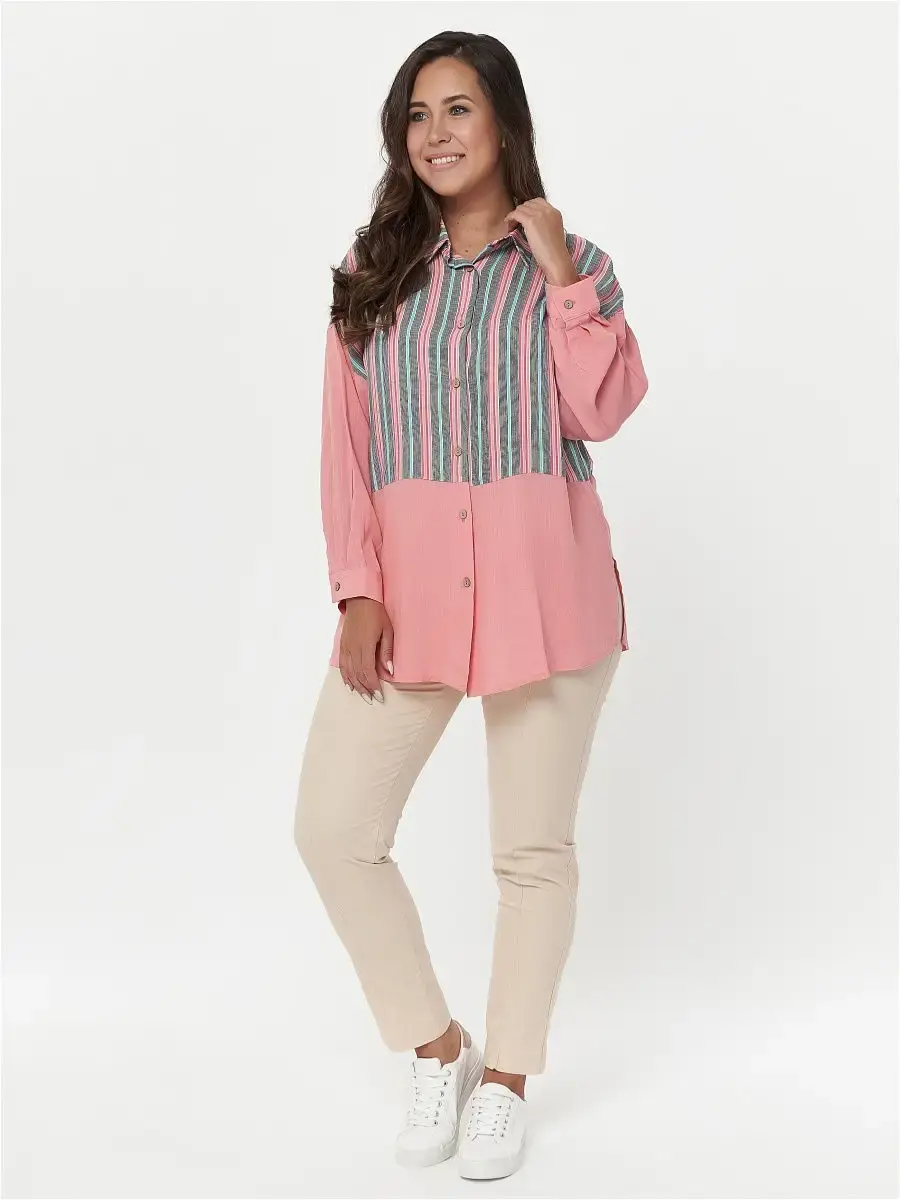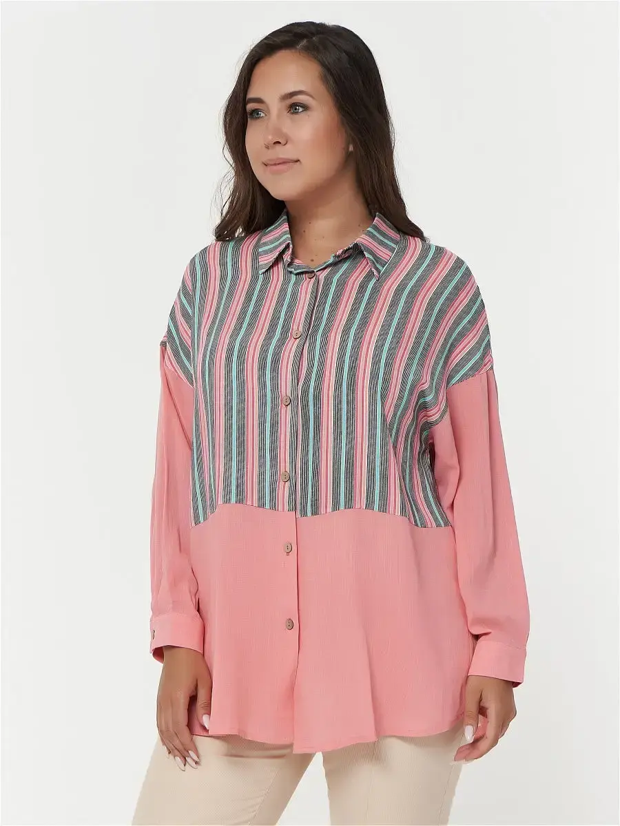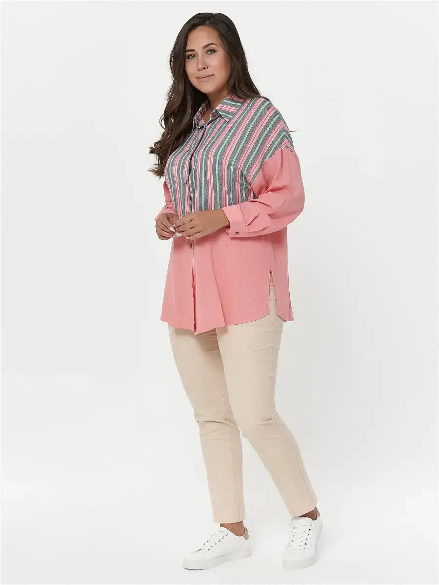 Стильная блузка-рубашка из тонкой вискозы, выполненная в комбинации однотонной ткани и материала в вертикальную полоску. Модель свободного кроя, с отрезными длинными рукавами подхваченными манжетами, со спущенным плечом, с классическим рубашечным воротником спрэд, пуговичной застежкой на открытой планке, разрезами по бокам полочек. Полоска спереди до линии отреза по талии и до рукавов, визуально корректирует пропорции.Длина изделия по спинке от 73см в р.48 до 78,5см в р.70, длина рукава 60см.