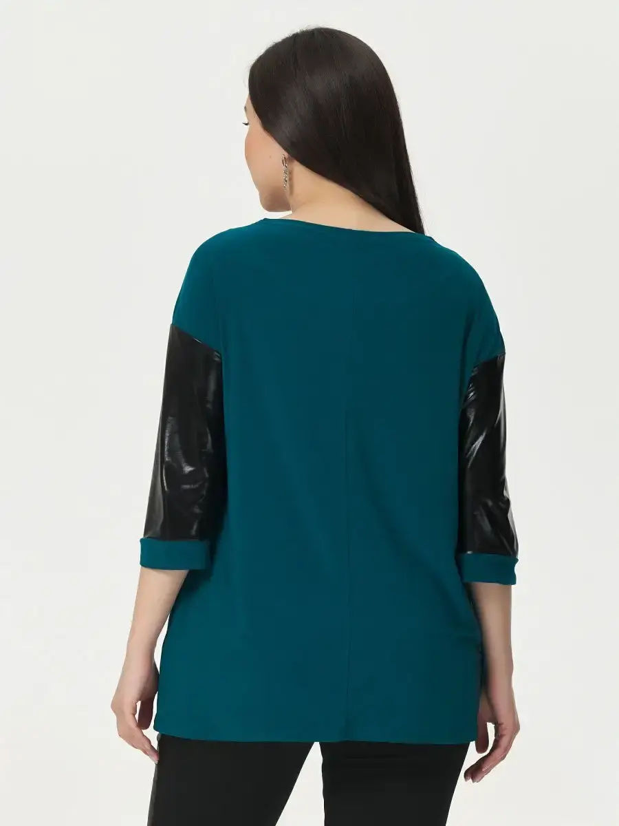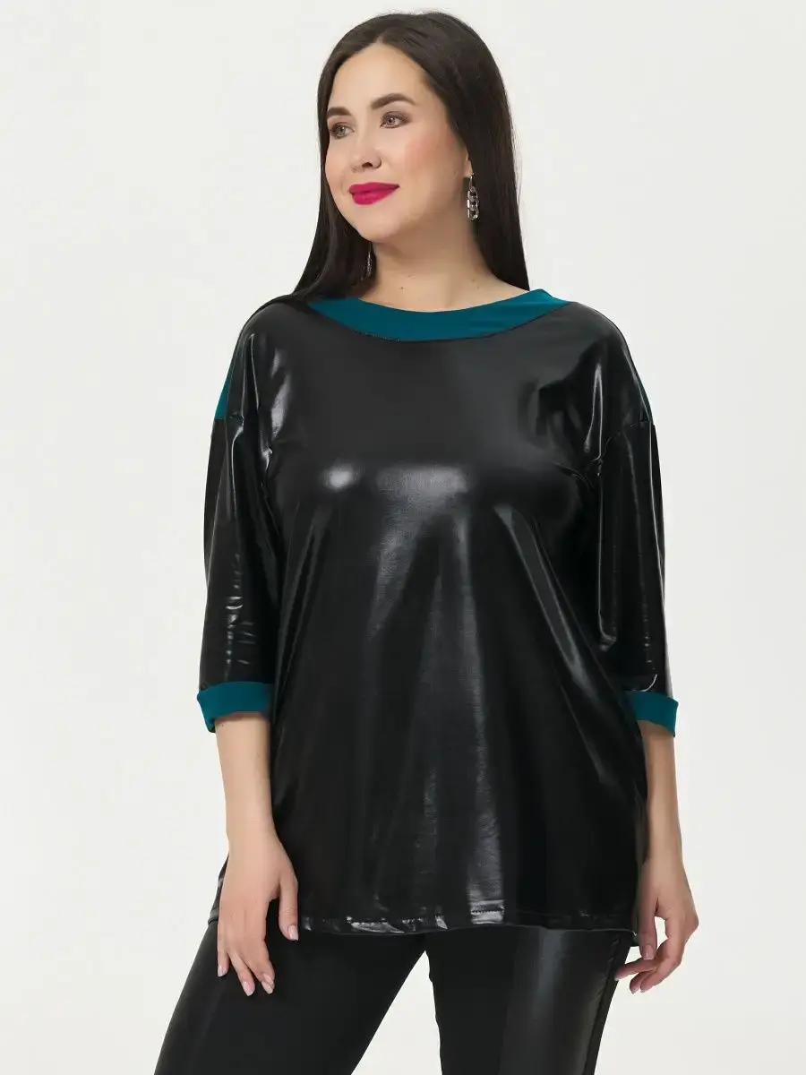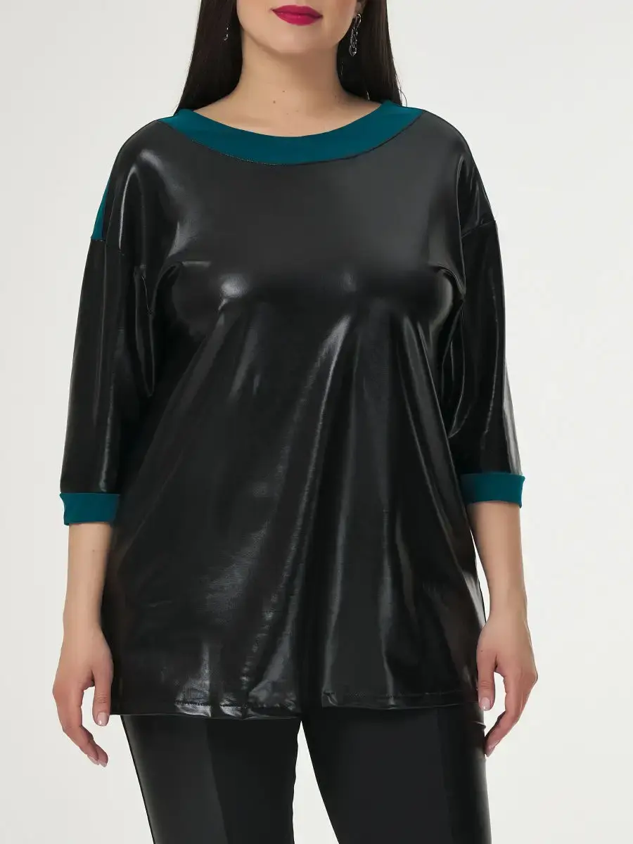 Женская нарядная туника, прямого силуэта, выполненная трикотажи и ткани “лаке”. Перед цельнокроеной из ткани “лаке”, горловина переда обработана окантовкой из трикотажа. Длина изделия по спинке от 75см в р.48 до 80,5 см в р.70. Длина рукава 45см.