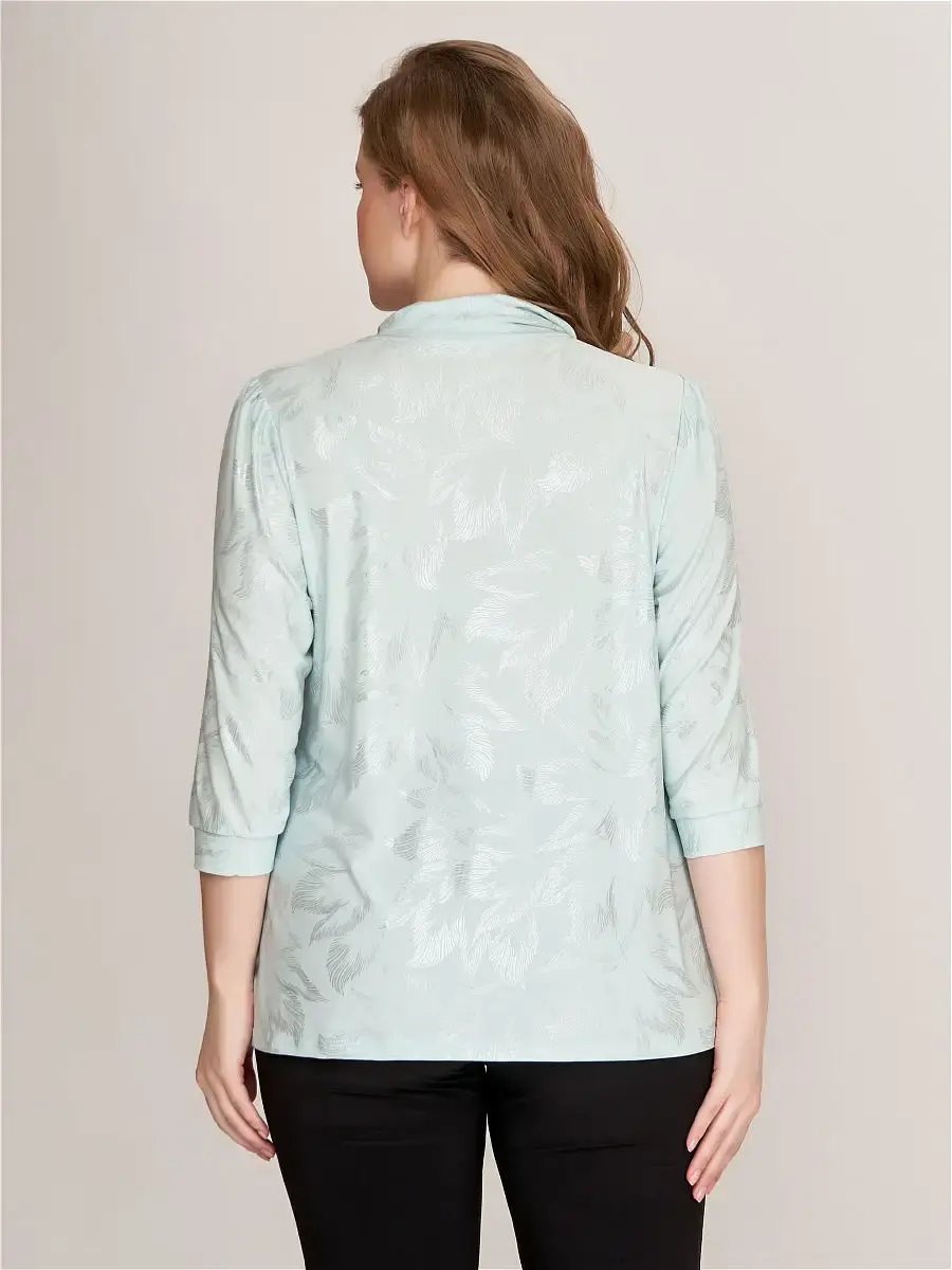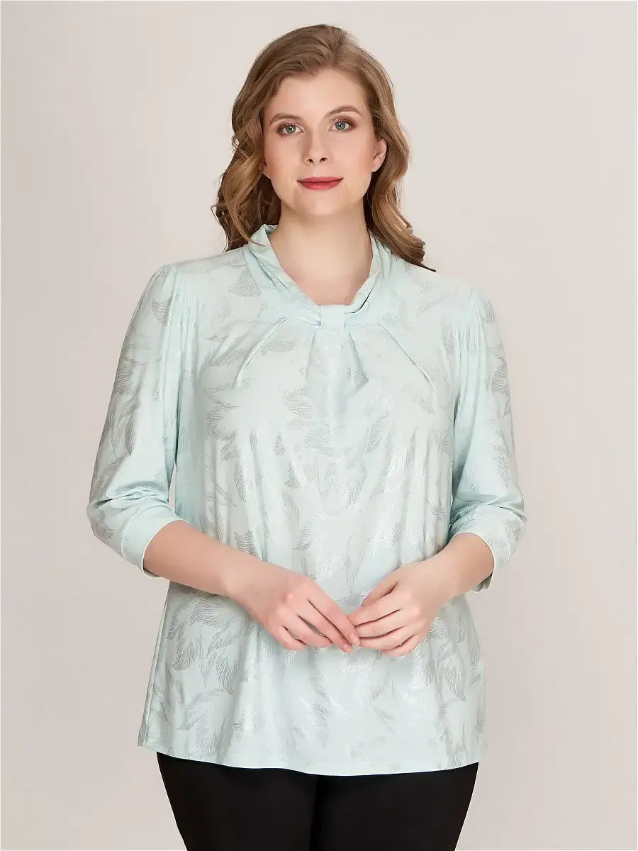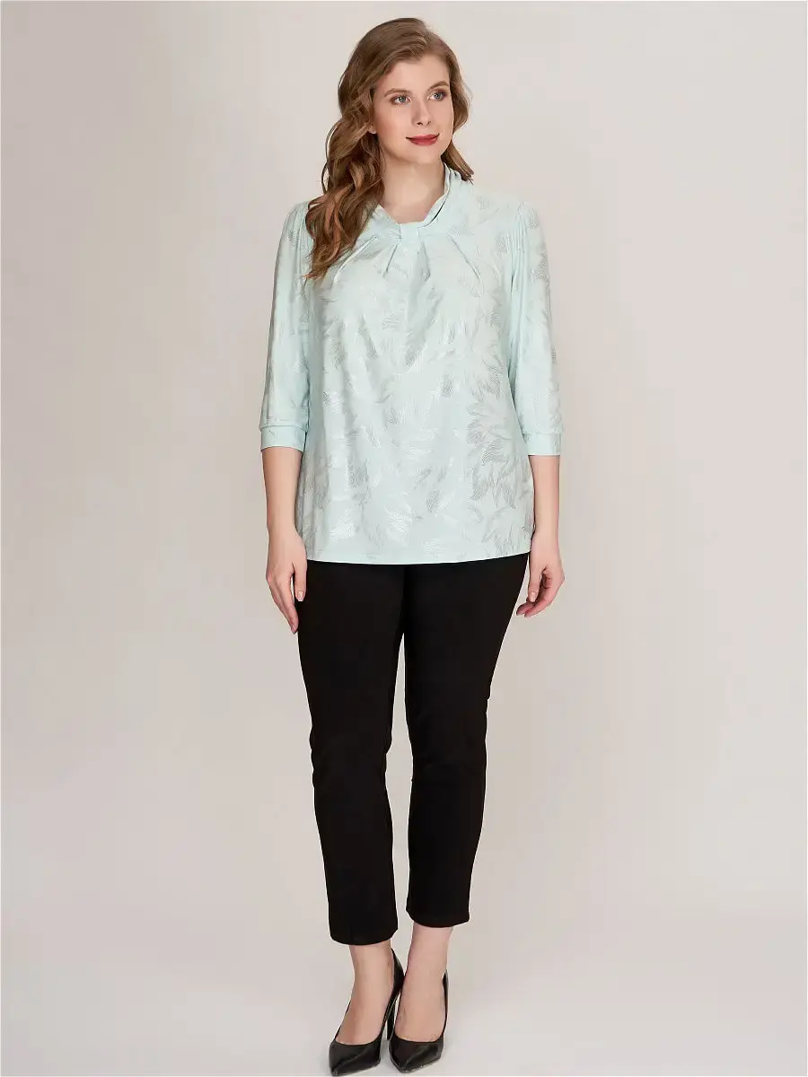Элегантная блузка из полотна масло с фойлом, с защипами на груди, фантазийным воротником стойкой, присборенными в плечах рукавами 3/4 на манжетах. Модель классического прямого кроя, лаконичная и сдержанная. Может быть повседневной и нарядной. Визуально удлиняет шею, подчеркивает красоту запястья, уравновешивает фигуру. Длина изделия по спинке от 65см в р.48 до 70,5см в р.70, длина рукава 42,5см.