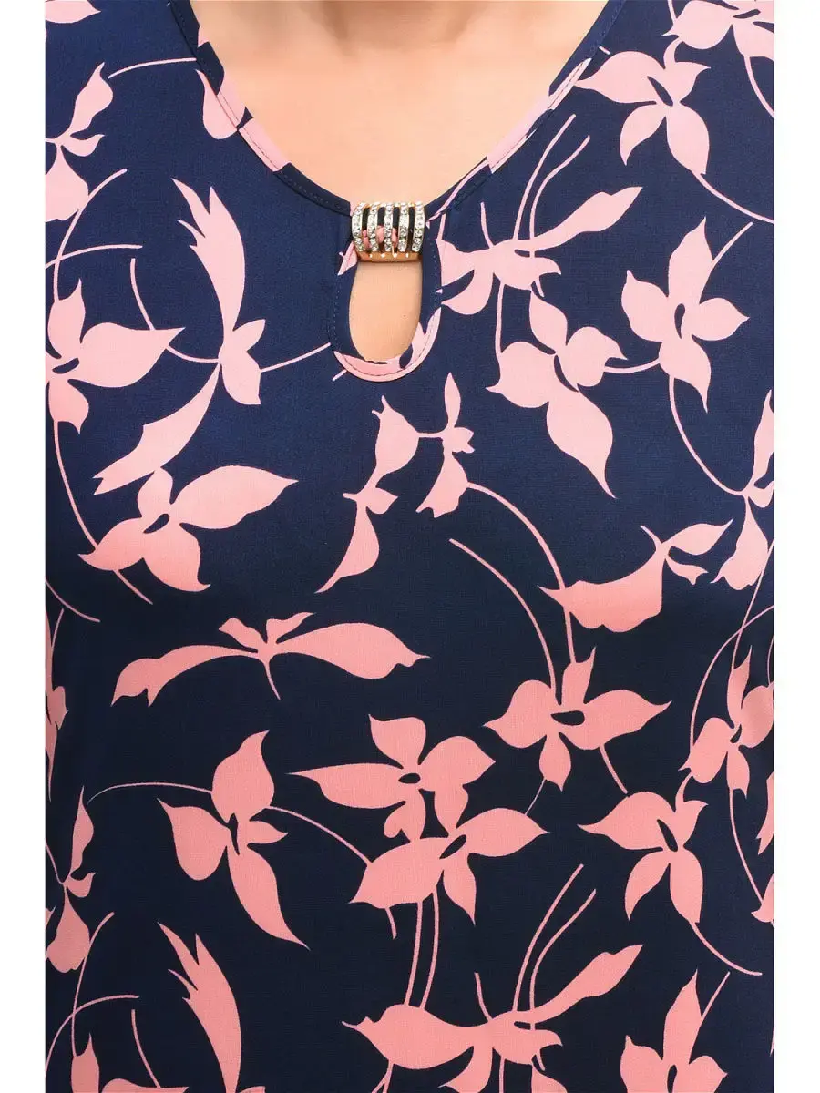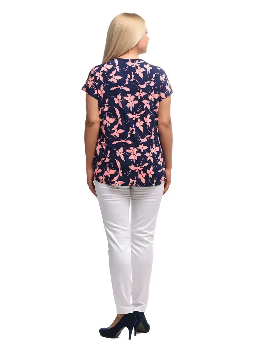 Стильная женская футболка pluse size с коротким рукавом. Выполнена из принтованного трикотажа масло. Спереди горловина декорирована украшением со стразами. Длина футболки по спинке от 73,5см в 48 размере до 79 см в 70 размере.