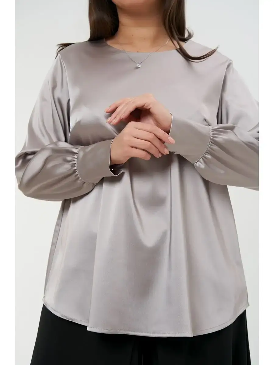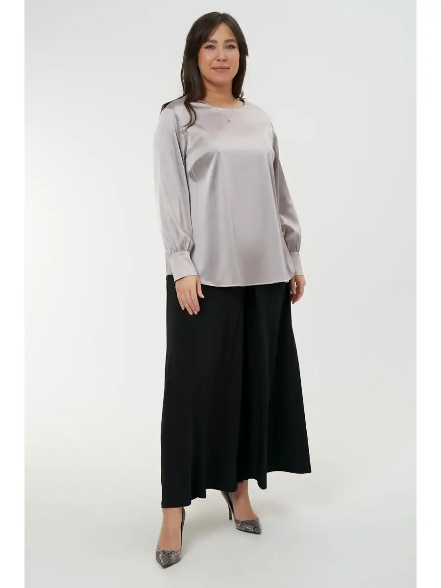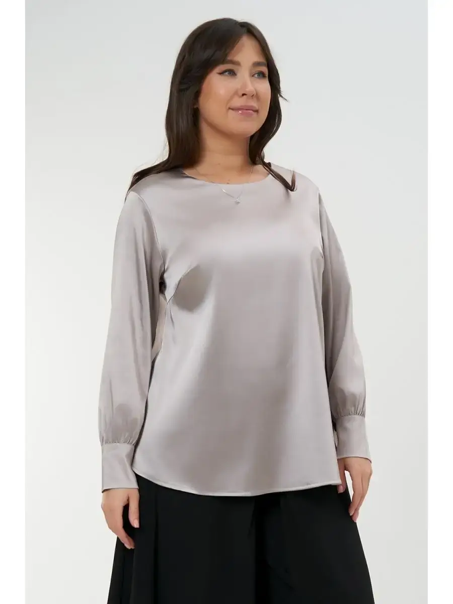 Женская блузка больших размеров прямого кроя с длинным рукавом на манжете. Выполнена из плотного атласа с эластаном.Длина по спинке во всех размерах от 50 до 70 составляет 70см.