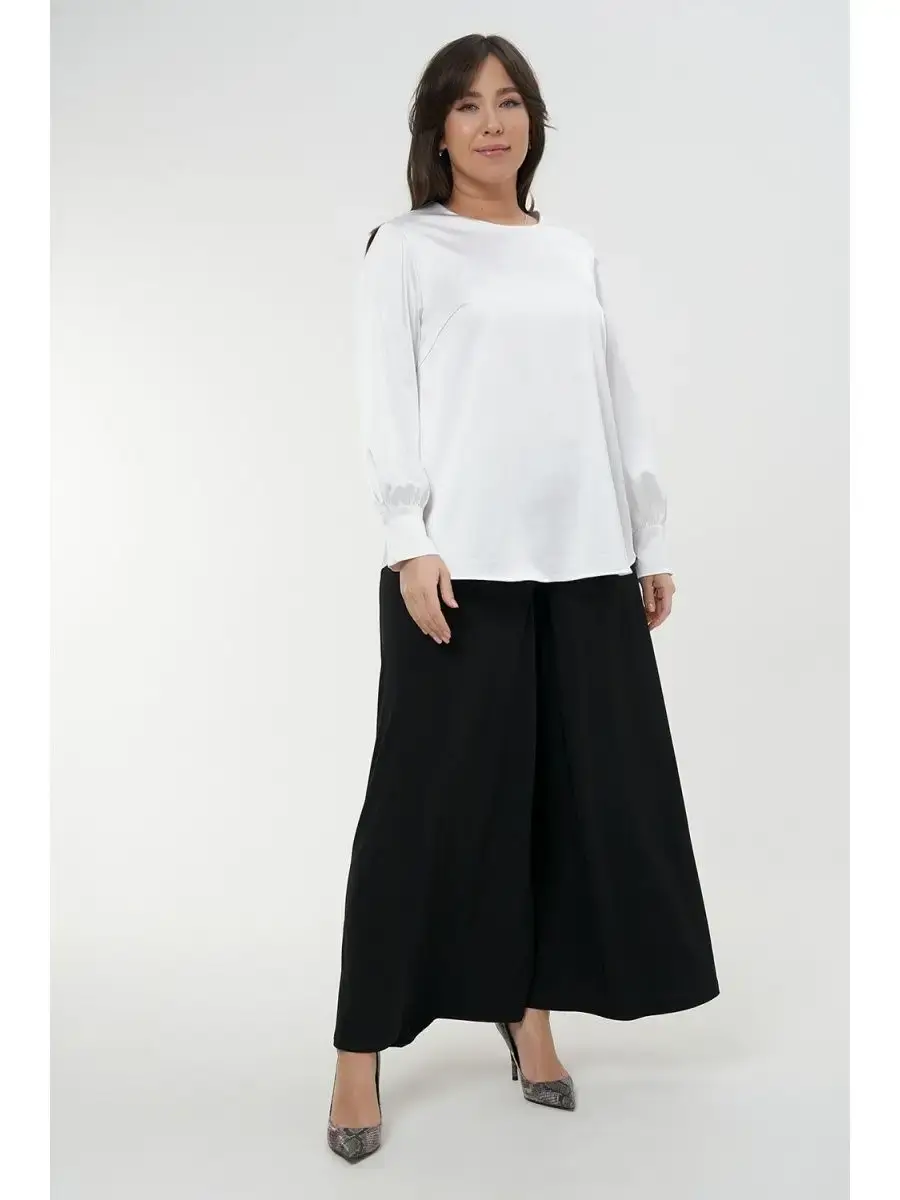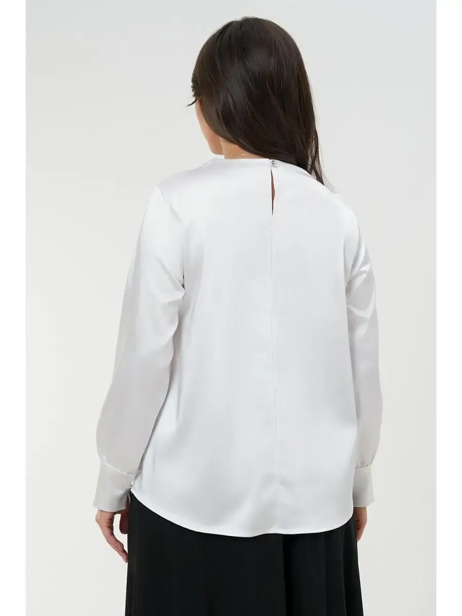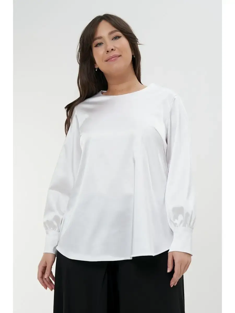 Женская блузка больших размеров прямого кроя с длинным рукавом на манжете. Выполнена из плотного атласа с эластаном.Длина по спинке во всех размерах от 50 до 70 составляет 70см.