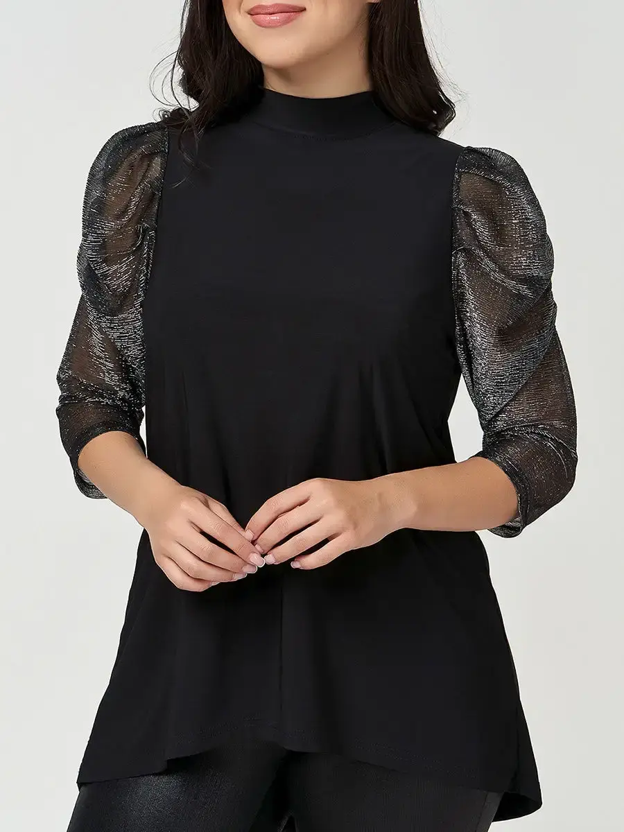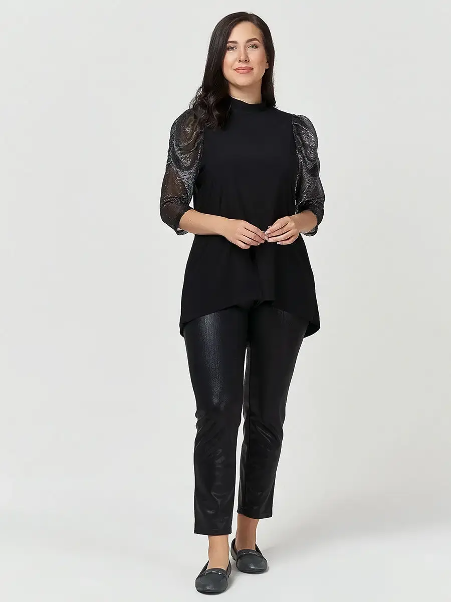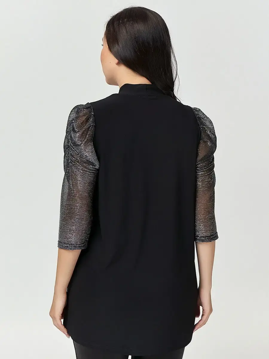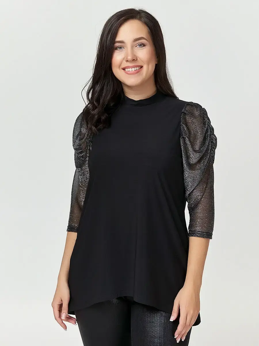 Блузка женская, однотонная, из трикотажного полотна по типу масло. Перед и спинка цельнокроеные. Воротник стойка, рукав втачной, со сборкой, отличающийся от основной ткани, с блестками. Длина рукава до локтя. Длина изделия по спинке от 80,5см в р.48 до 85,5 в р.68, длина рукава 45см.