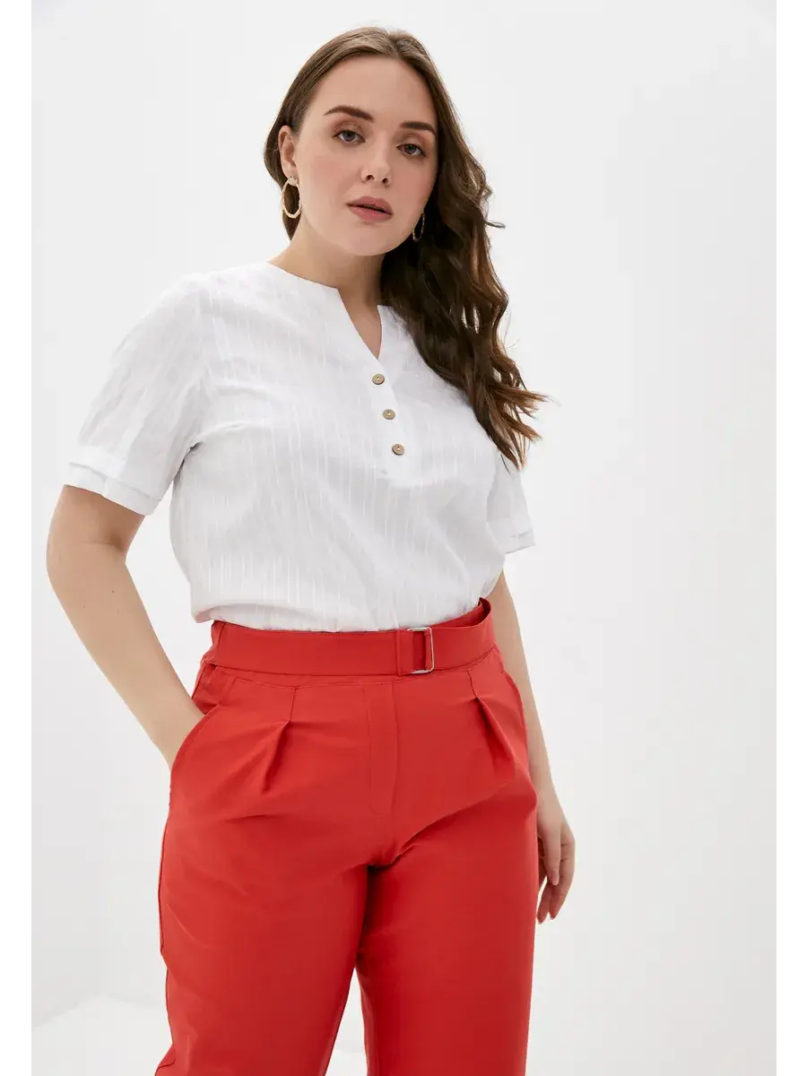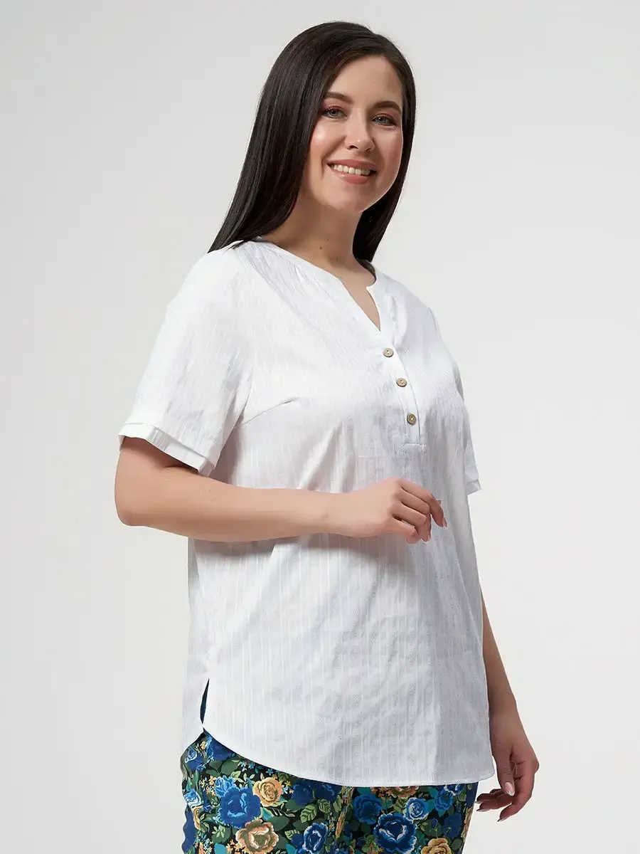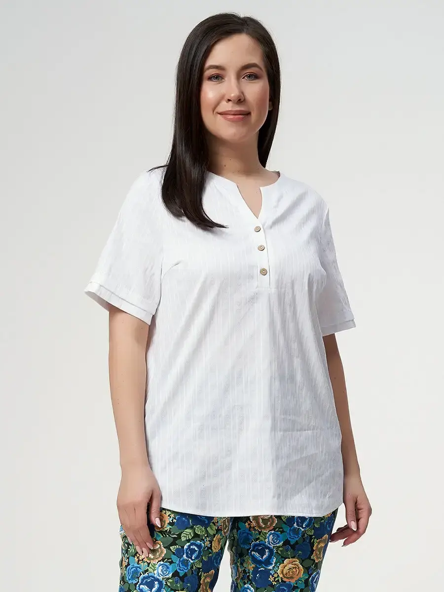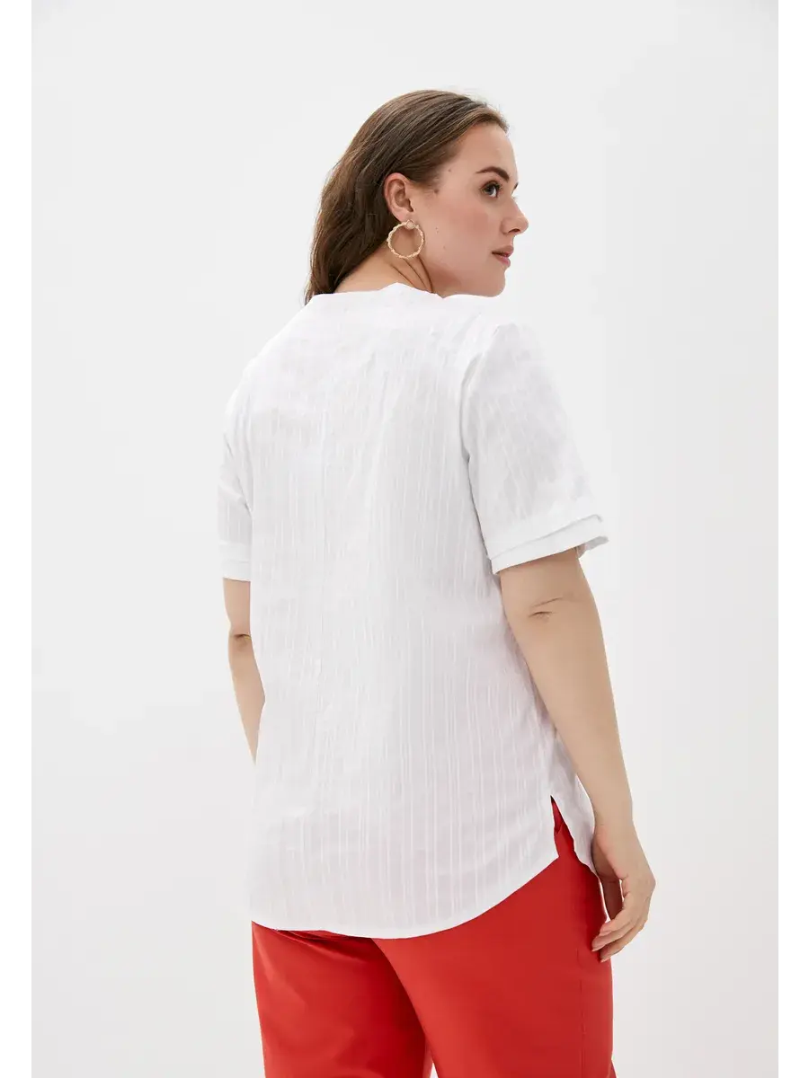 Женская нарядная блузка, прямого силуэта, выполненная из мелко узорчатой ткани в полоску. Перед цельным с вытачкой из бокового шва и с разрезом на горловине, обработанный планкой. Спинка со средним швом. Рукав втачной одношовный, с декоративной отделкой по линии низа. Длина изделия до бёдер. Низ изделия фигурный с боковыми разрезами. Длина изделия по спинке от 72,5см в р.48 до 78см в р.70, длина рукава 30см.