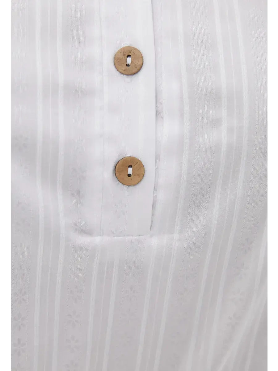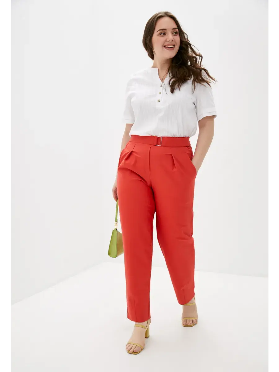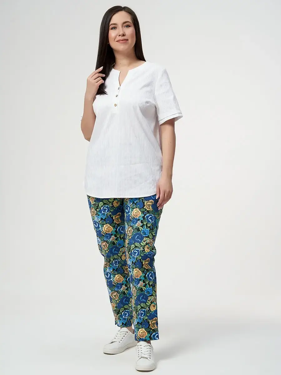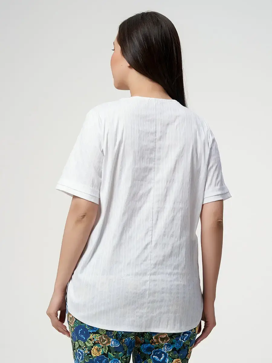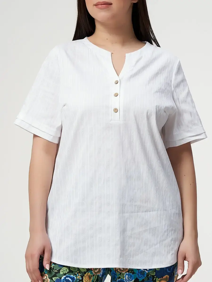 Женская нарядная блузка, прямого силуэта, выполненная из мелко узорчатой ткани в полоску. Перед цельным с вытачкой из бокового шва и с разрезом на горловине, обработанный планкой. Спинка со средним швом. Рукав втачной одношовный, с декоративной отделкой по линии низа. Длина изделия до бёдер. Низ изделия фигурный с боковыми разрезами. Длина изделия по спинке от 72,5см в р.48 до 78см в р.70, длина рукава 30см.