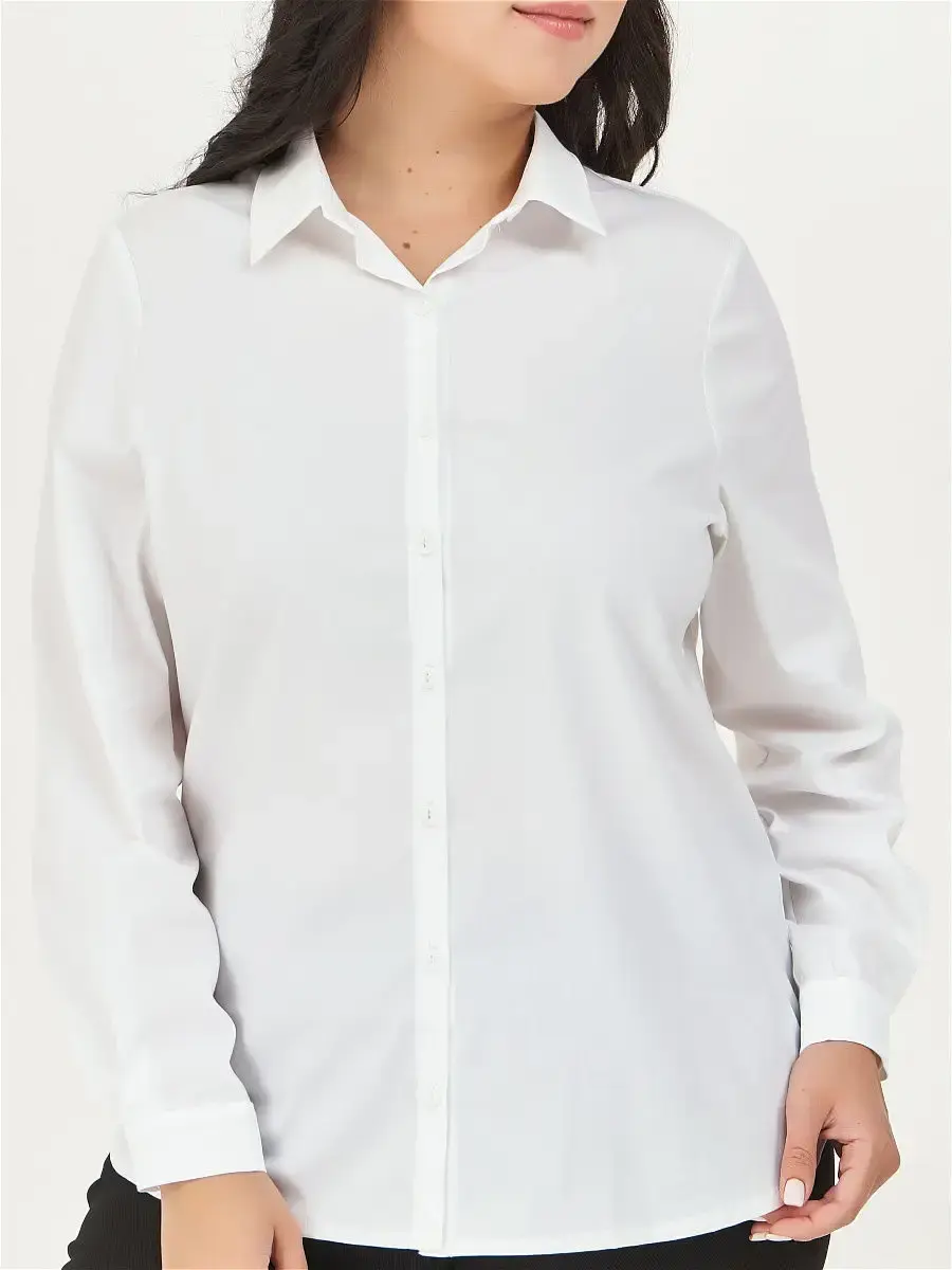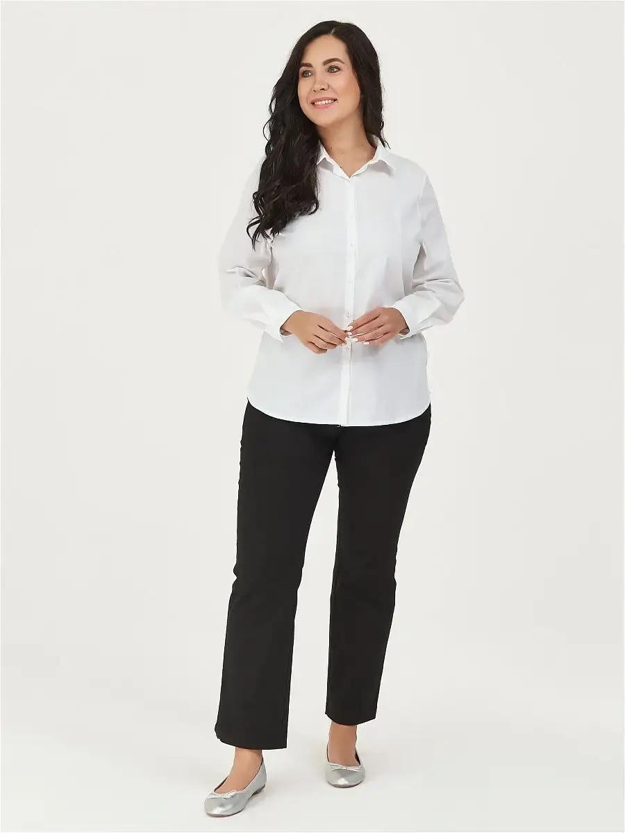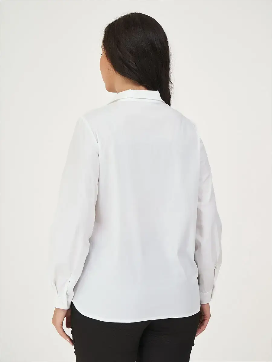 Блузка прямого силуэта свободной формы из однотонной хлопчатобумажной ткани. Рукав одношовный рубашечного типа, низ рукава оформлен манжетой с разрезом и двумя односторонними складками. Длина изделия по спинке от 67см в р.48 до 72,5см в р.70, длина рукава 62см.