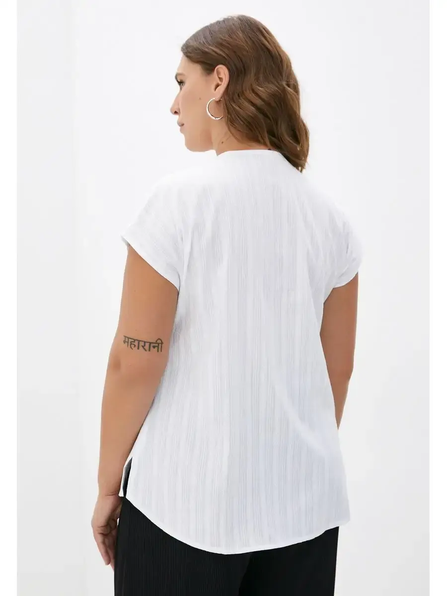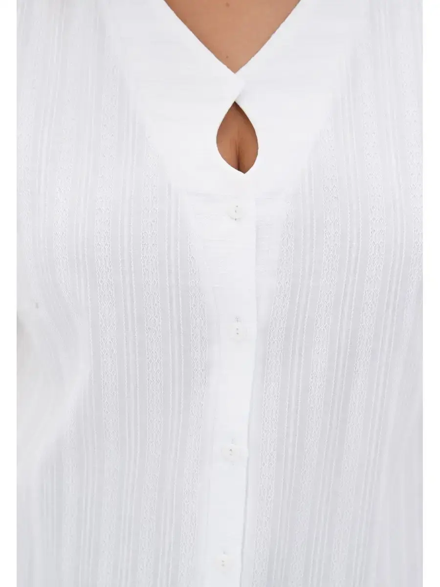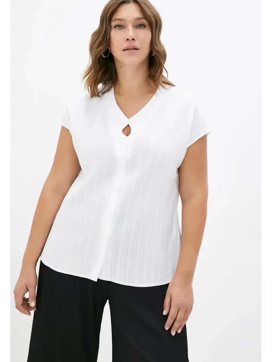 Женская блузка из 100% хлопка, с коротким цельнокроенным рукавом, застежка на пуговицы, выполнена из фактурного текстиля. Блузка имеет необычный вырез горловины.