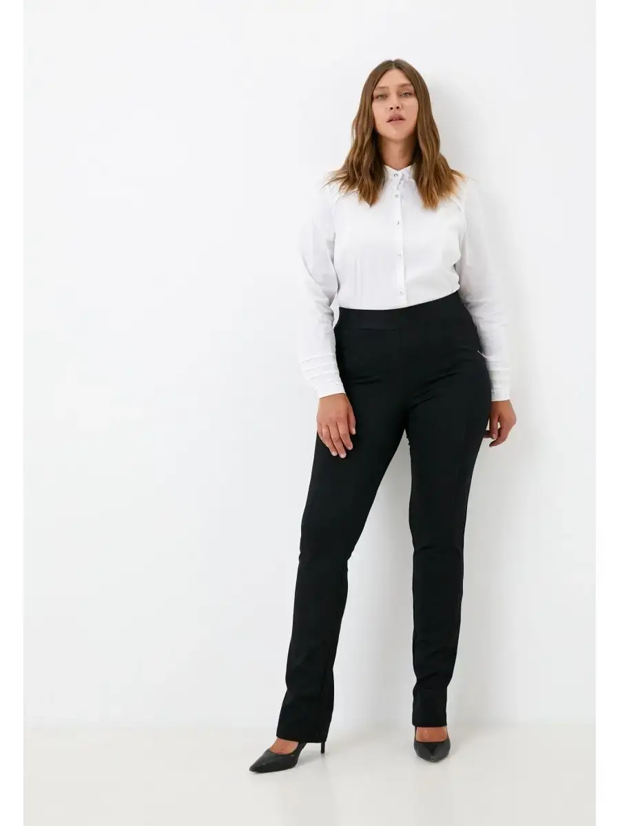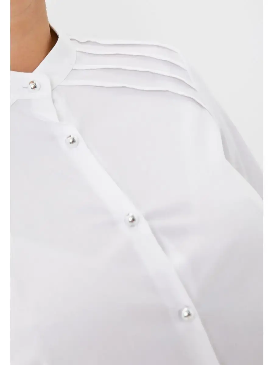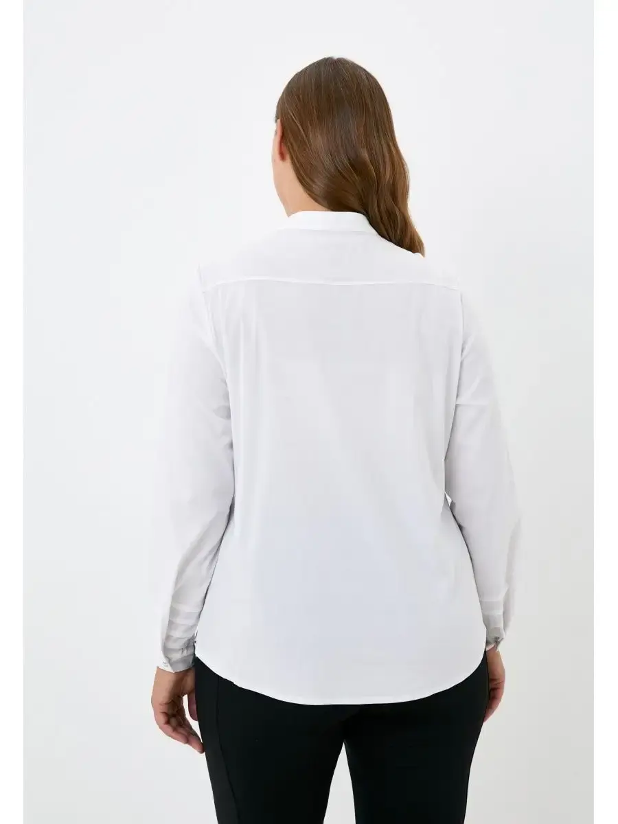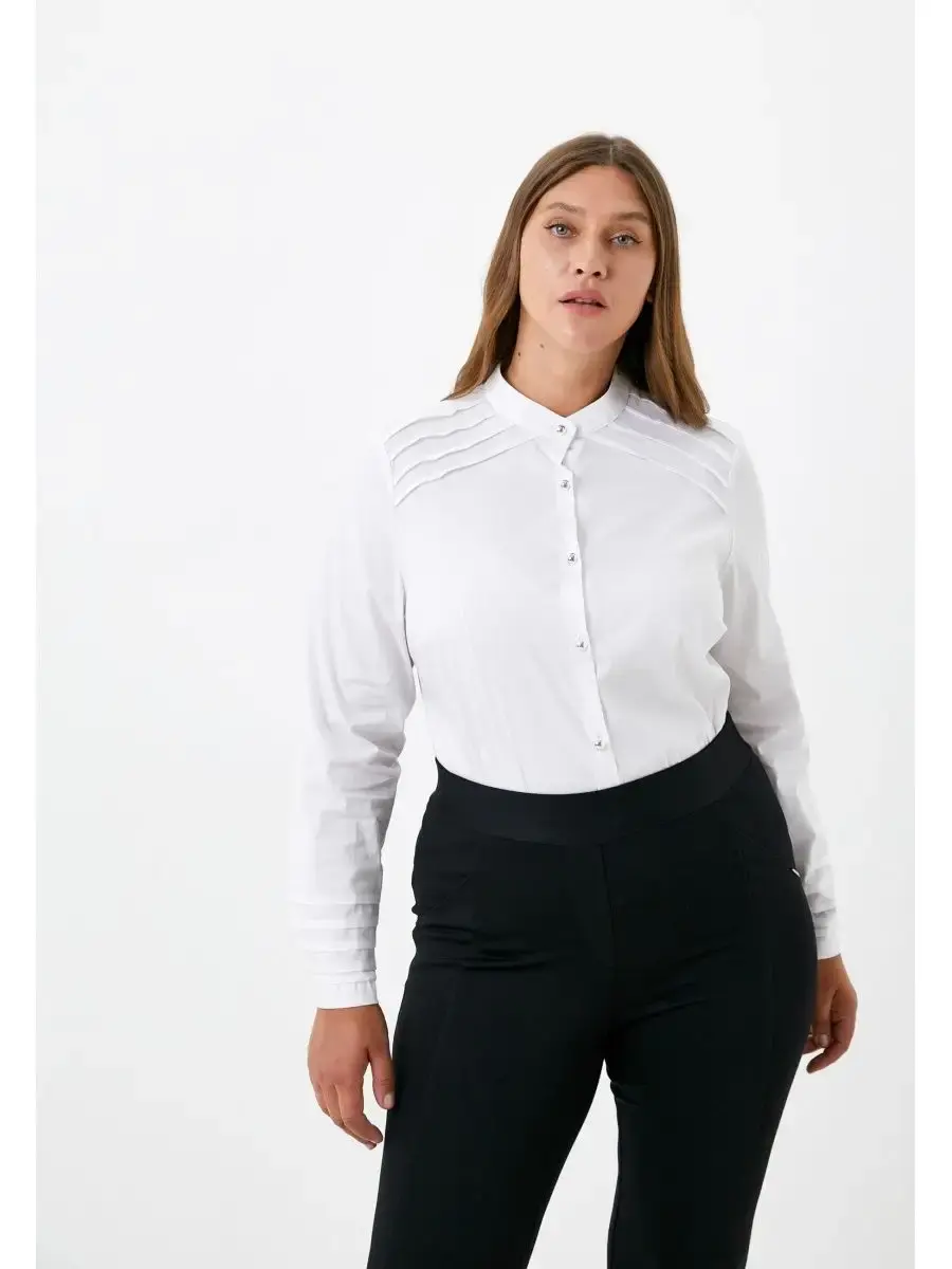 Стильная офисная блуза-рубашка с воротником-стойкой и рубашечной застежкой на блестящих пуговицах. Изделие декорировано прошивкой на широких рукавах с манжетами, которая рифмуется с такой же прошивкой на плечах и придает модели сдержанно-нарядный вид. Прямой крой, подчеркнутая линия плеча позволят выглядеть уместно в деловой обстановке, но при этом не терять женственности и элегантности. Длина изделия по спинке от 65,5см в р.48 до 71см в р.70 (к каждому размеру плюс 0,5см) длина рукава 62см.