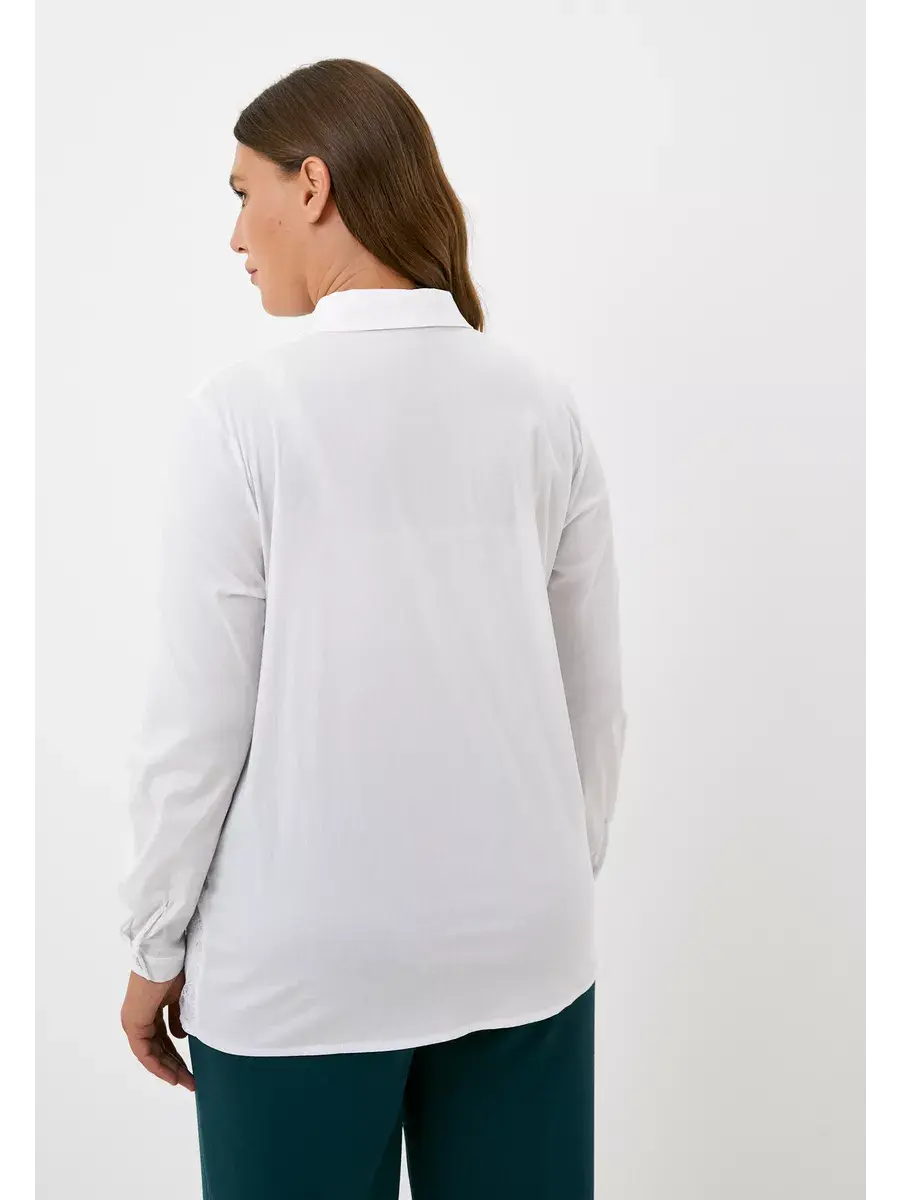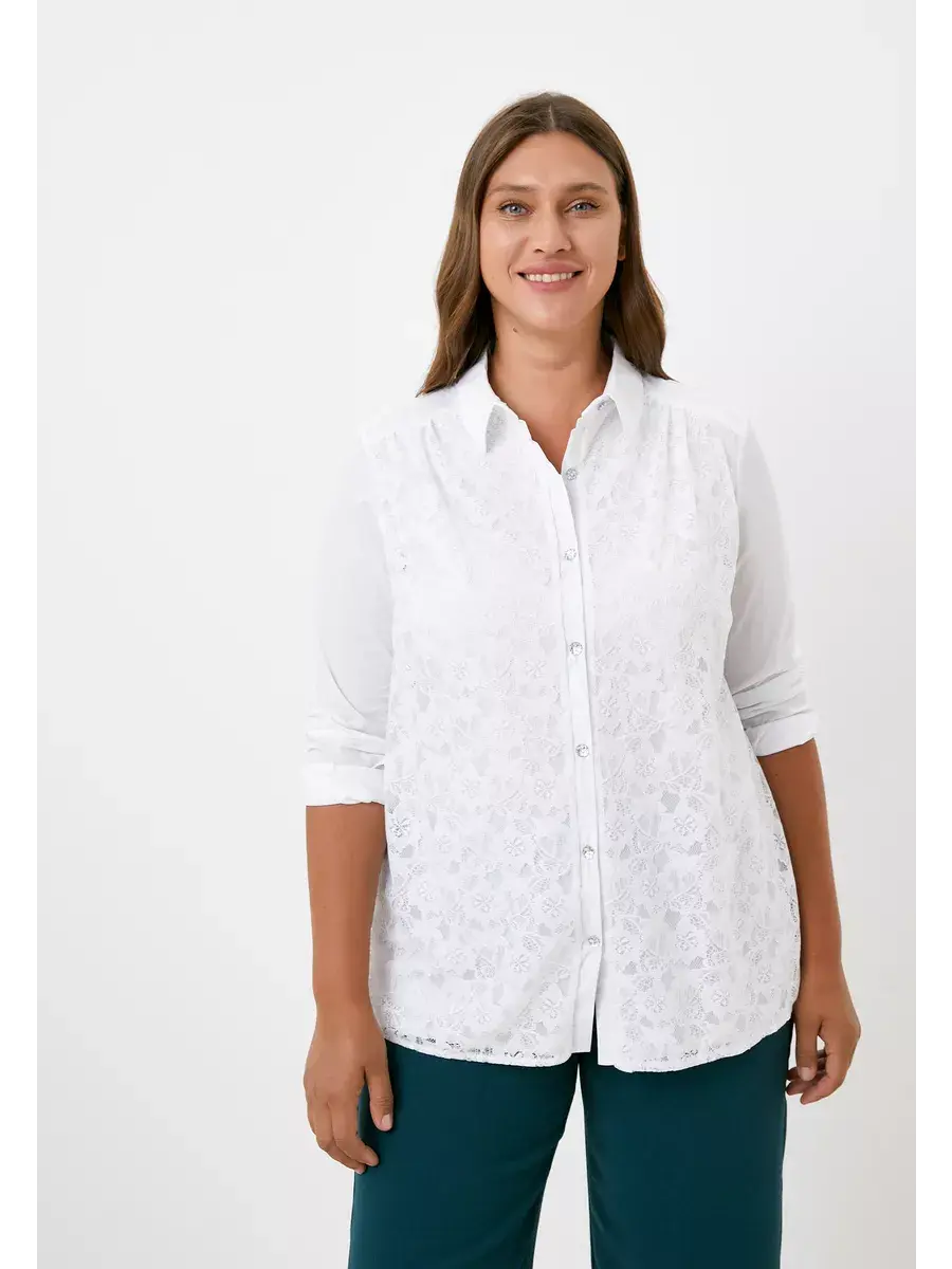 Нарядная офисная блуза с подчеркнутой линией плеча, деловым воротником-кент и кокетливым гипюровым декором спереди изделия. Застежка и манжеты украшены пуговицами - стразами, придающими модели праздничный вид. Отличный выбор для женщин с любым типом фигуры, желающих выглядеть одновременно строго и притягательно. Классическая офисная блуза для деловых леди, предпочитающих официозу элегантность и кокетство. Стильная рубашка имеет очень красивый воротничок с v-образным вырезом. Блуза с застежкой на пуговицы на планке. Длина изделия по спинке от 70см в р.48 до 75,5см в р.70, длина рукава 60см. Эта красивая модель может стать основой не только делового, но и вечернего гардероба. Оригинальный дизайн органично объединил рафинированную классику с молодёжными нюансами: минимализм плюс лаконичность свежего монотона. Отлично подойдет для осени, зимы. Блузка женская офисная, белая рубашка больших размеров продуманного и универсального фасона, идеально подходящего под любой низ. Стильная женская блуза, прекрасно смотрится как в заправленном состоянии, так и на выпуск. Рубашка женская прекрасно сочетается с классическими брюками или юбками. С помощью этой элегантной женской блузки, можно обыграть любой образ. Блузка женская белая, однотонная с кружевом. Блузка однотонная белая блузка плюс сайз. Ткань хлопковая комфортная. Блузка женская большого размера офисный стиль, для школы, для работы, для торжественных мероприятий, подойдет к юбке, брюкам, джинсам и шортам и станет подходящим вариантом как вечерняя женская блузка. Классическая модель - необходимая одежда в гардеробе, потому что она универсальна и подходит абсолютно на все случаи жизни - в школу, офис, работу. Впишется в классический, строгий, кэжуал, спортивный и бохо стиль для фигуры любого типа – полных женщин пышных форм, а так же отлично подойдет как блузка для беременных. Универсальная вещь для любого роста – на высоких и невысоких девушек, женщин и взрослых дам.