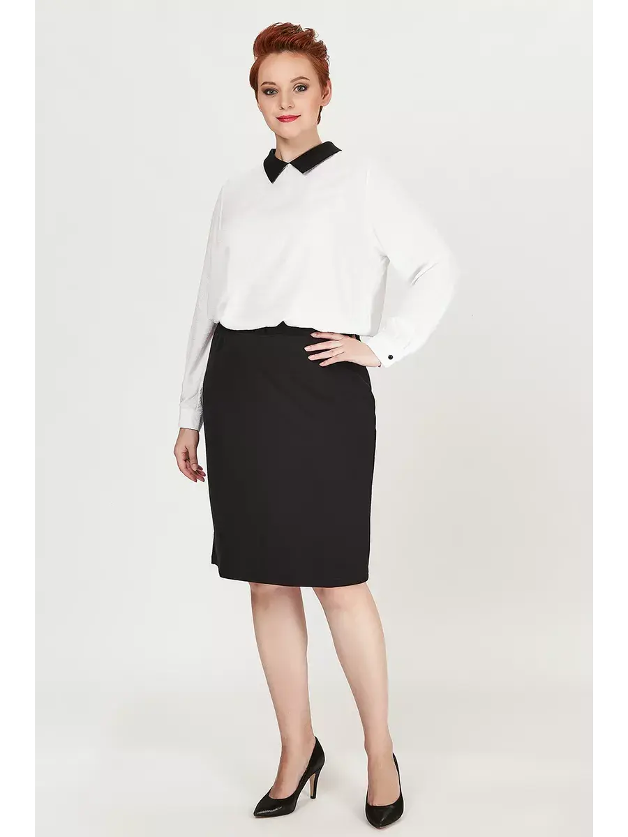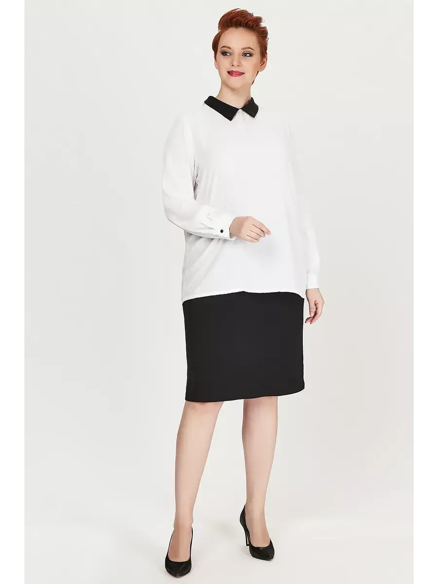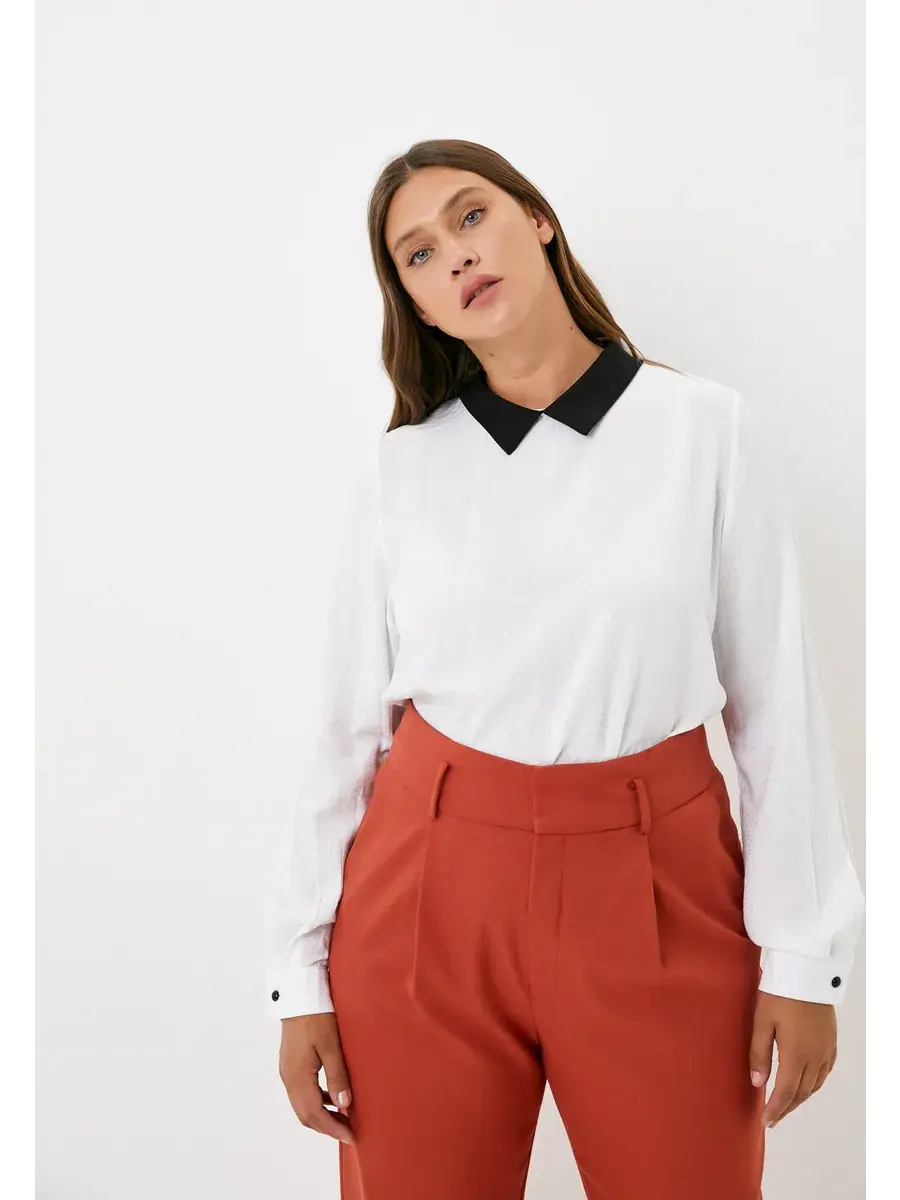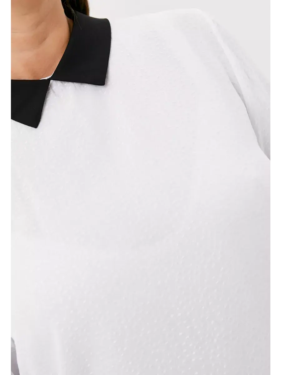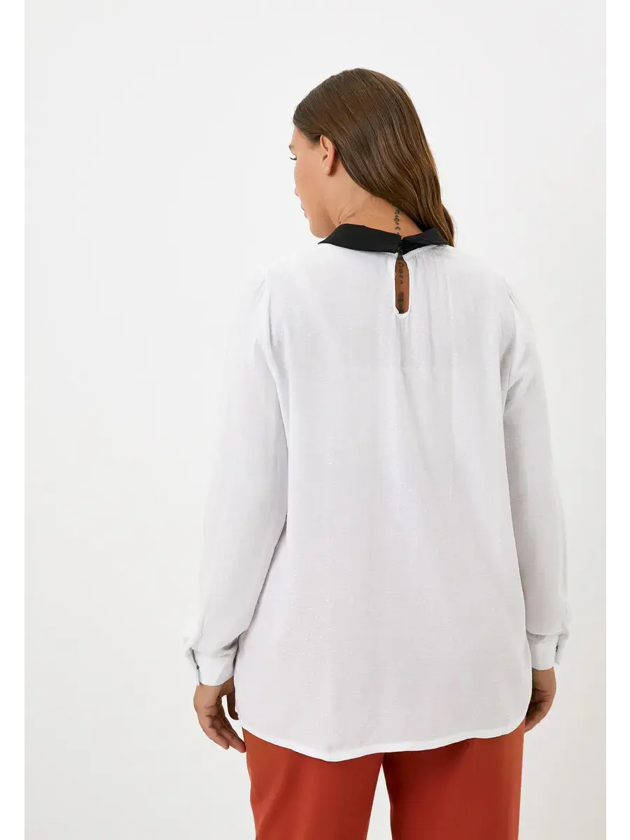Стильная офисная блуза белого цвета с черным отложным воротником на застежке капле сзади, длинными рукавами на манжетах, застегивающимися на черные пуговицы. Длина изделия по спинке от 67см в р.48 до 71,5см в р.66, длина рукава 61см.