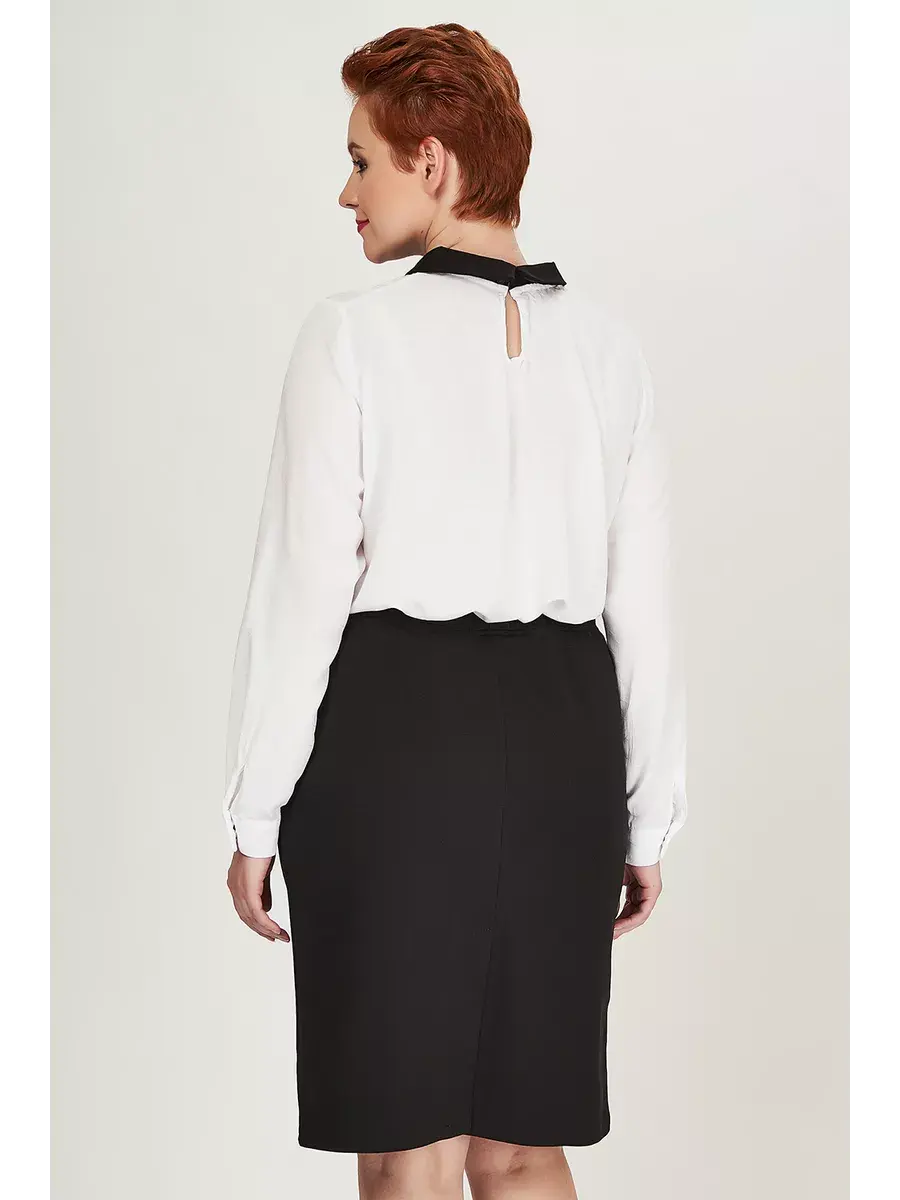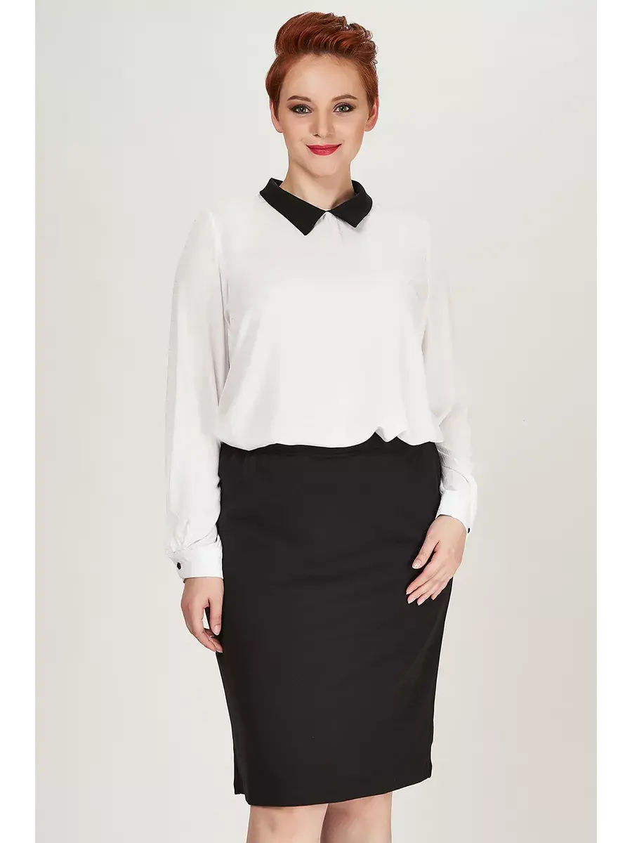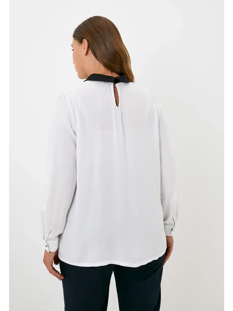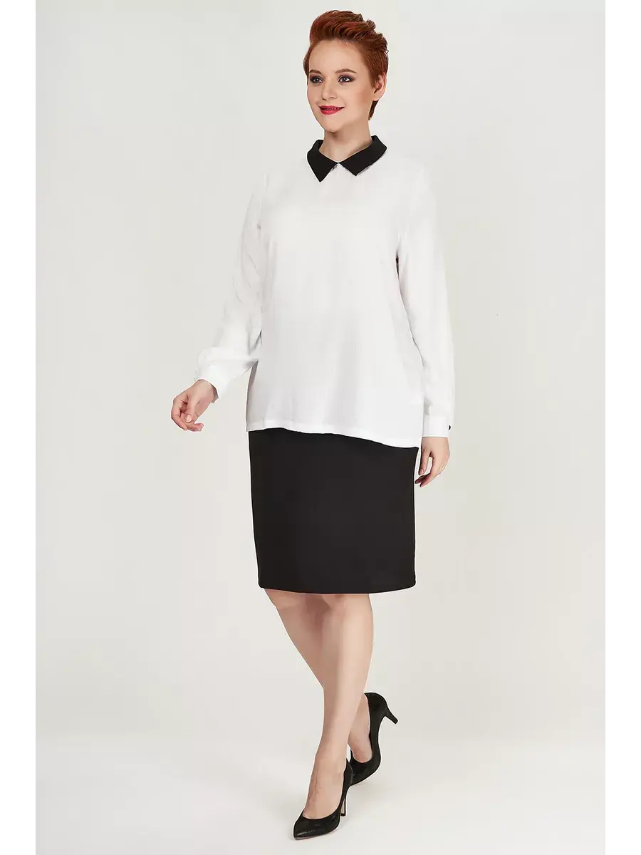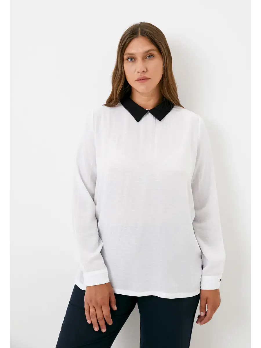 Стильная офисная блуза белого цвета с черным отложным воротником на застежке капле сзади, длинными рукавами на манжетах, застегивающимися на черные пуговицы. Длина изделия по спинке от 67см в р.48 до 71,5см в р.66, длина рукава 61см.
