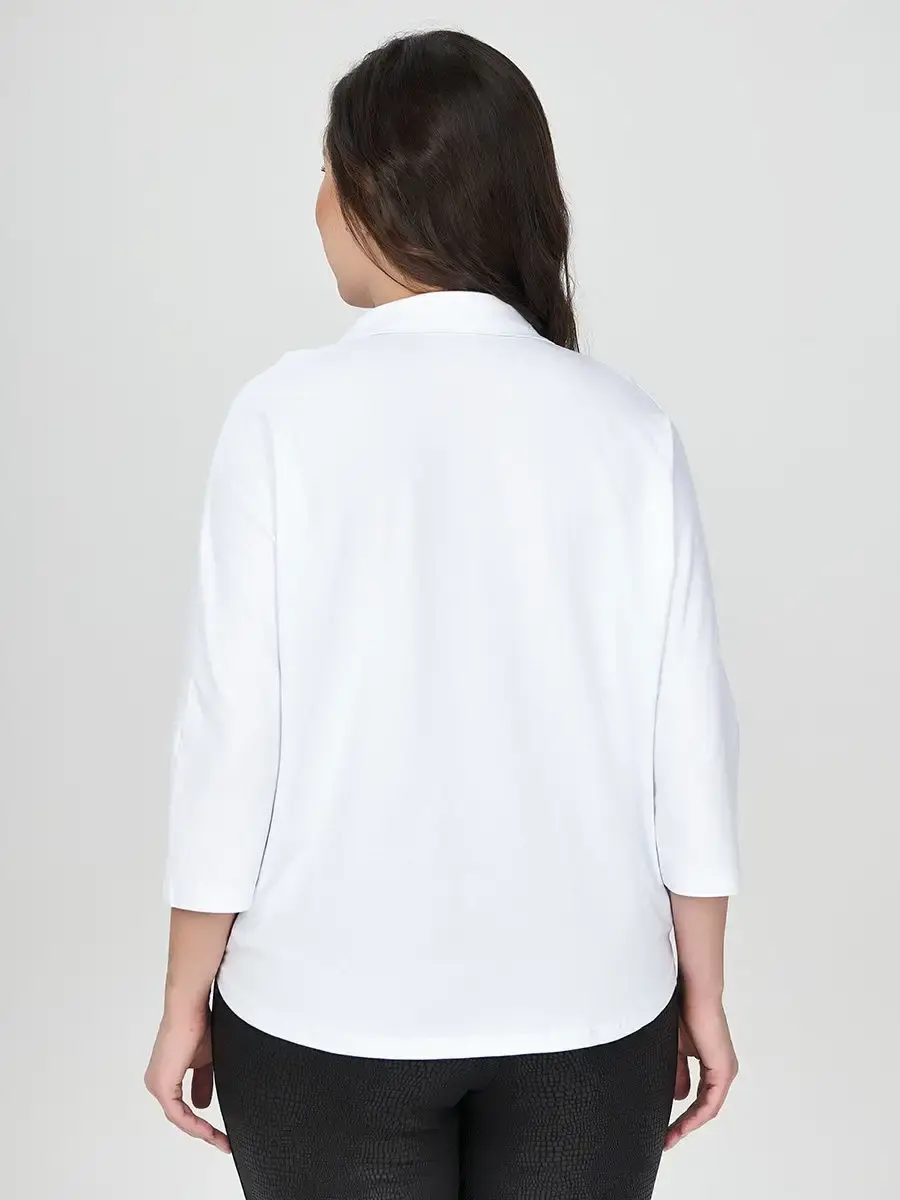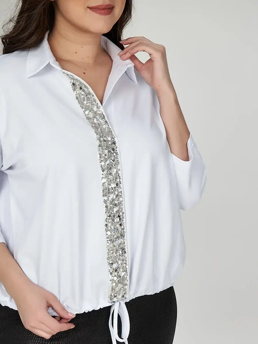Нарядная блуза из струящегося трикотажа прямого кроя со стильной планкой вдоль застежки, расшитой пайетками. Завязки по низу блузки позволяют регулировать ее объем и длину, соответственно особенностям фигуры и выбранному образу. Комфортный рукав-доломан длиной 3/4 подчеркивает красоту рук.Длина изделия по спинке от 69,5см в р.48 до 75см в р.70, длина рукава 45см.