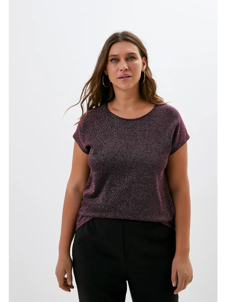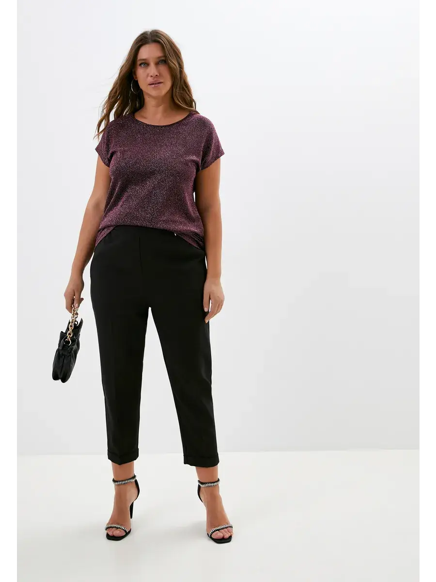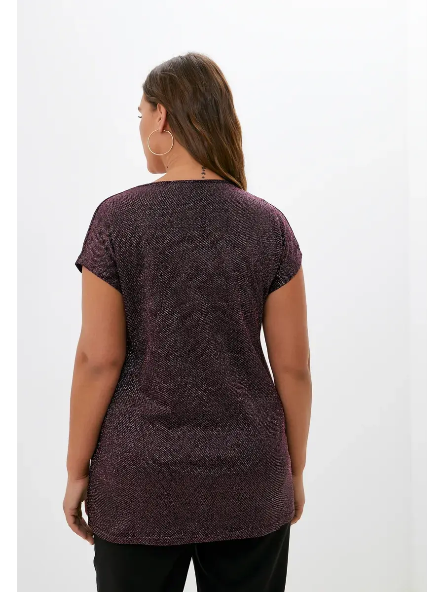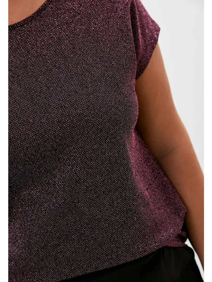 Женская нарядная блузка большого размера от бренда OLSI выполнена из полотна с люрексом. Модель прямого кроя, без рукавов и со спущенной проймой. Длина изделия по спинке от 74см в р.52