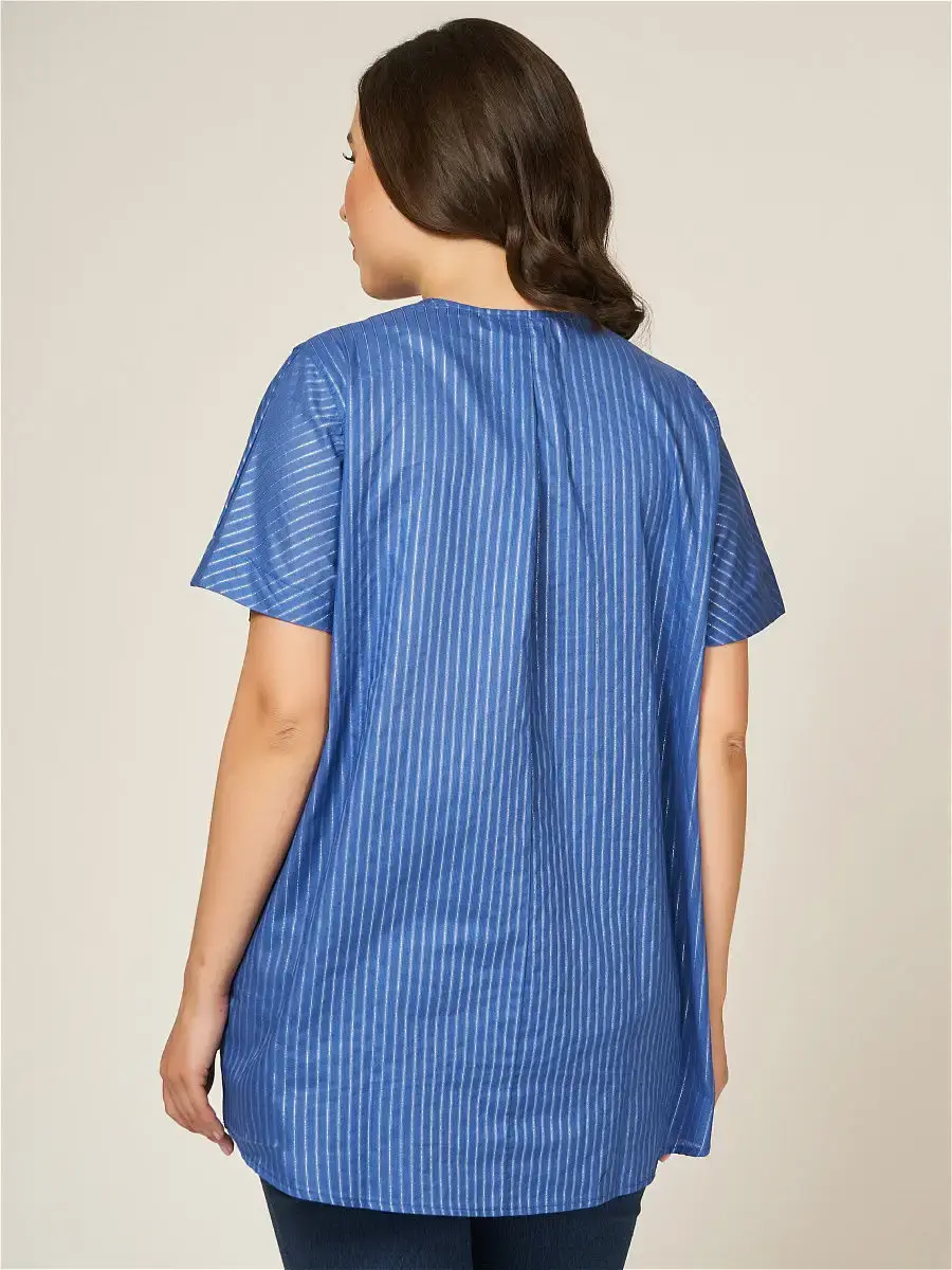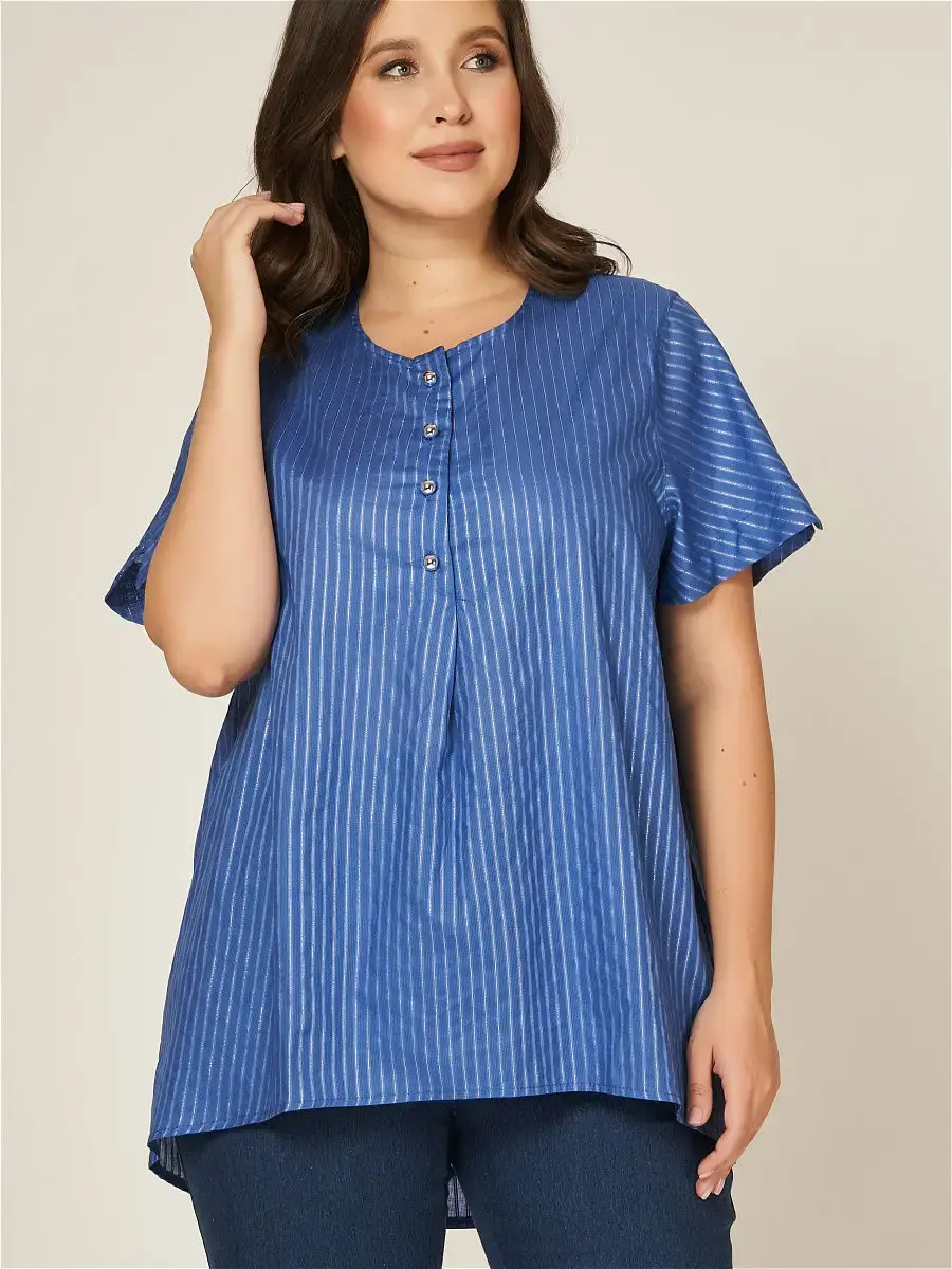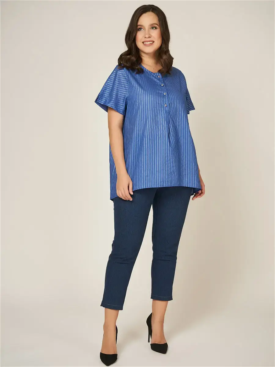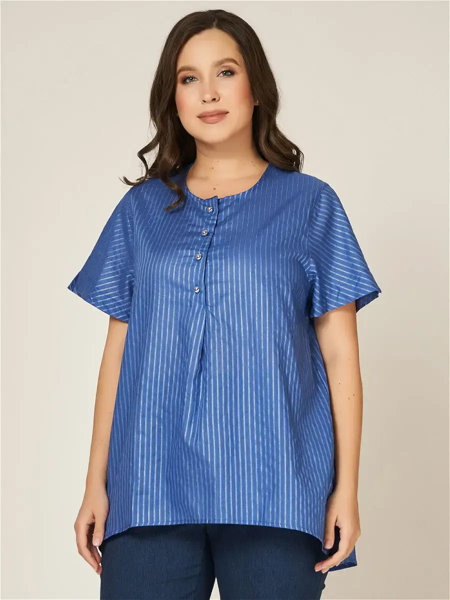 Летняя легкая блузка из тонкой хлопковой ткани А-силуэта в тонкую вертикальную полоску с округлым вырезом и короткими рукавами. Модель на застежке до середины груди с декоративными пуговицами-бусинами. Изделие хорошо корректирует фигуру, позволяет даже в жару чувствовать себя свежо, свободно и непринужденно. Длина изделия по спинке от 79см в р.48 до 84,5см в р.70.