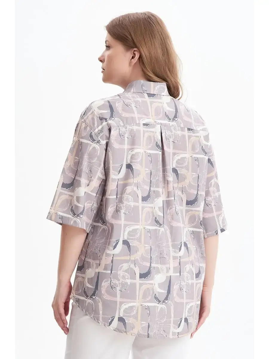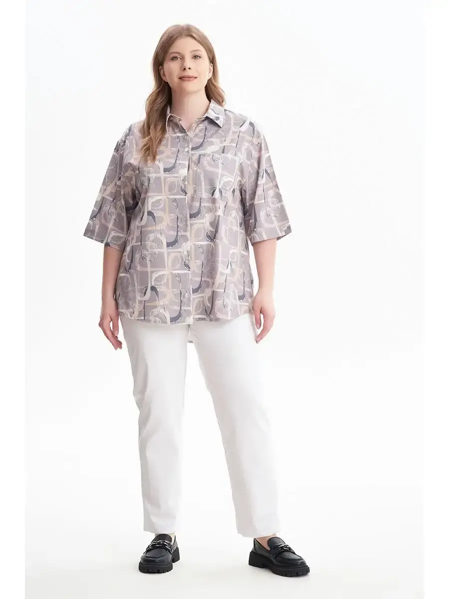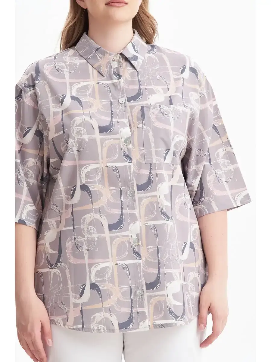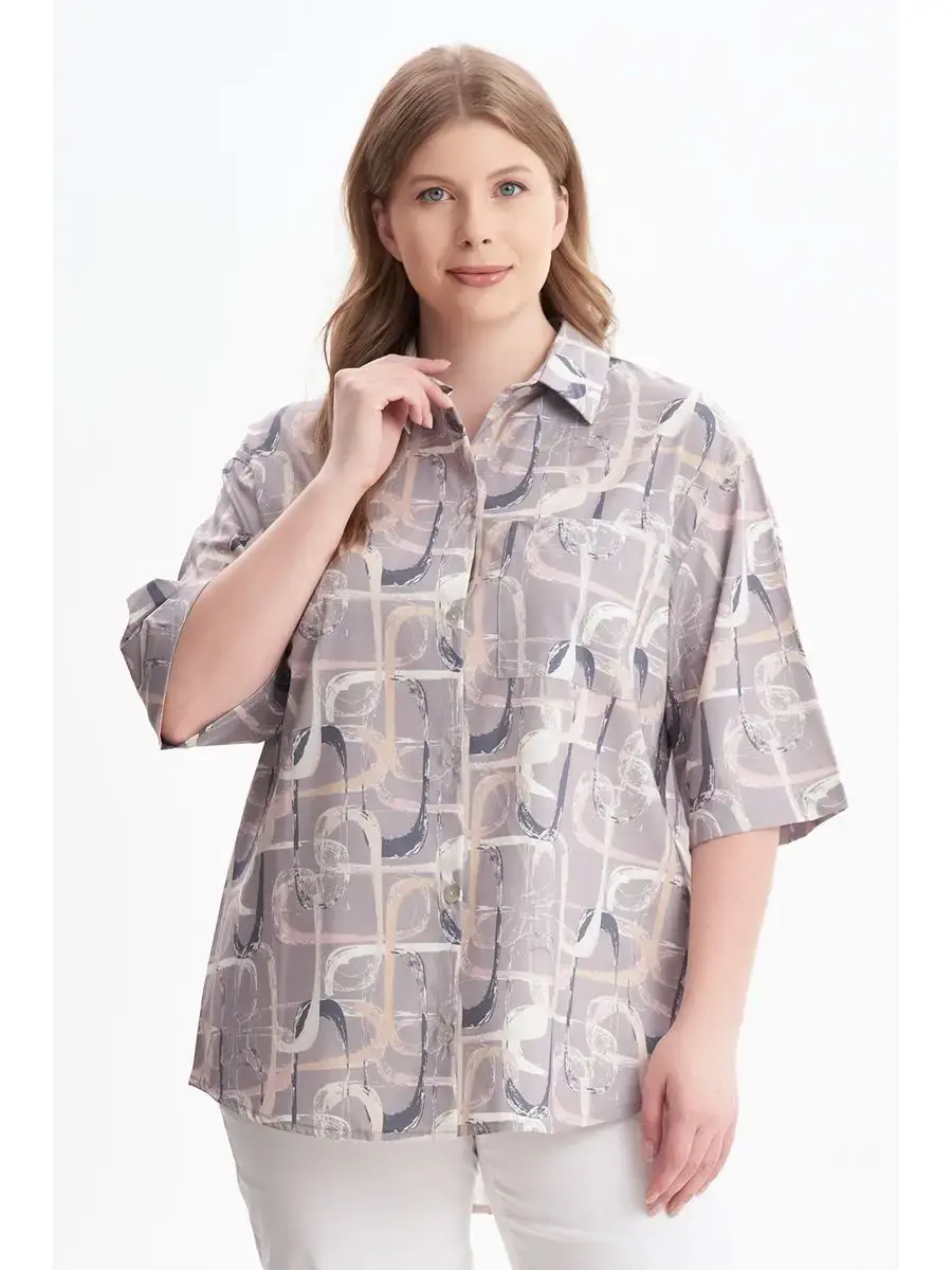 Женская блузка-рубашка больших размеров, отложной воротник, с карманами на груди. Рукава длиной до локтя. Выполнена из тонкого эластичного струящегося полотна по типу искусственного шёлка. Отличный вариант в офис и как повседневная одежда.