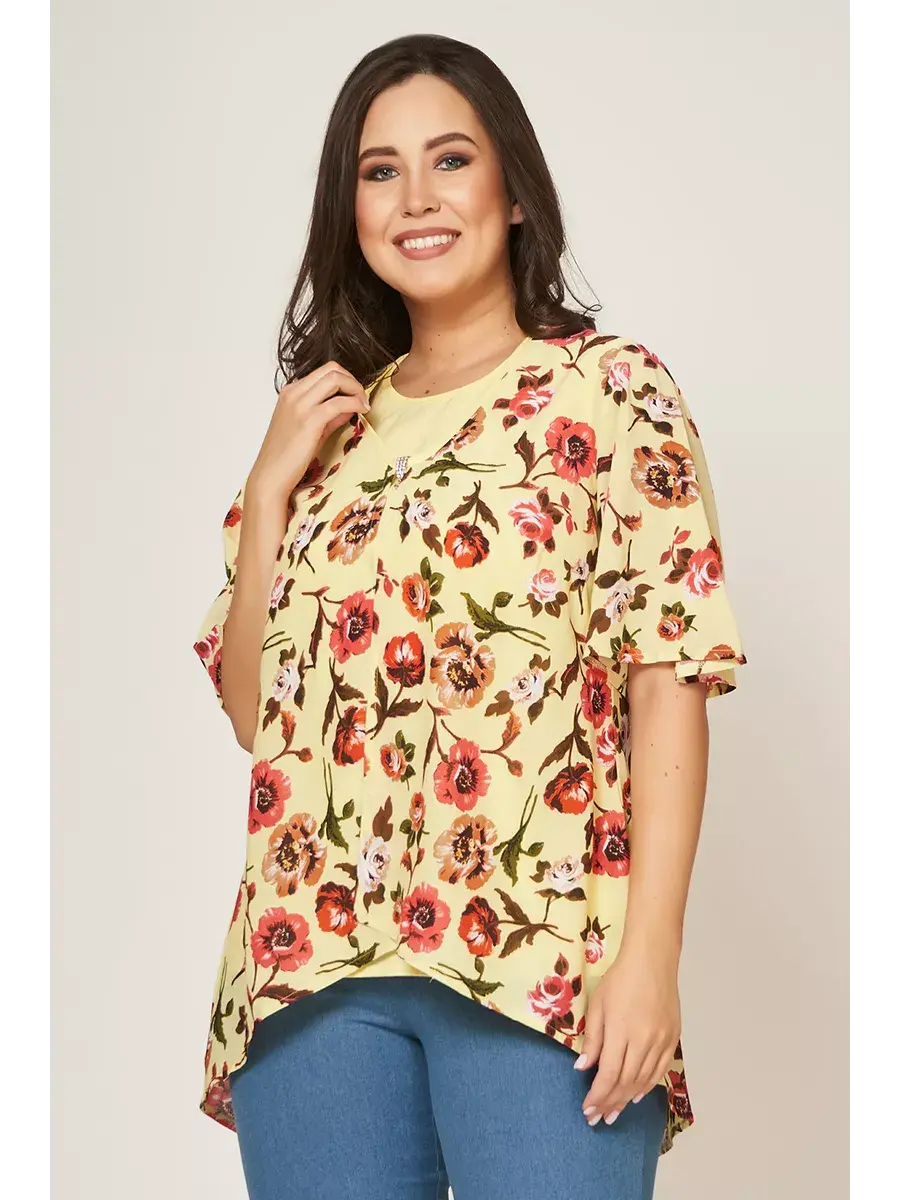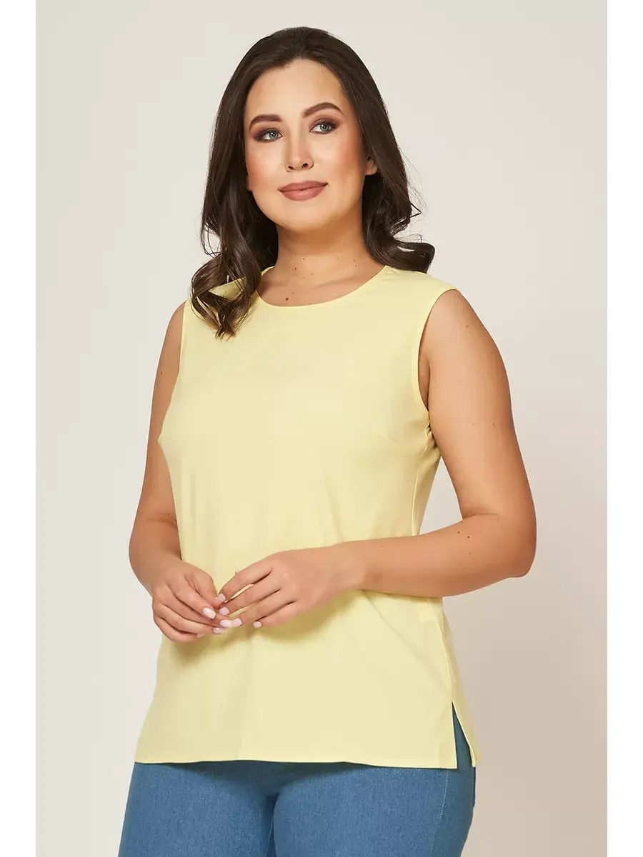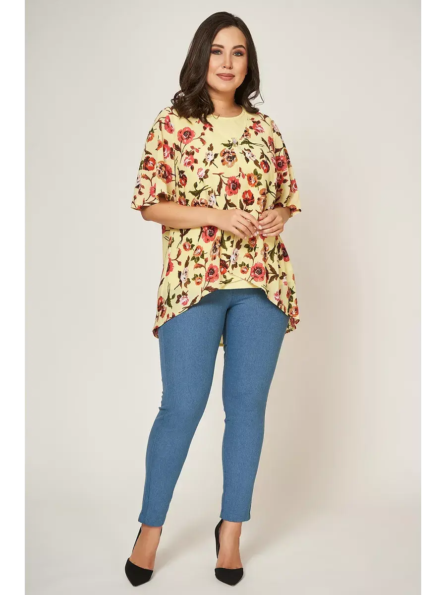 Легкий летний комплект женский больших размеров состоит из топа без рукавов и верхней блузки-накидки. Верхняя блузка без застежки, одевается через голову. Комплект выполнен из мягкого текстильного материала. Майку и накидку можно носить по-отдельности.
