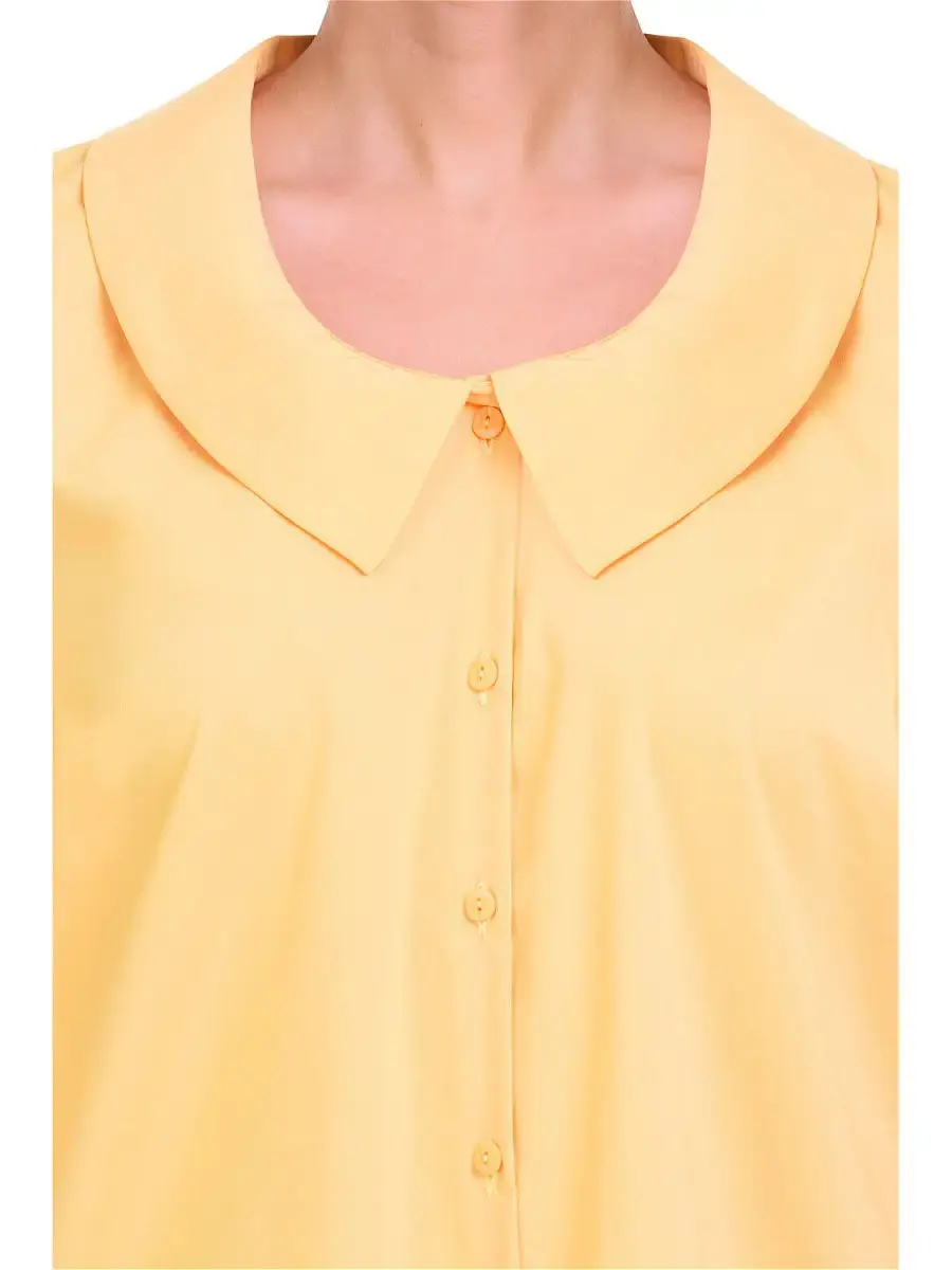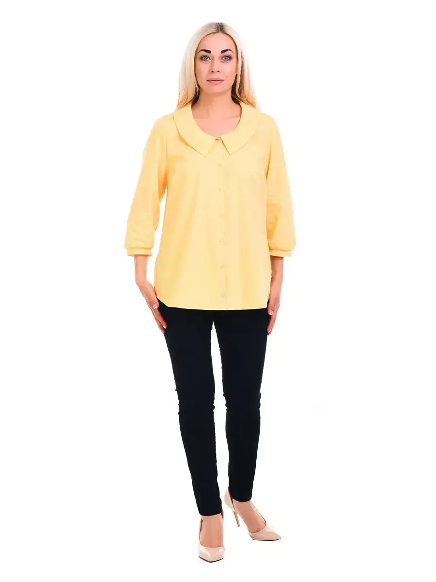 Элегантная хлопковая блуза с глубоким круглым вырезом, отложным воротником с закругленными уголками, рубашечной застежкой и рукавами, подхваченными манжетами, приоткрывающими запястье. Вариант деловой одежды отлично подходит также для вечернего выхода, например, в театр или ужина в ресторане. Визуально удлиняет шею, делая образ изящным.