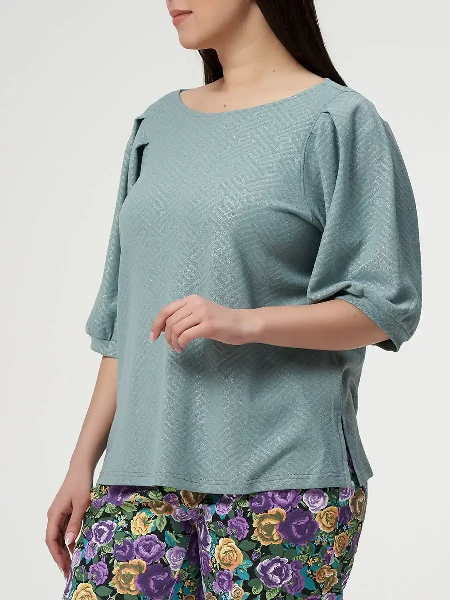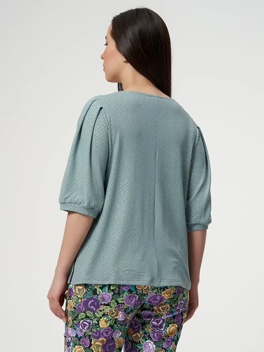 Женская повседневная блузка, прямого силуэта, выполненная из мелко узорчатой ткани в полоску с блестками. Спинка со средним швом. Рукав втачной одношовный, длинной до локтя, с 4мя складками, сборкой на нижней части рукава и притачной манжетой. Небольшой разрез по боковым линиям, длинной до бедер. Длина изделия по спинке от 65см в р.48 до 70,5см в р.70, длина рукава 43см.