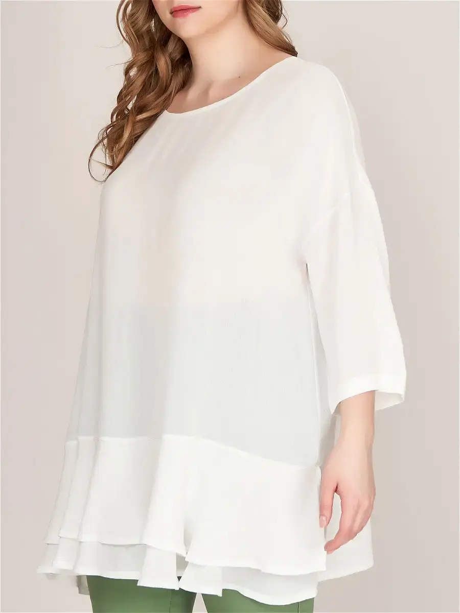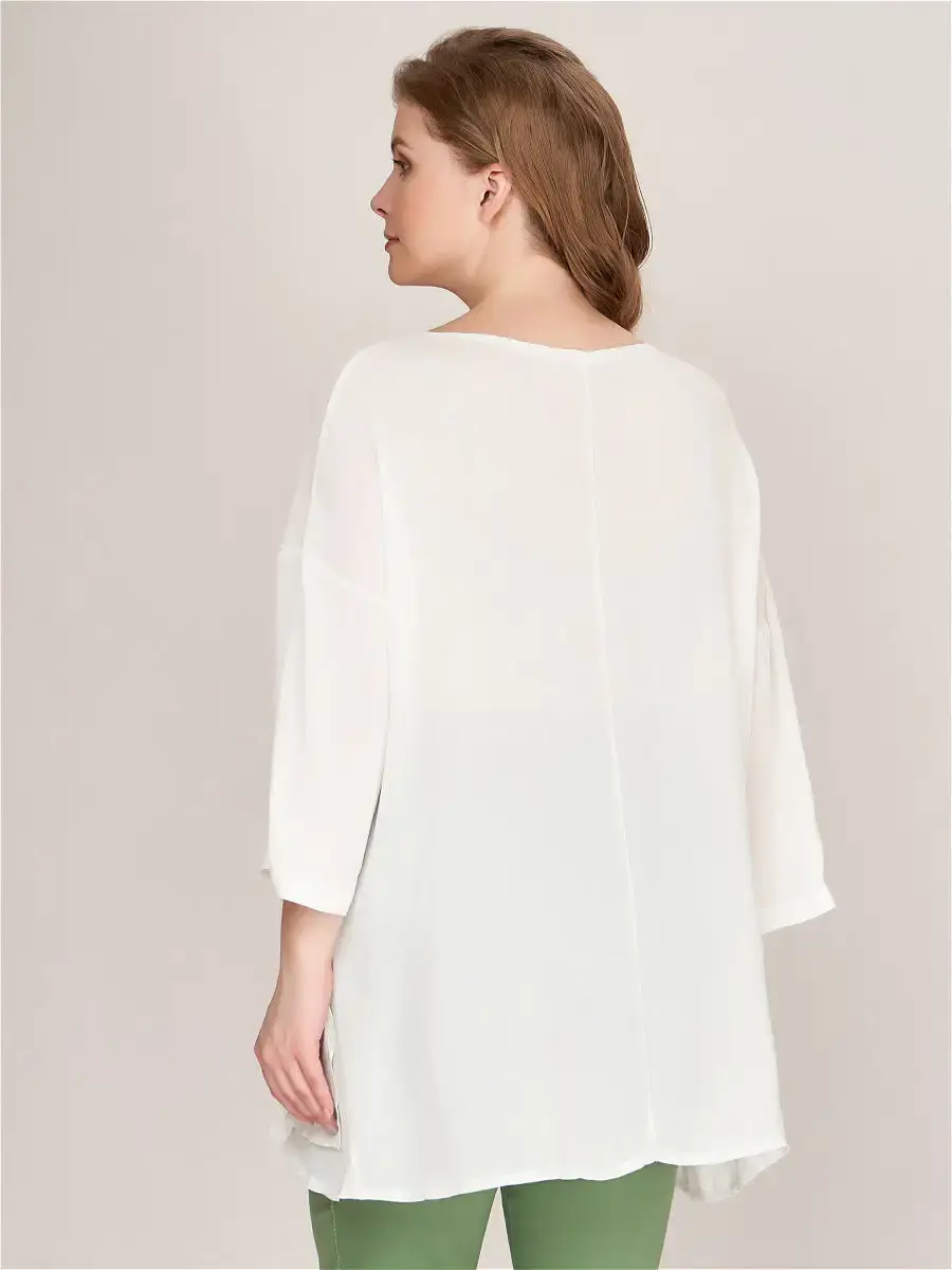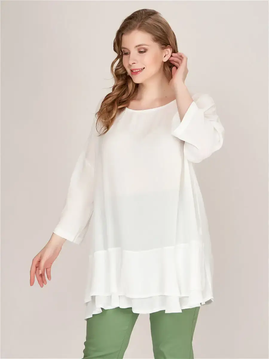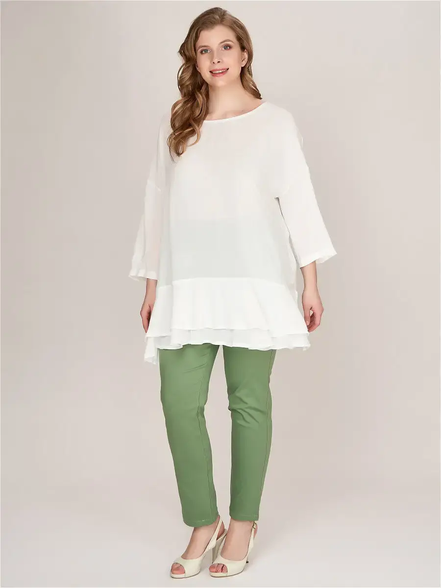 Стильная блуза-туника из хлопка, с округлым вырезом, спущенной проймой, воланами снизу спереди и прямого кроя спинкой сзади. Подойдет для романтичных нежных натур. Рукав 3/4 и открывающая ключицы горловина подчеркивают красоту запястий и линию шеи, свободный крой корректирует силуэт, делает линии фигуры плавными, воланы придают образу женственность. Длина изделия по спинке от 73см в р.48 до 78,5см в р.70, спущенный рукав длина плечевого шва от 23,7см в р.48 до 26,1см в р.70, длина самого рукава от 28,5см в р.48 до 26,1см в р.70.