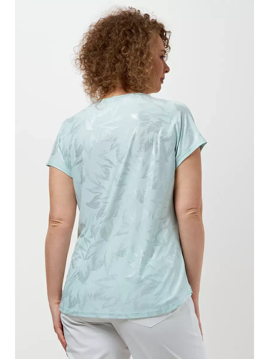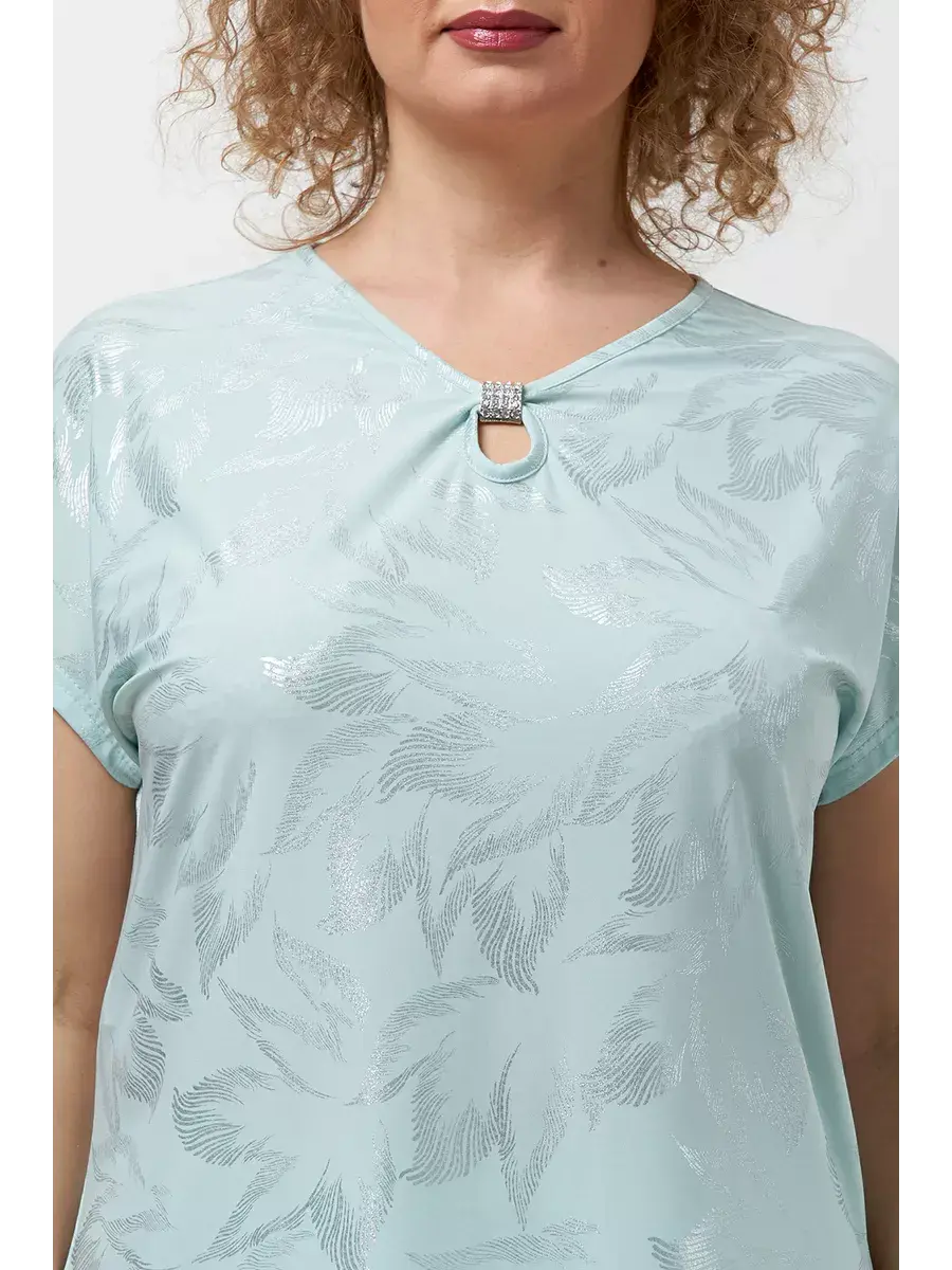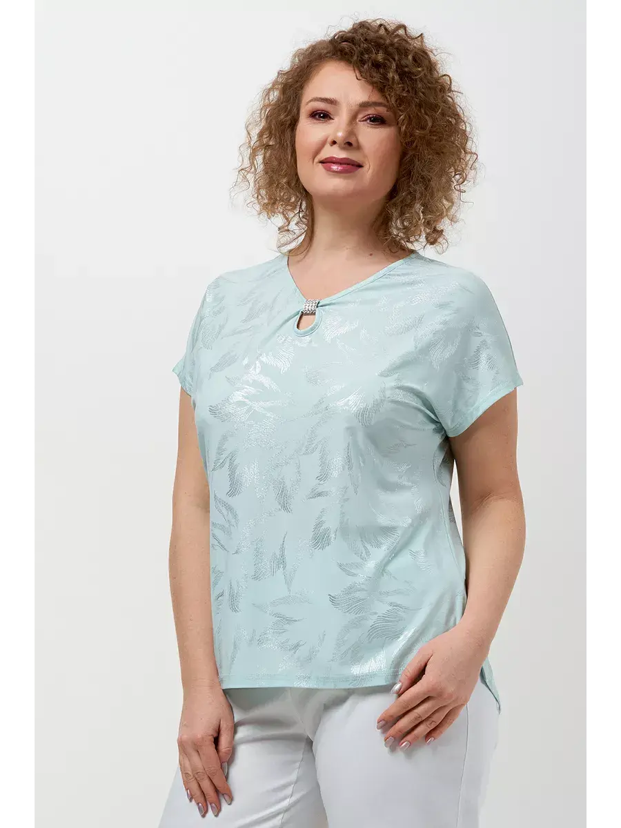 Элегантная женская блузка большого размера от бренда OLSI выполнена из трикотажа масло с фойлом. Нежная блузка из трикотажа холодок прекрасно дополнит Ваш гардероб в любом стиле. Блузка с коротким цельнокроенным рукавом, имеет фасон укороченной футболки. Трикотаж масло приятно холодит кожу в летнюю жару, не мнется и не требует глажки. Актуальный принт с мерцающим блеском освежает образ и позволяет носить блузку не только в офисном стиле, но и надеть ее на праздник, на корпоратив, на день рождения или на прогулку. Летняя свободная блузка легко комбинируется с любым типом низа - будь-то юбка, джинсы или брюки. Удобный крой женской блузки поможет скорректировать все недостатки и выгодно подчеркнуть достоинства фигуры. Длина изделия по спинке от 72,5см в р.52 до 77см в р.70. Весь наш ассортимент вы сможете увидеть кликнув на иконку OLSI! Топ женский , блуза больших размеров, блузка женская, летняя блуза легкая для полных