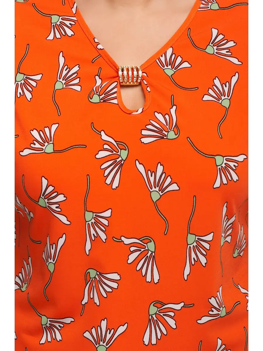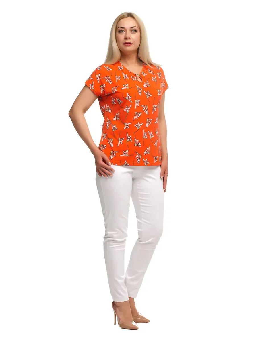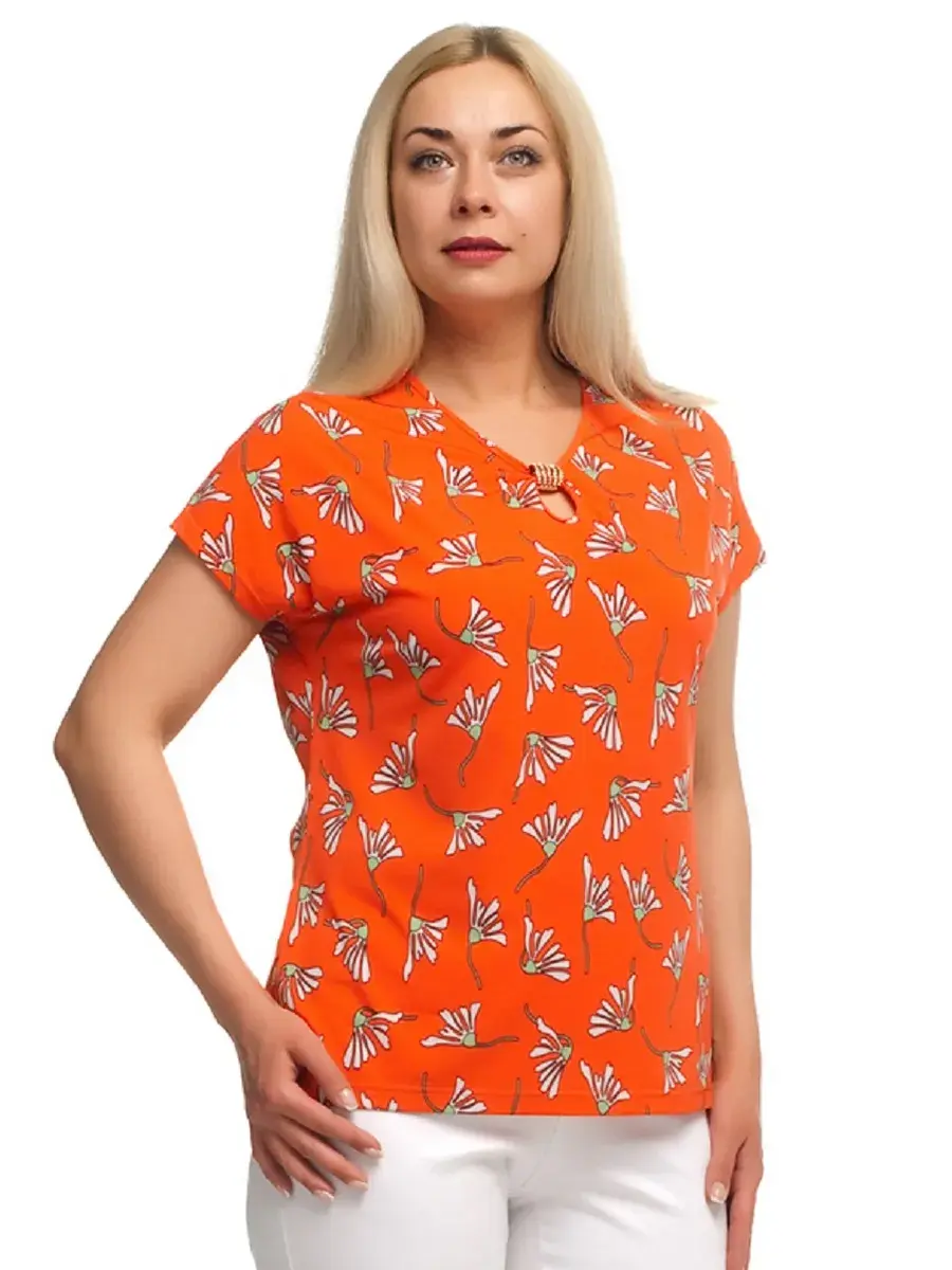 Стильная женская футболка pluse size с коротким рукавом. Выполнена из принтованного трикотажа масло. Спереди горловина декорирована украшением со стразами. Нежная блузка из ткани холодок прекрасно дополнит Ваш гардероб в любом стиле. Блузка с коротким цельнокроенным рукавом, имеет фасон укороченной футболки. Трикотаж масло приятно холодит кожу в летнюю жару, не мнется и не требует глажки. Удобный крой женской блузки поможет скорректировать все недостатки и выгодно подчеркнуть достоинства фигуры. Длина футболки по спинке от 73,5см в 48 размере до 79 см в 70 размере.