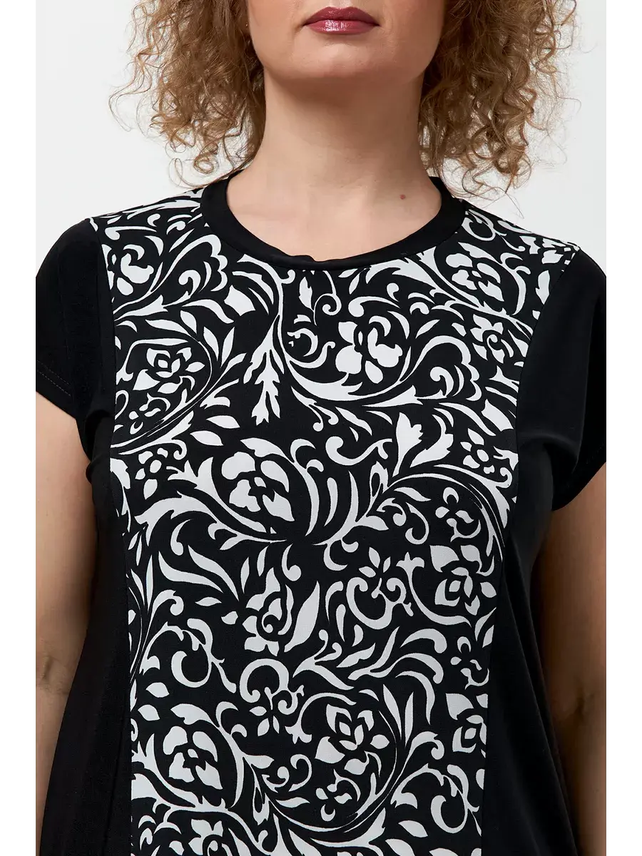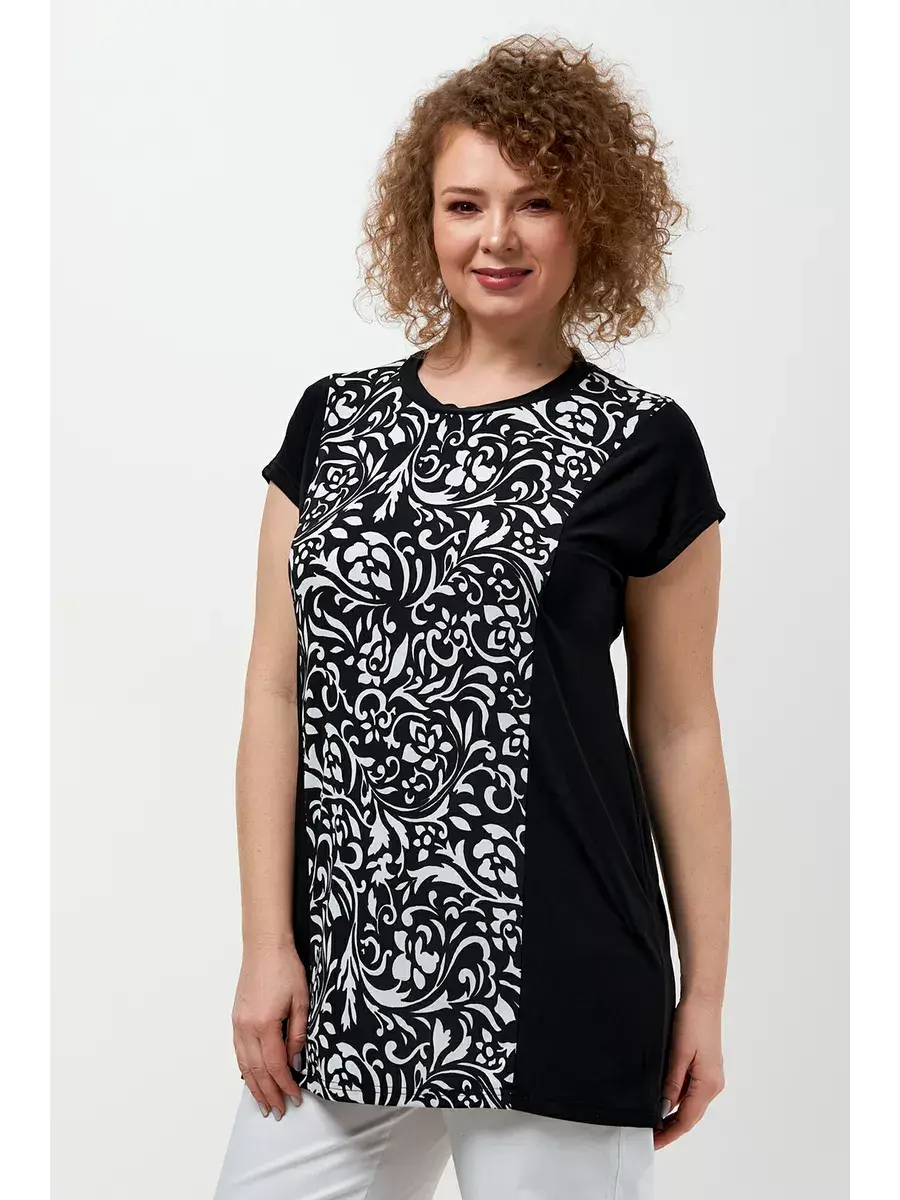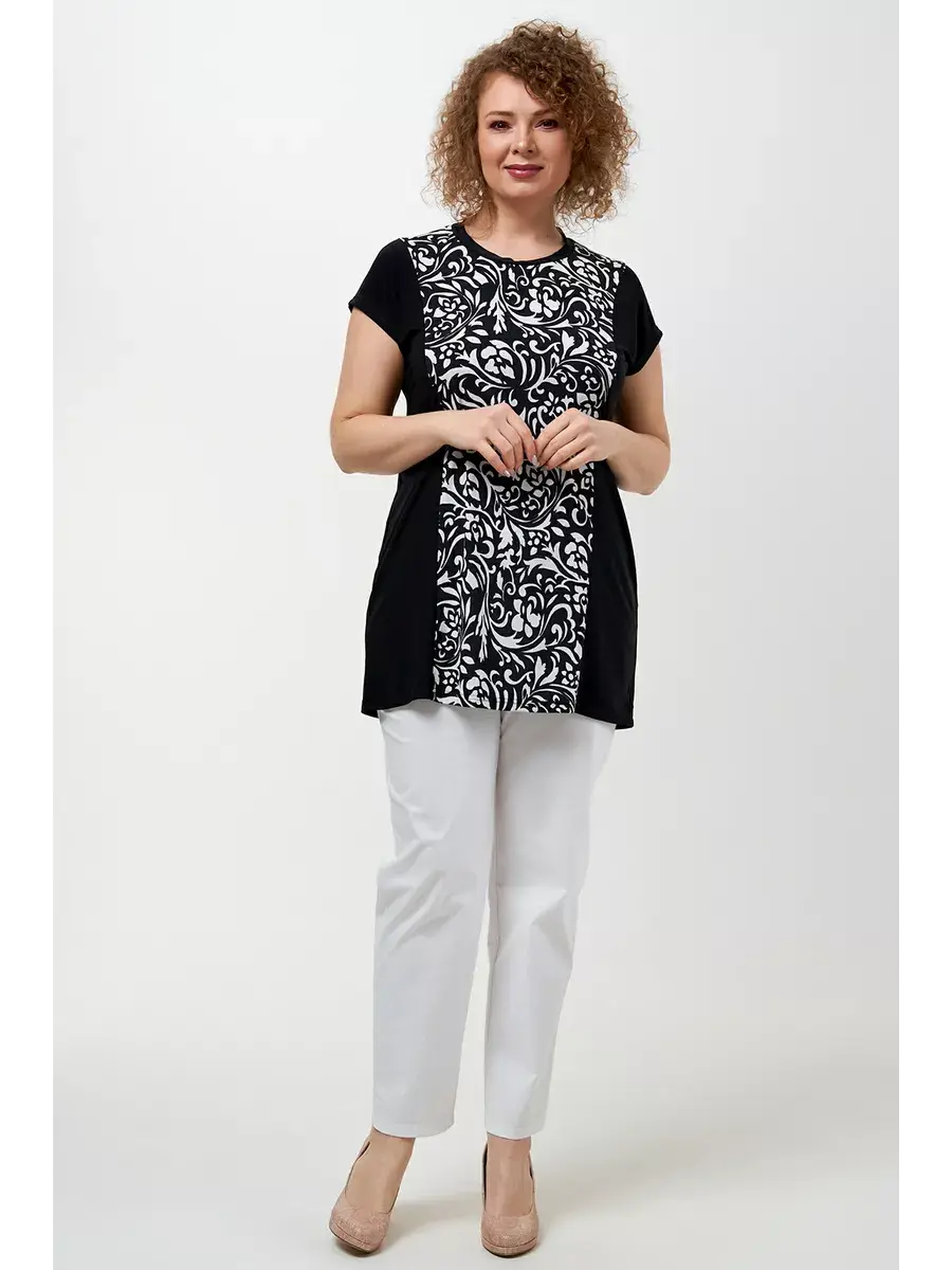 Лёгкий женский топ больших размеров, выполненный из трикотажной ткани масло. Блузка женская по типу футболки с коротким рукавом, очень удобна в носке и у уходе - не мнется, не требует глажки, запимает мало места. Длина по спинке во всех размерах 85см. Блуза женская, футболка больших размеров, футболка удлиненная, туника прямая летняя, футболка для полных женщин