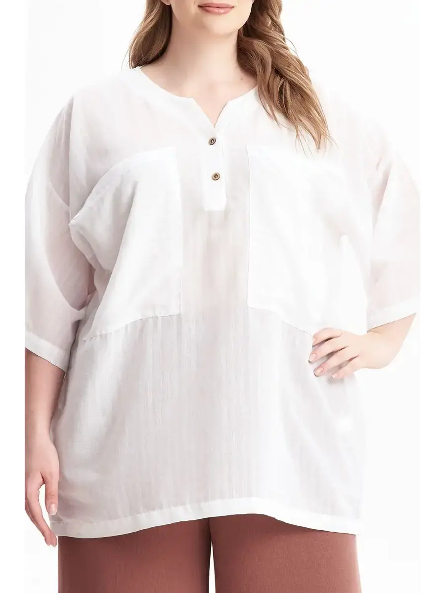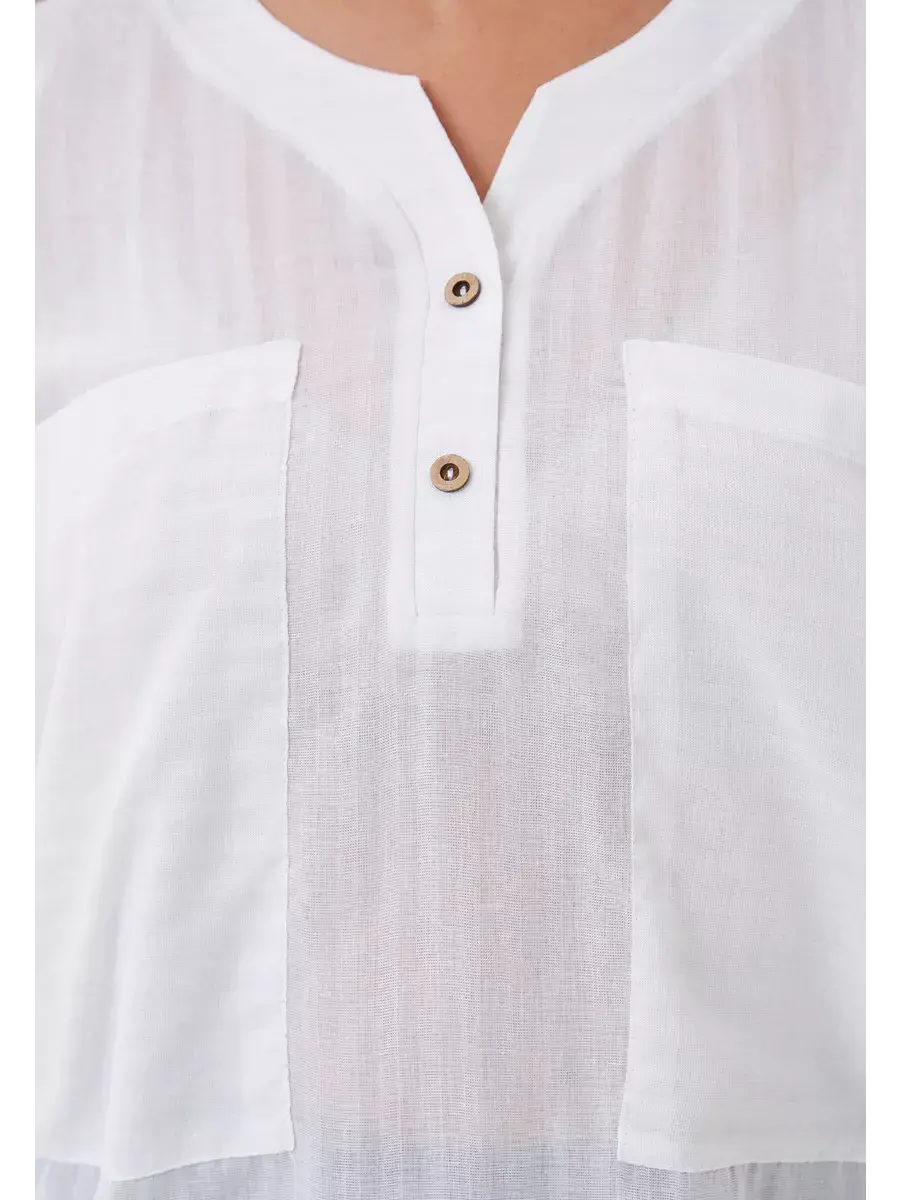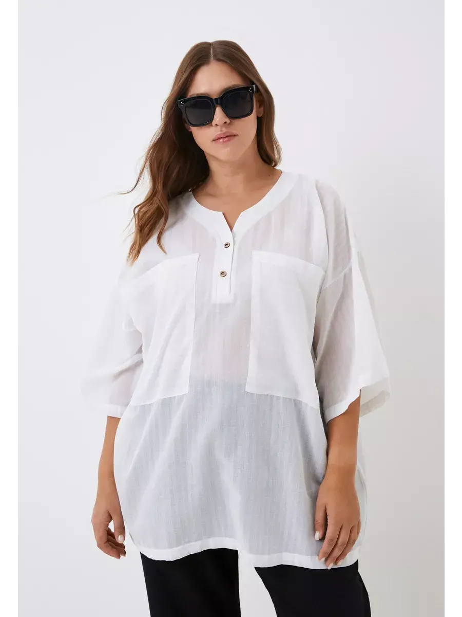 Женская блузка больших размеров свободного кроя бренда OLSI выполнена из тонкого полупрозрачного хлопка в полоску, с карманами на груди. Длина рукава чуть ниже локтя. Блузка будет незаменима на отдыхе как пляжная туника на купальник.