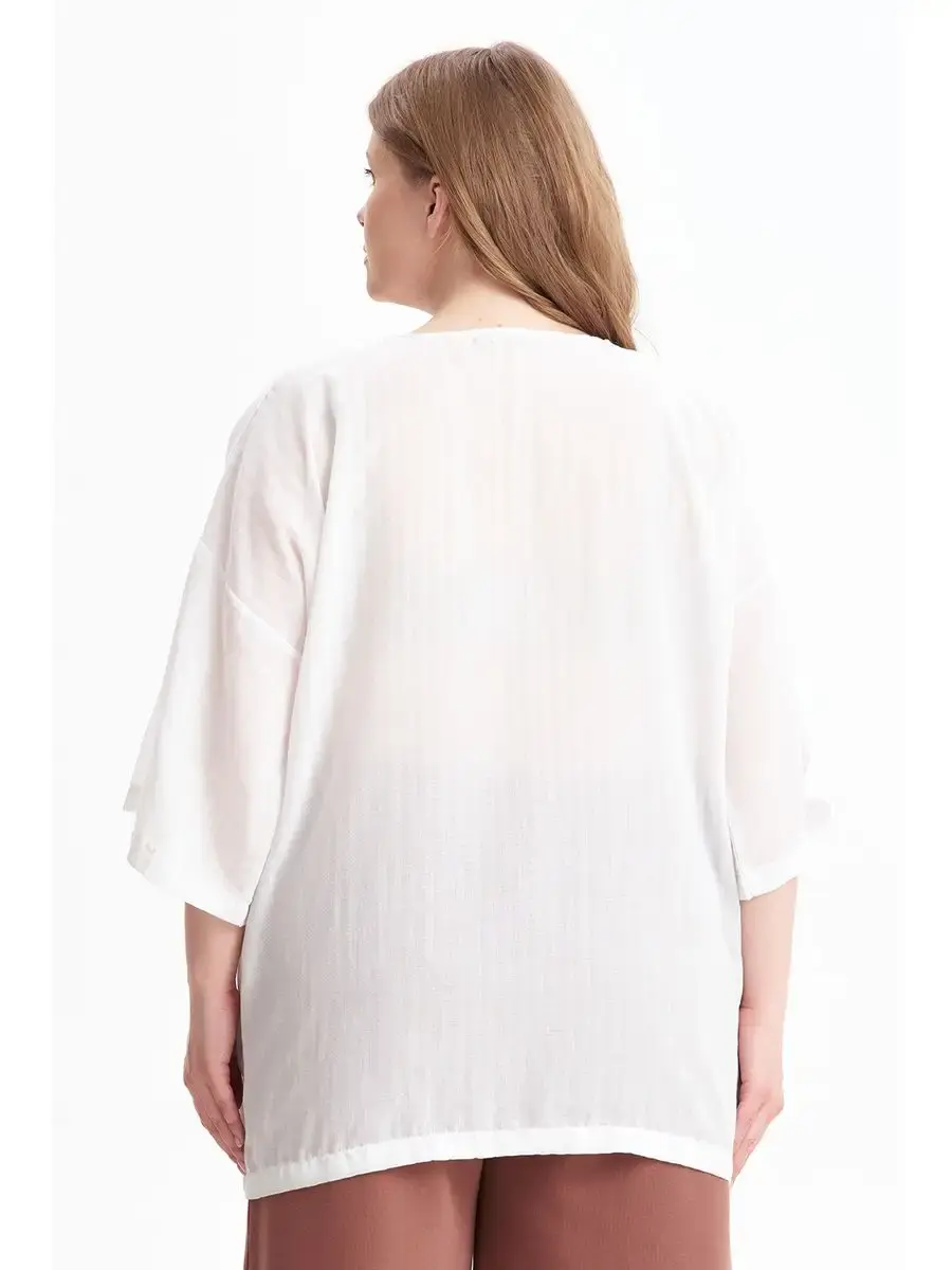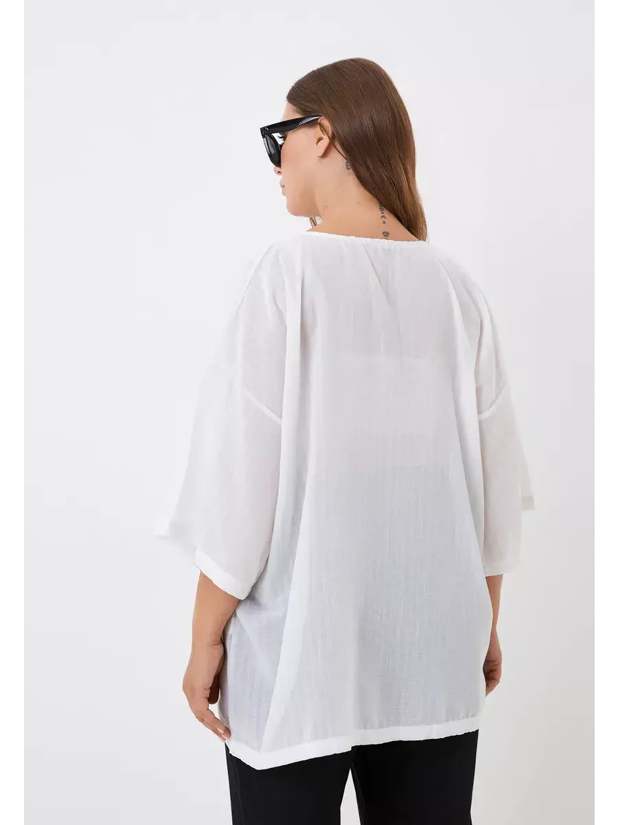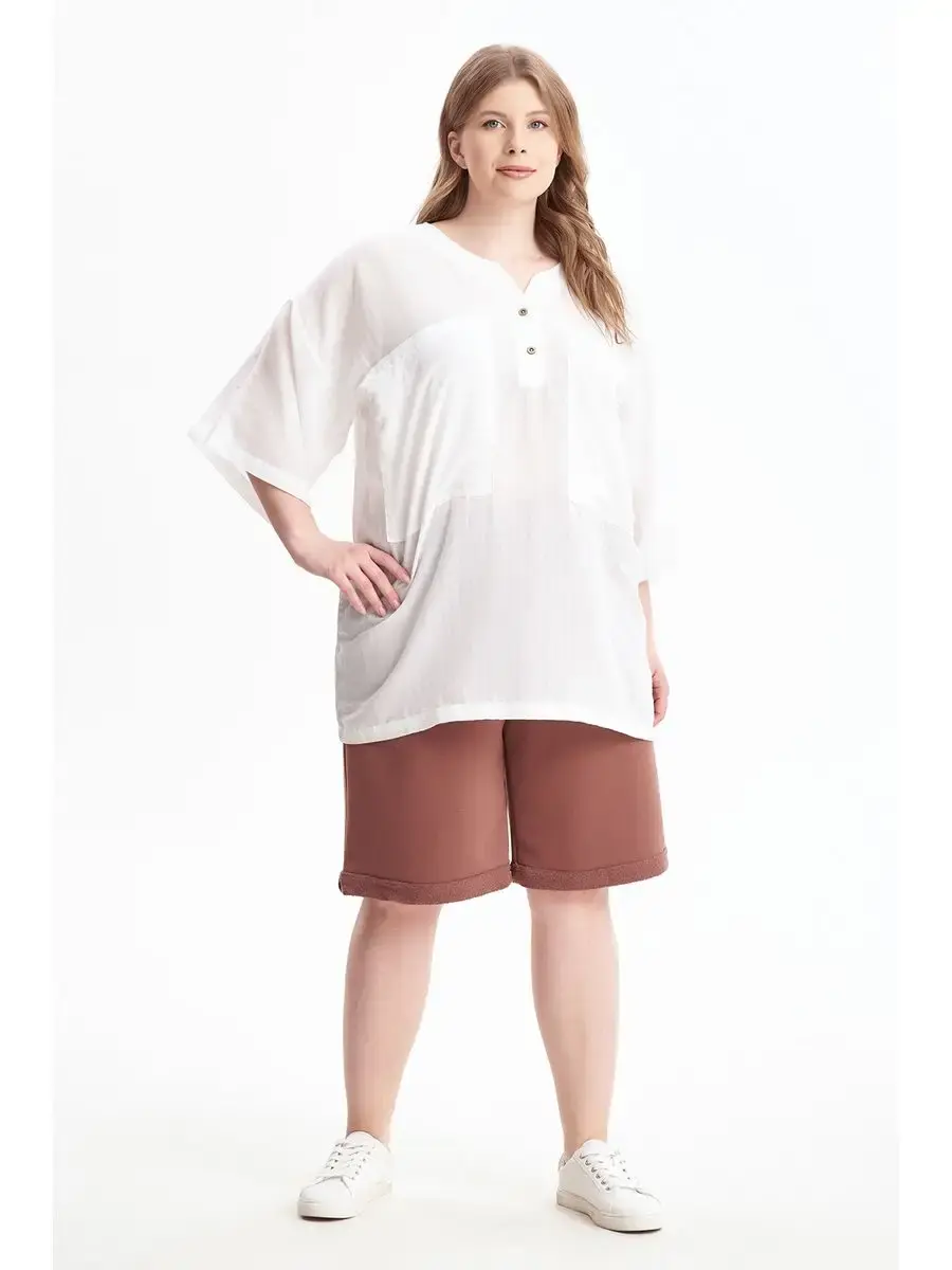 Женская блузка больших размеров свободного кроя бренда OLSI выполнена из тонкого полупрозрачного хлопка в полоску, с карманами на груди. Длина рукава чуть ниже локтя. Блузка будет незаменима на отдыхе как пляжная туника на купальник.