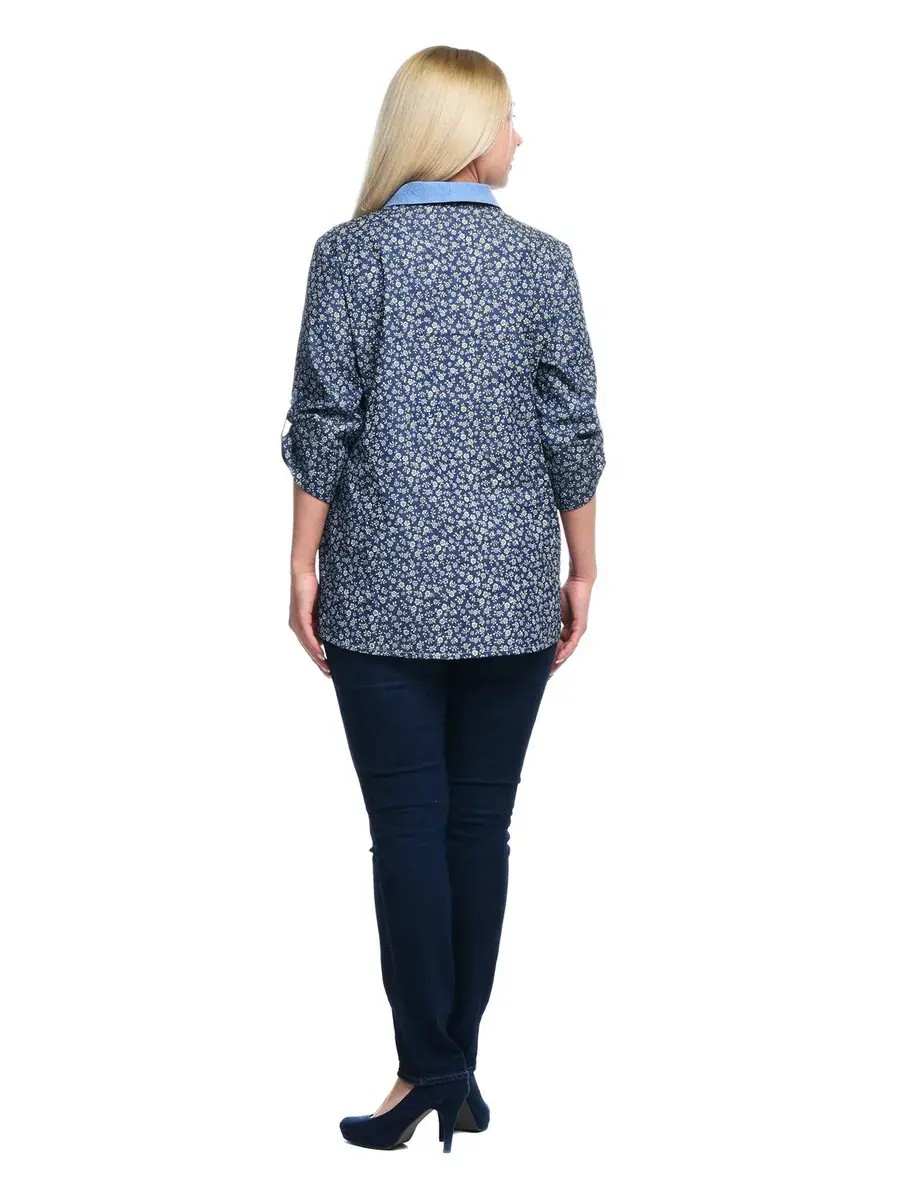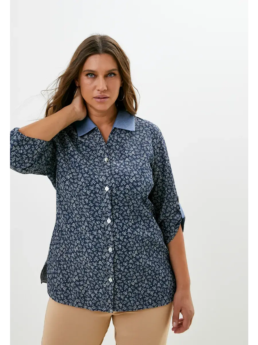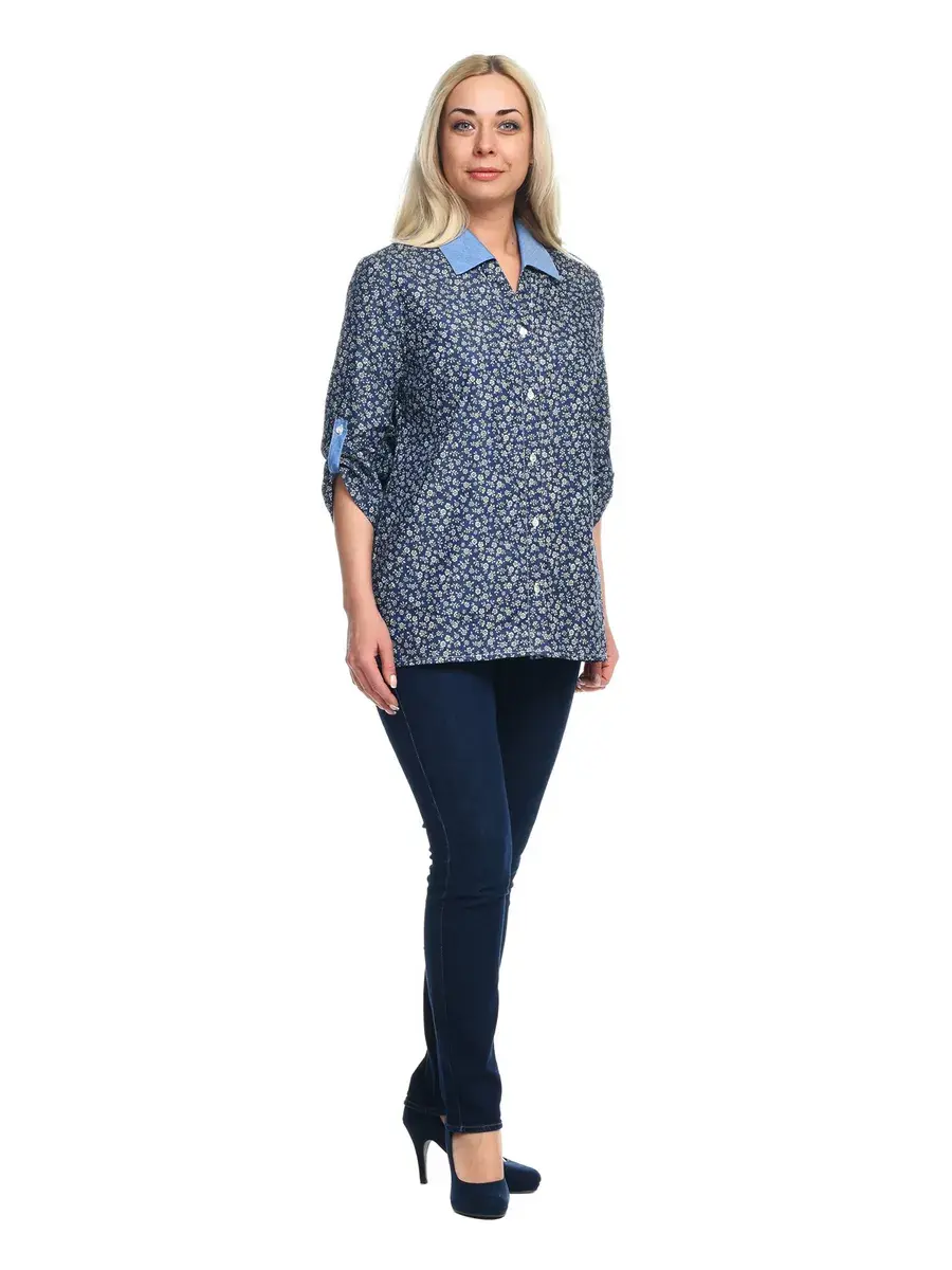 Стильная блузка-рубашка из хлопка с нежным цветочным принтом, имитирующим деним отложным воротником, и патами на рукавах. Модель свободного кроя с V-образным вырезом на рубашечной застежке. Классическое сочетание мелкого цветочного принта в паре с денимом, добавляет образу женственности, романтичности, и оттенок дерзости. Женщина любой комплекции в этой блузке будет выглядеть моложе и стройнее. Длина рукава 45см.