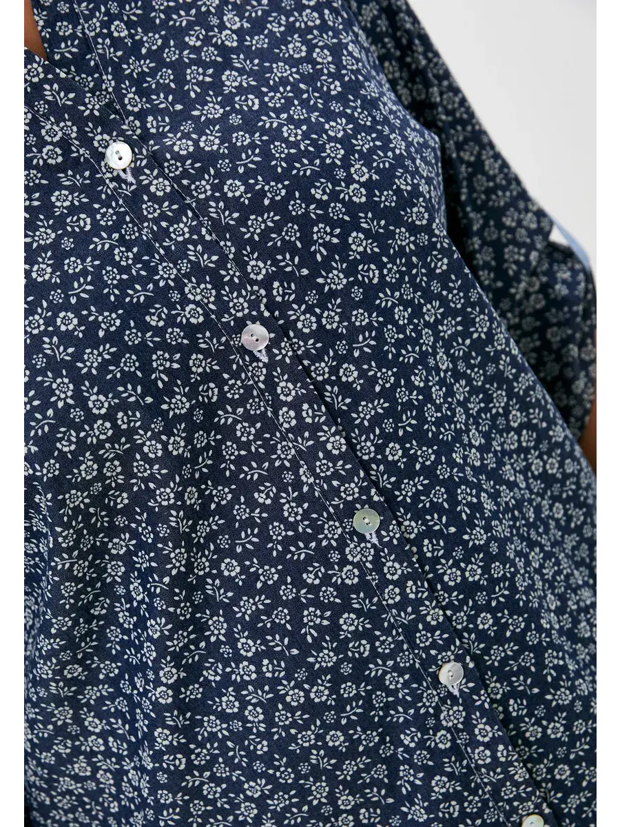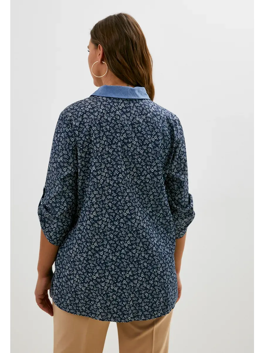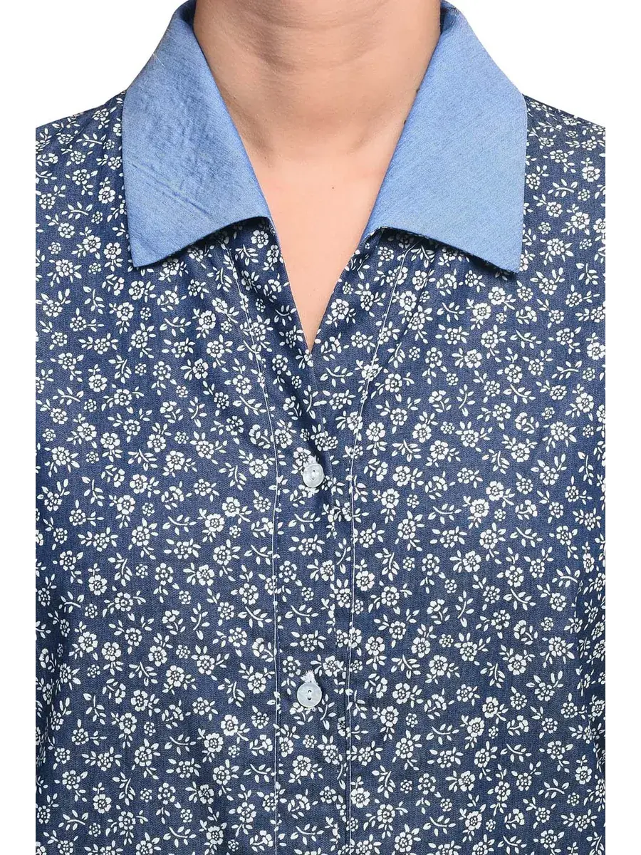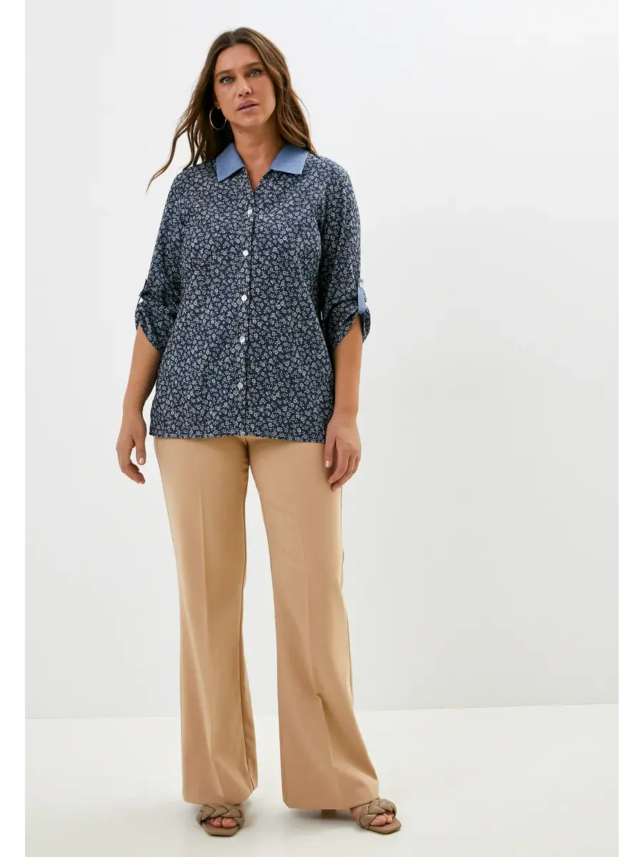 Стильная блузка-рубашка из хлопка с нежным цветочным принтом, имитирующим деним отложным воротником, и патами на рукавах. Модель свободного кроя с V-образным вырезом на рубашечной застежке. Классическое сочетание мелкого цветочного принта в паре с денимом, добавляет образу женственности, романтичности, и оттенок дерзости. Женщина любой комплекции в этой блузке будет выглядеть моложе и стройнее. Длина рукава 45см.