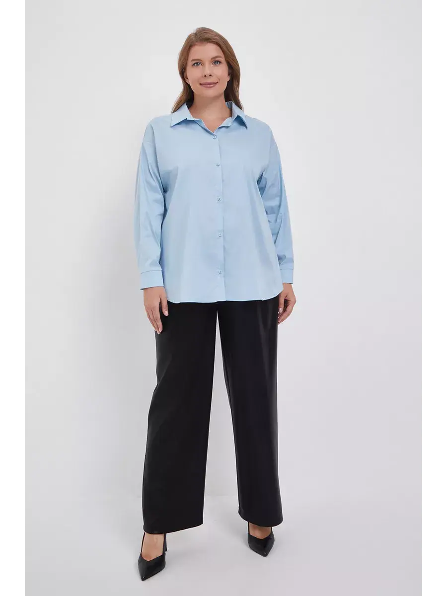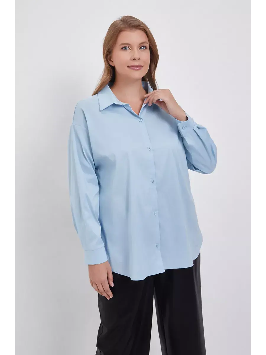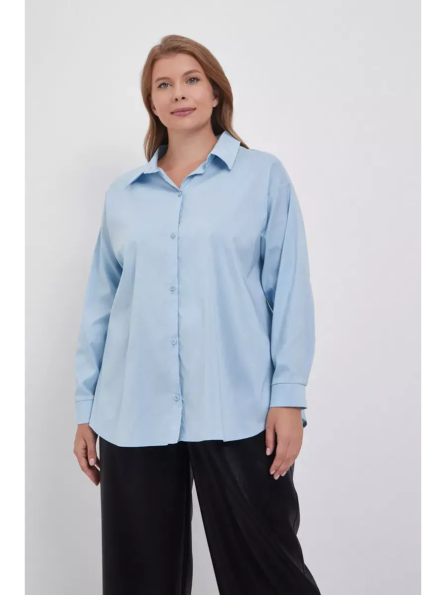 Женская блузка рубашка больших размеров от бренда OLSI прямого кроя с длинным рукавом, застёгивается на пуговицы, отложной воротник. Выполнена из хлопка с эластаном. Однотонная хлопковая рубашка свободного фасона - современная классика базового женского гардероба.