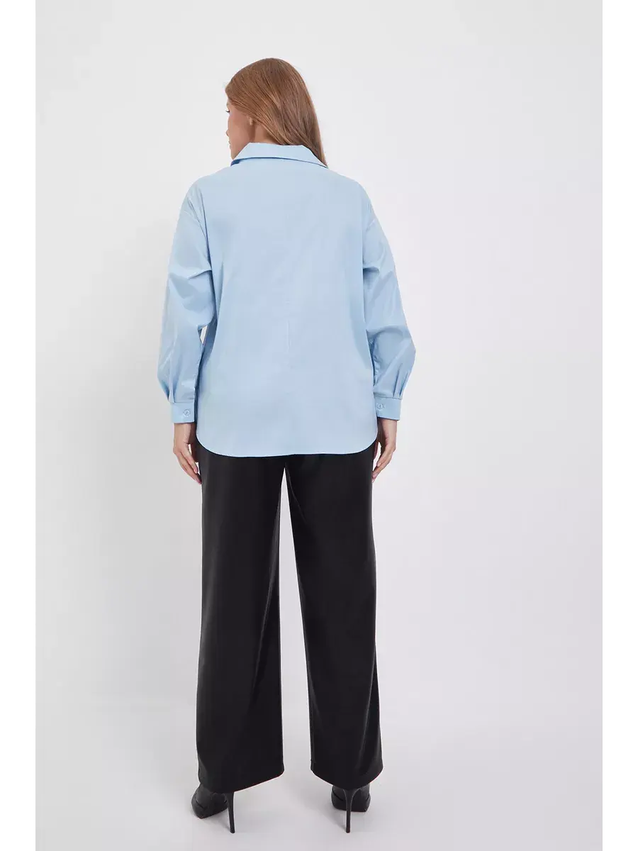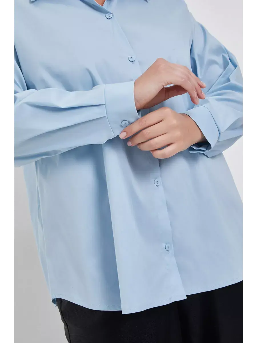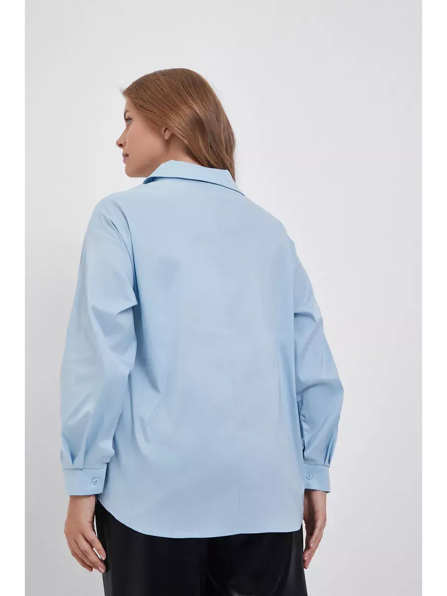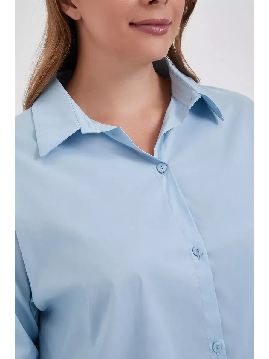 Женская блузка рубашка больших размеров от бренда OLSI прямого кроя с длинным рукавом, застёгивается на пуговицы, отложной воротник. Выполнена из хлопка с эластаном. Однотонная хлопковая рубашка свободного фасона - современная классика базового женского гардероба.